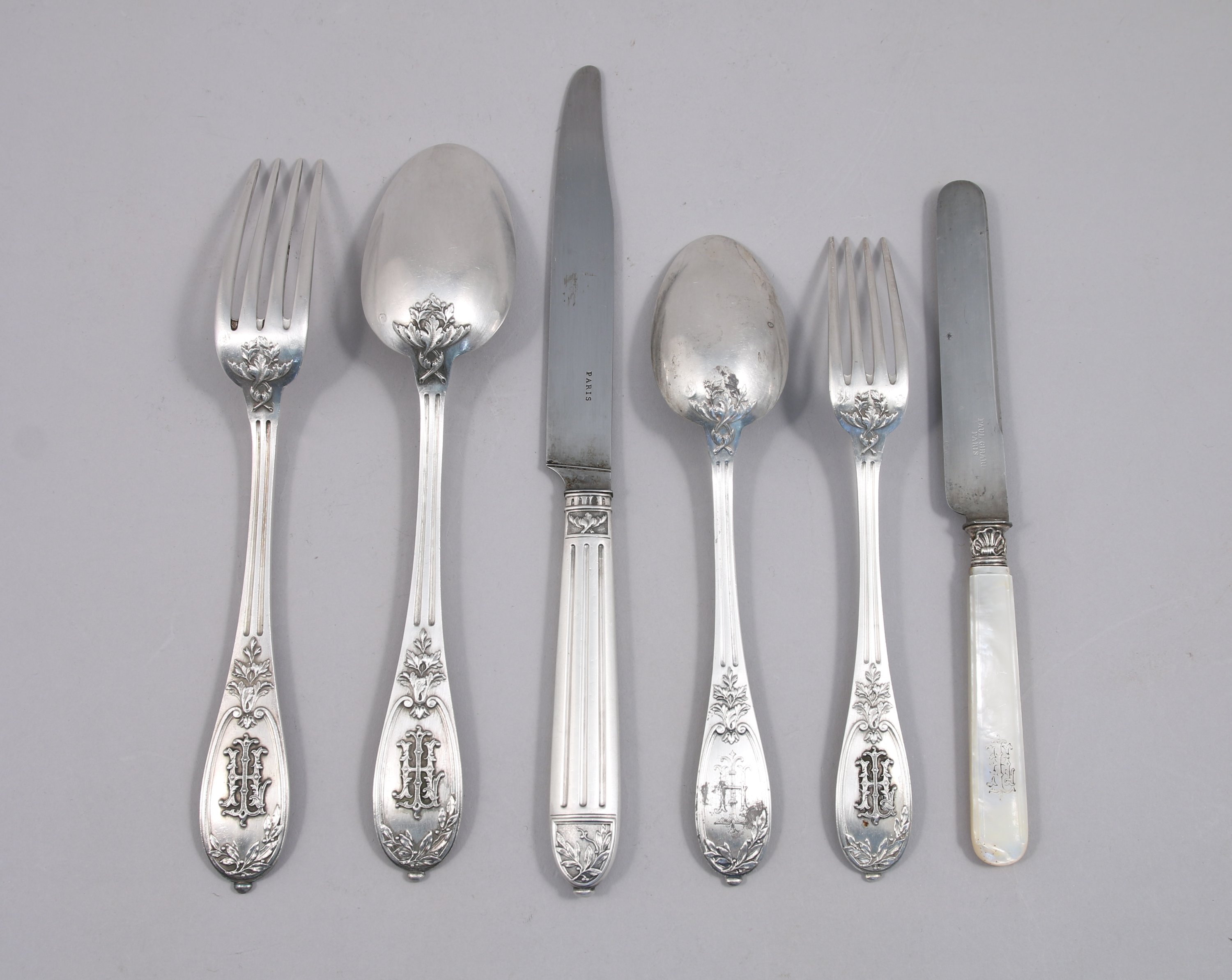 MÉNAGÈRE en argent de 136 pièces richement décorées de feuillages et fleurs, monogramées en applique "HL" comprenant :