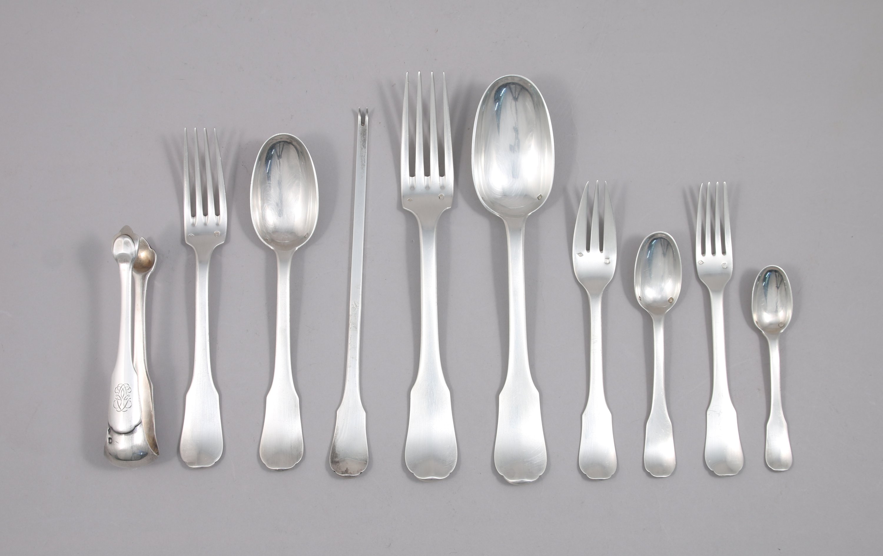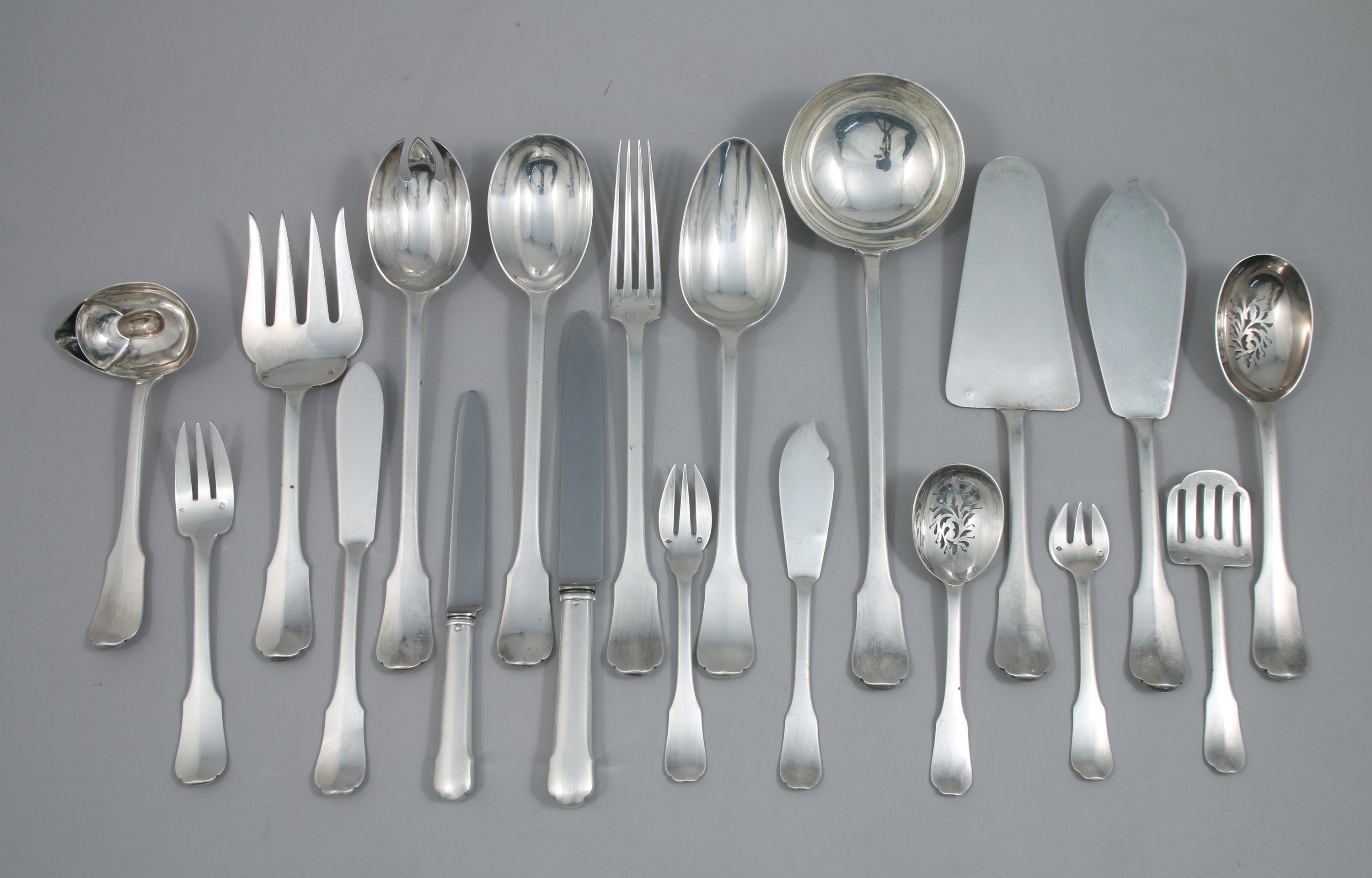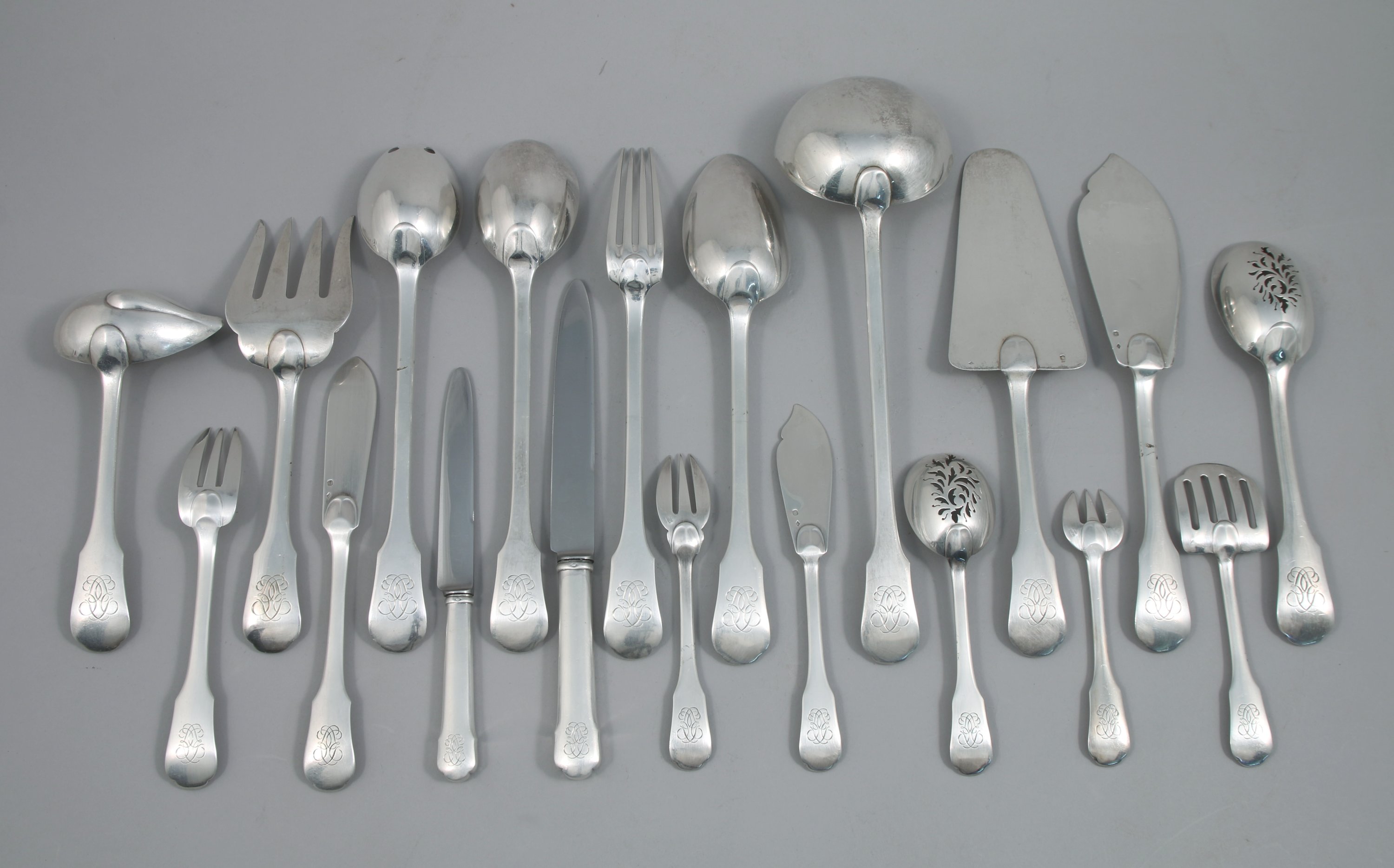 MÉNAGÈRE en argent, 195 PIÈCES, modèle uniplat. Les spatules monogrammées.
