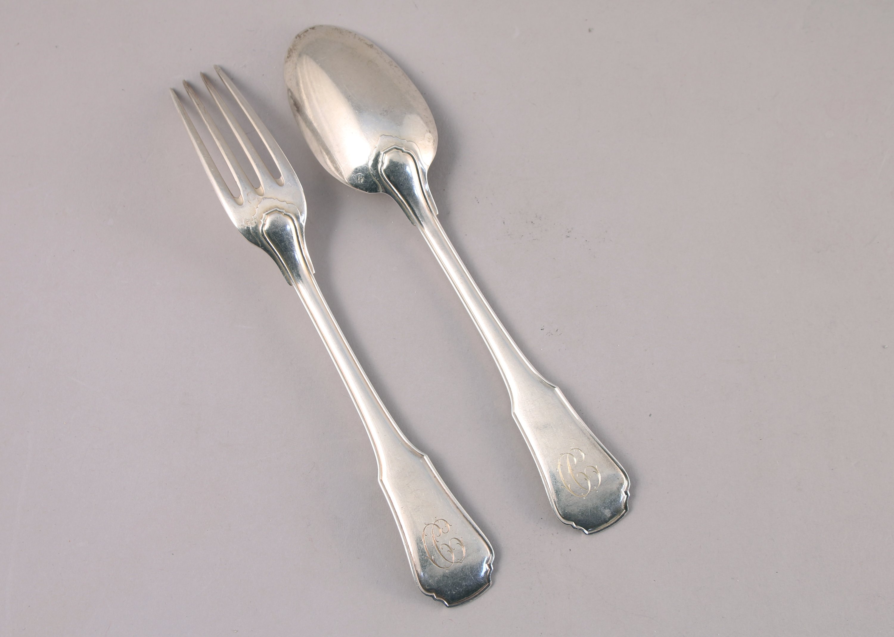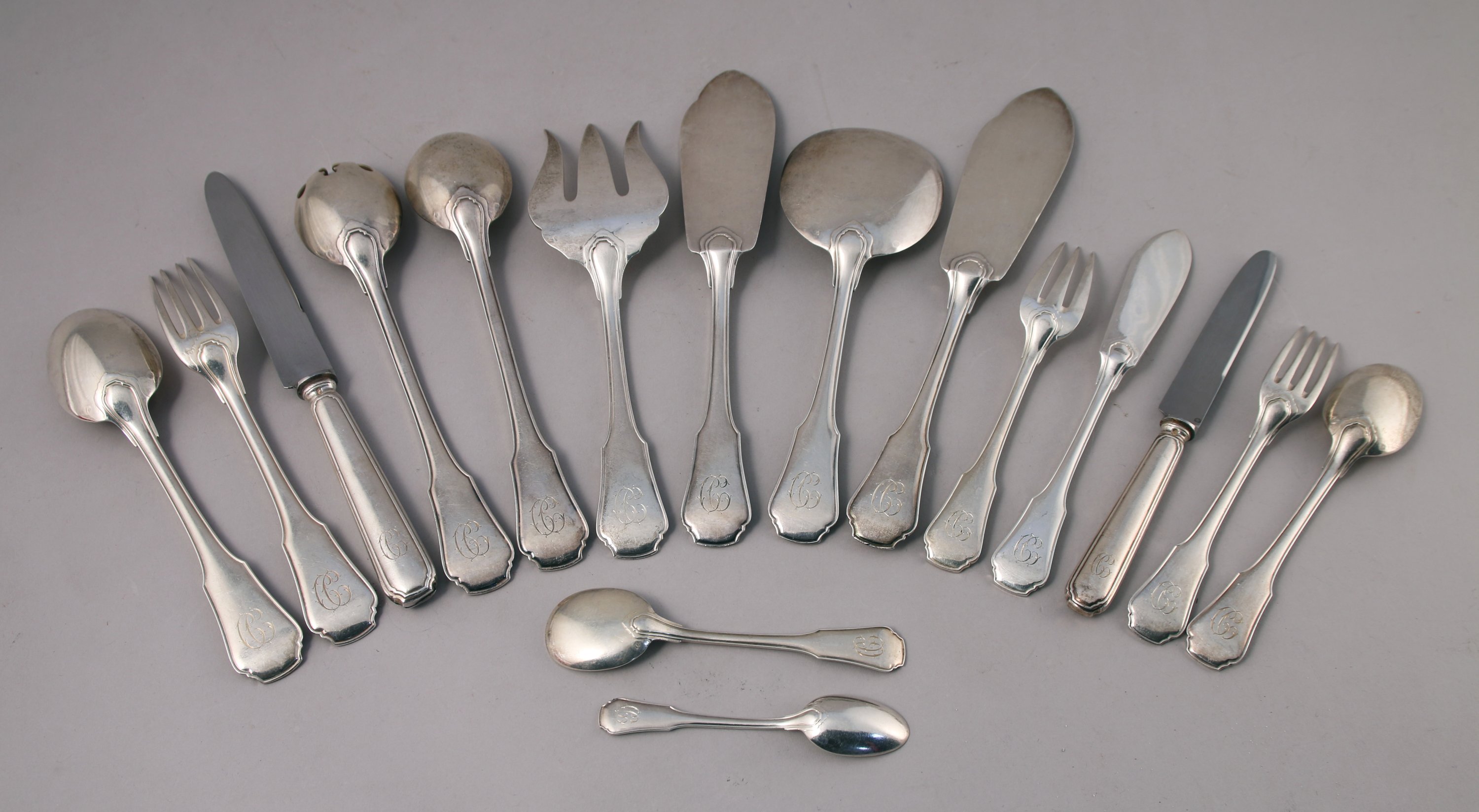 MÉNAGÈRE en argent de 118 pièces, modèle festonné filet contour monogrammé en lettres anglaises "CC" comprenant :
