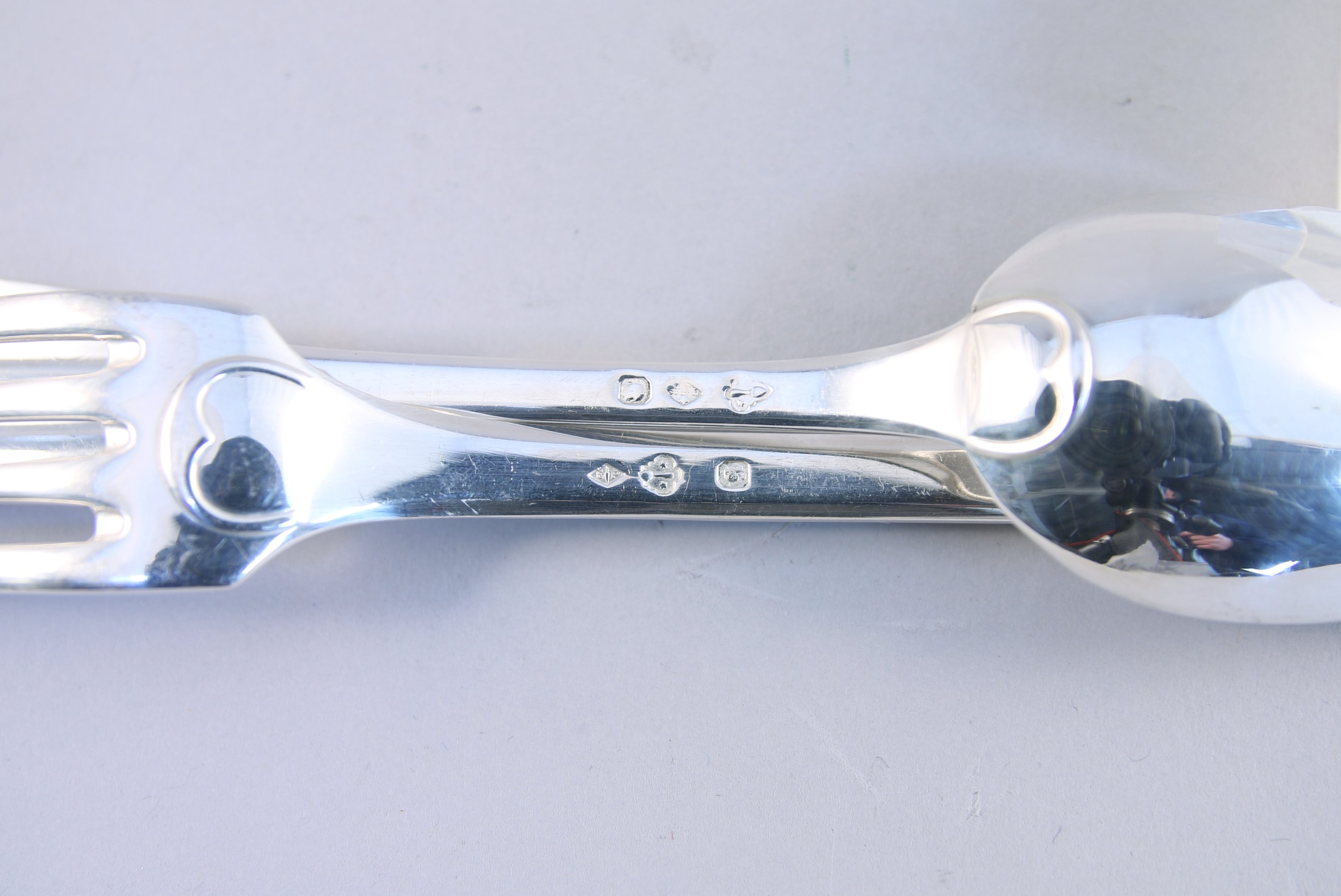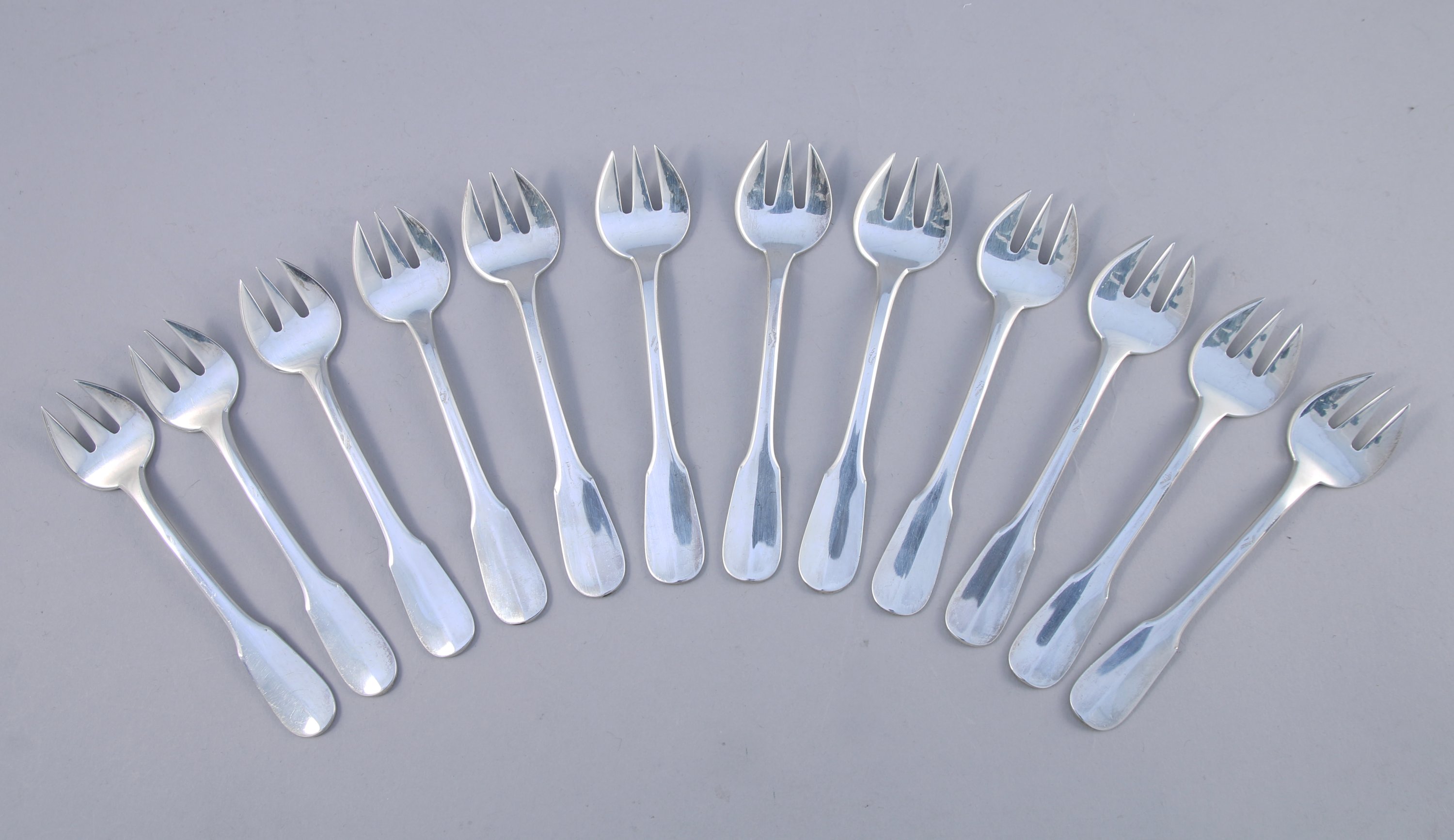 MÉNAGÈRE en argent, 41 PIÈCES, modèle uniplat. Elle se compose de 12 fourchettes, 12 cuillères à entremets, 12 fourchettes à huîtres, un couvert à salade, une pelle à tarte, une cuillère à crème et un couteau à fromage.