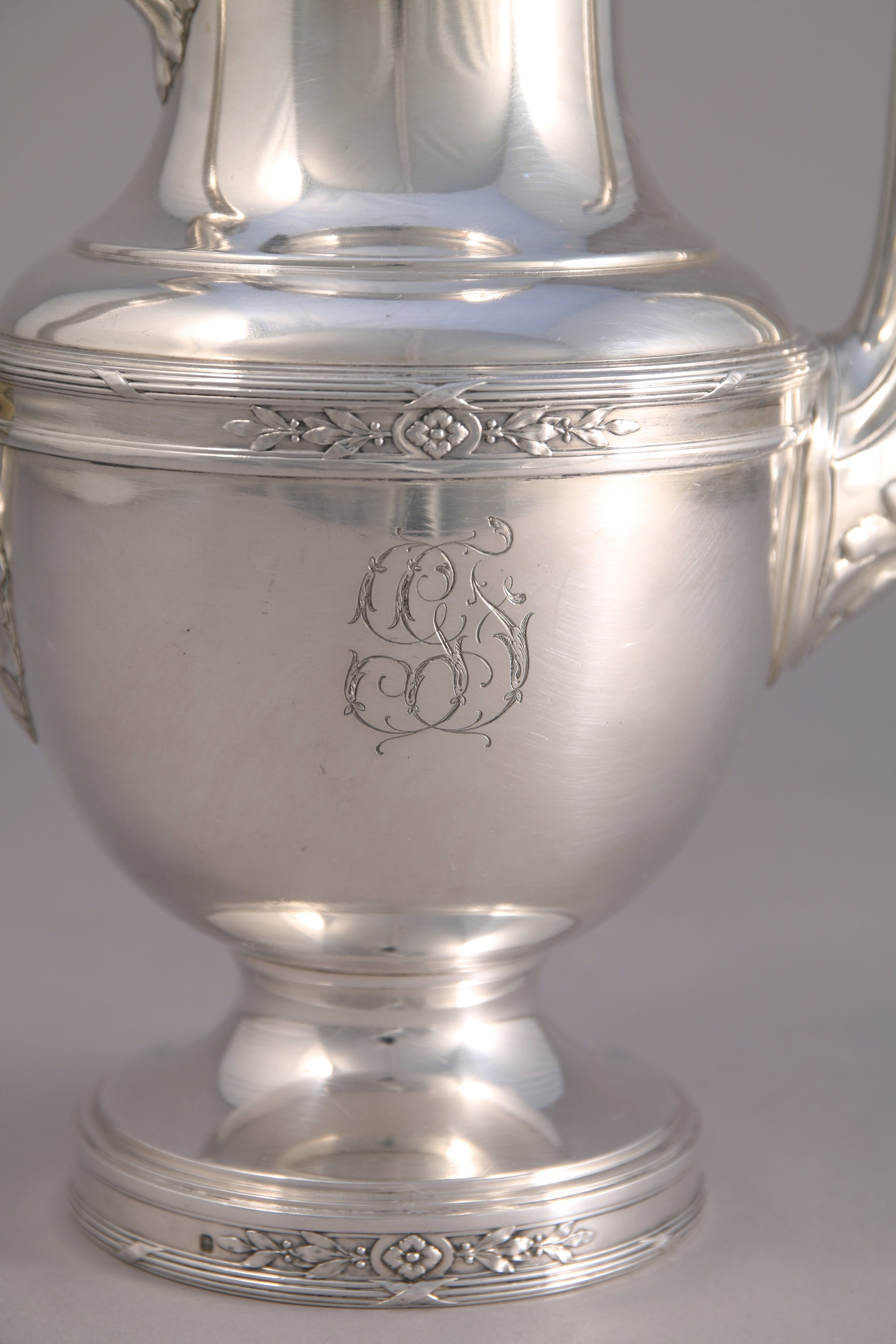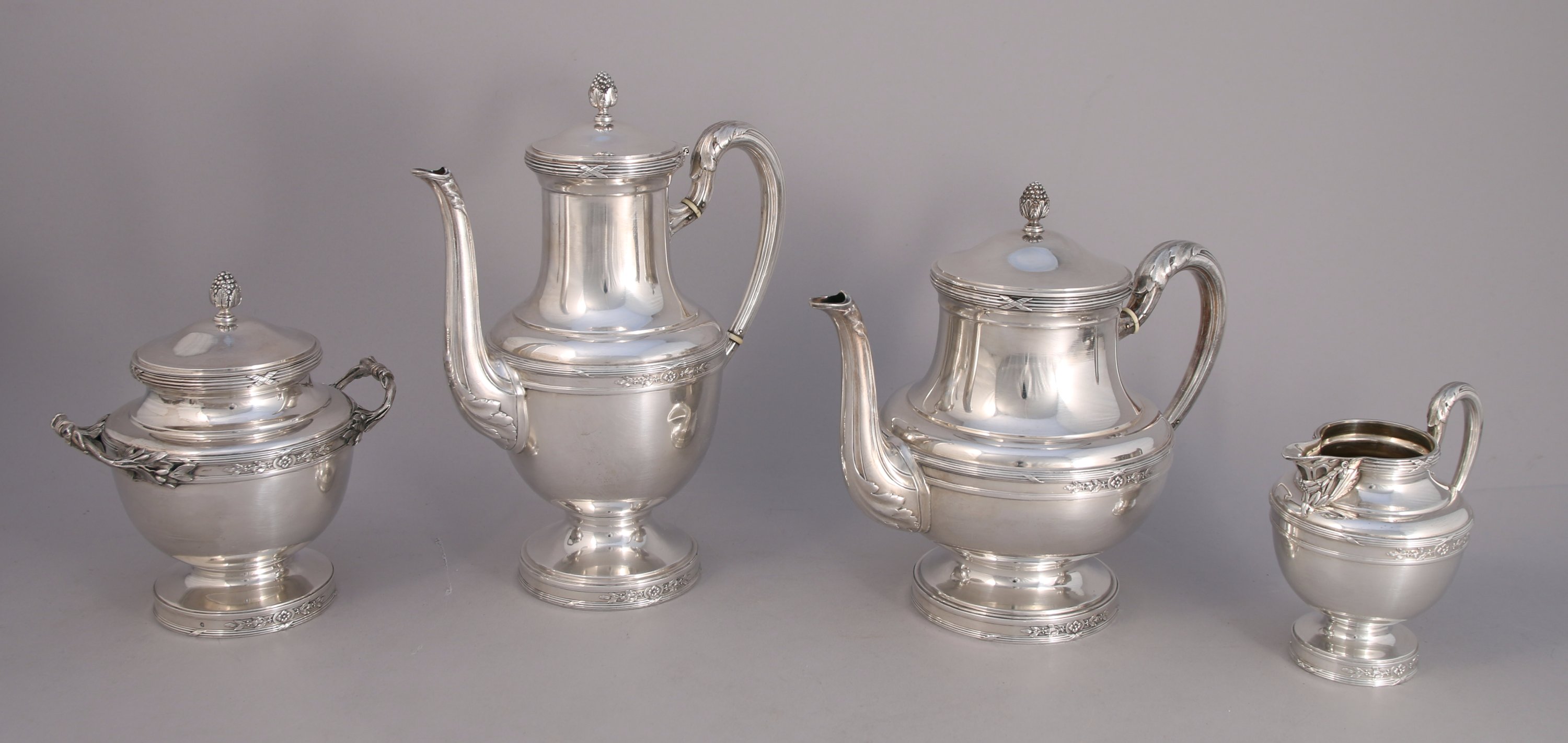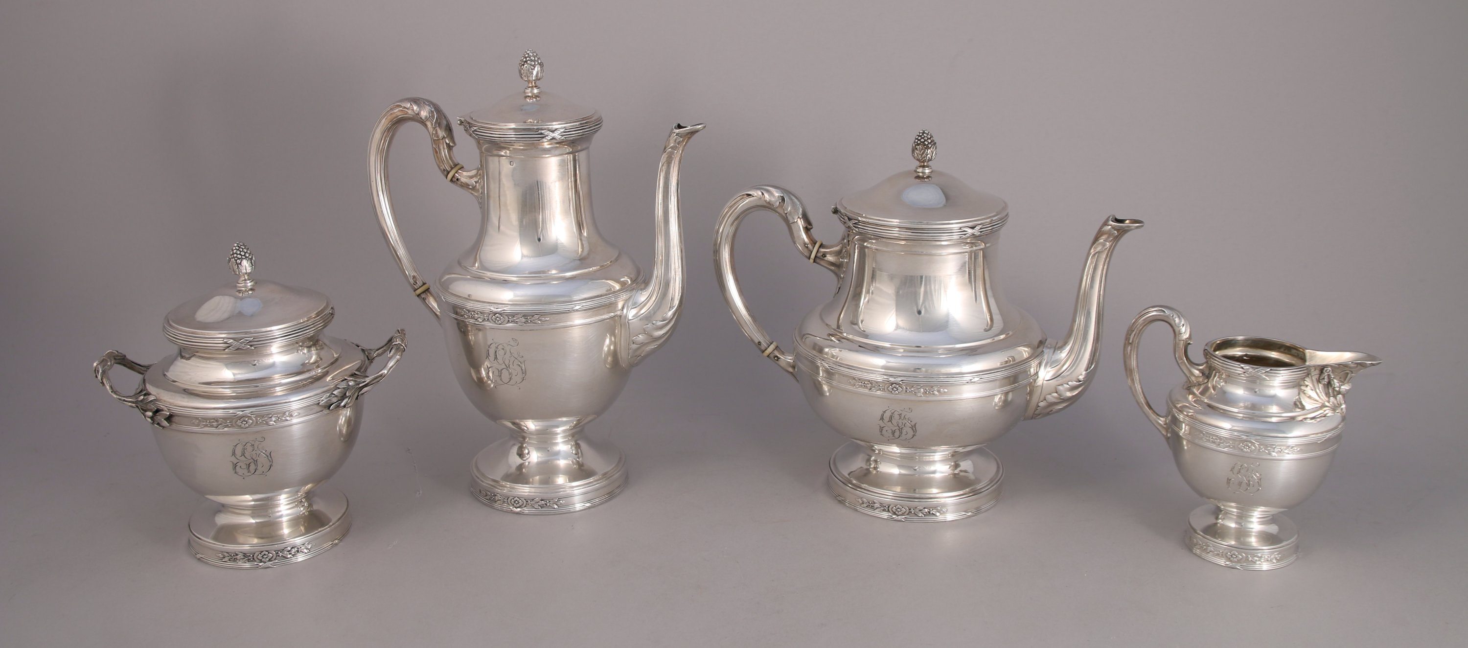 SERVICE à THÉ-CAFÉ en argent. Il se compose d'une théière, d'une cafetière, d'un sucrier et d'un pot-à-lait. Ils reçoivent un décor néoclassique tel que joncs rubannés et fleuron flanqué de rameaux de lauriers. Le corps monogrammé "GF". Les anses à canaux sont agrémentées de feuilles d'acanthe. Fretels en graine. Les quatre pièces reposent sur un piédouche. Intérieur vermeillé.
