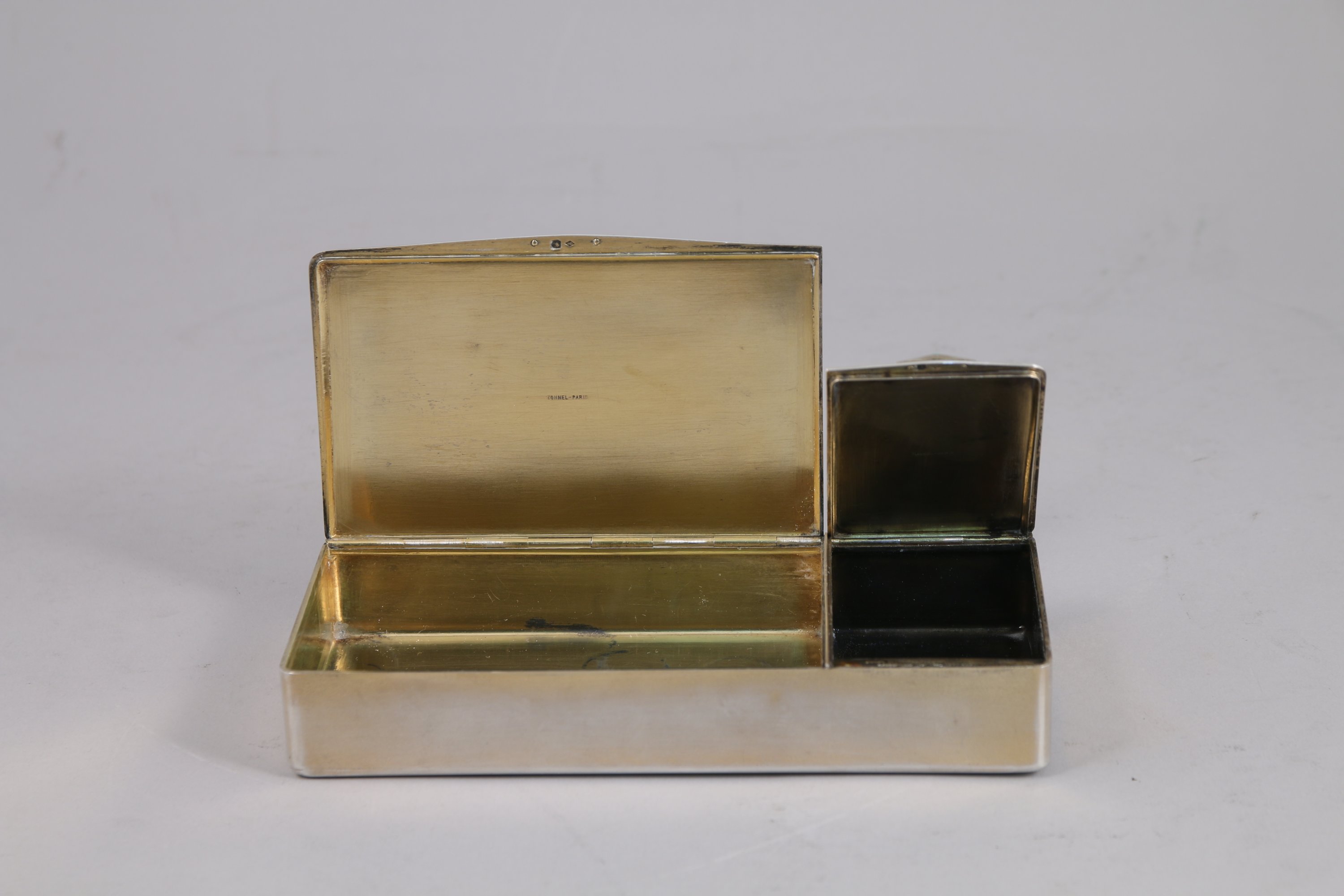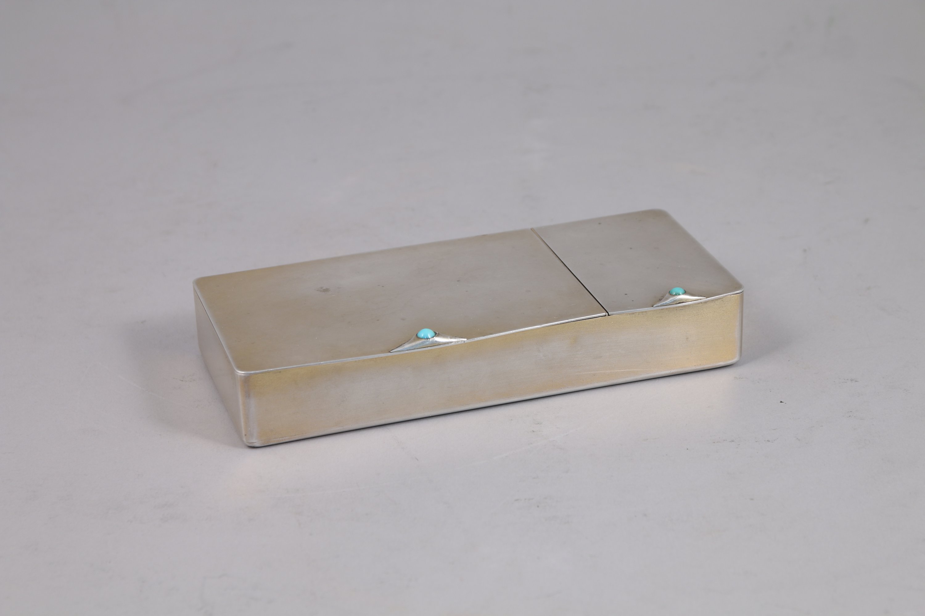 BOÎTE DE FUMEUR de forme rectangulaire en argent uni. Elle ouvre par deux couvercles à charnière en argent, l'un vermeillé pour les cigarettes, l'autre pour les allumettes. Appuis-pouce sertis d'un cabochon de turquoise. Signée TONNEL-PARIS.