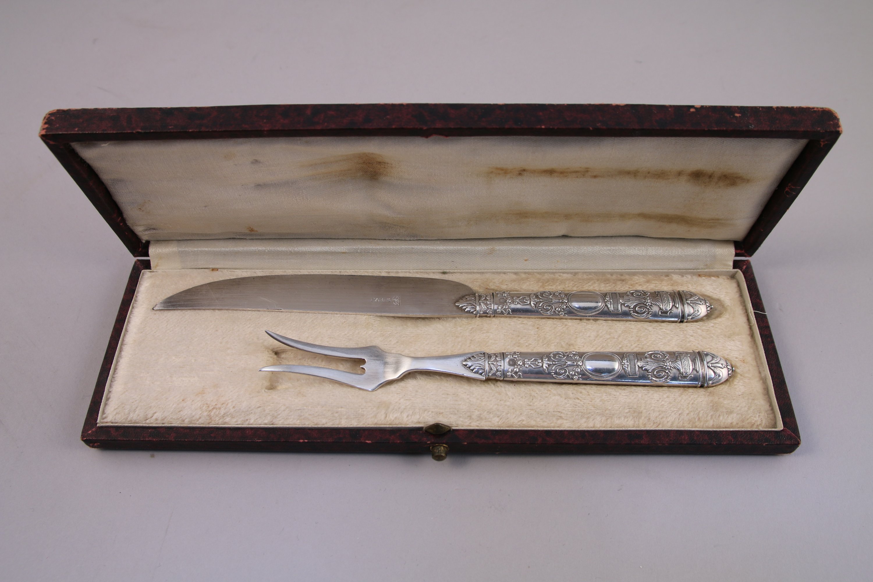 FOURCHETTE et COUTEAU au manche en argent fourré, de style fin XVIIIe dans un écrin.