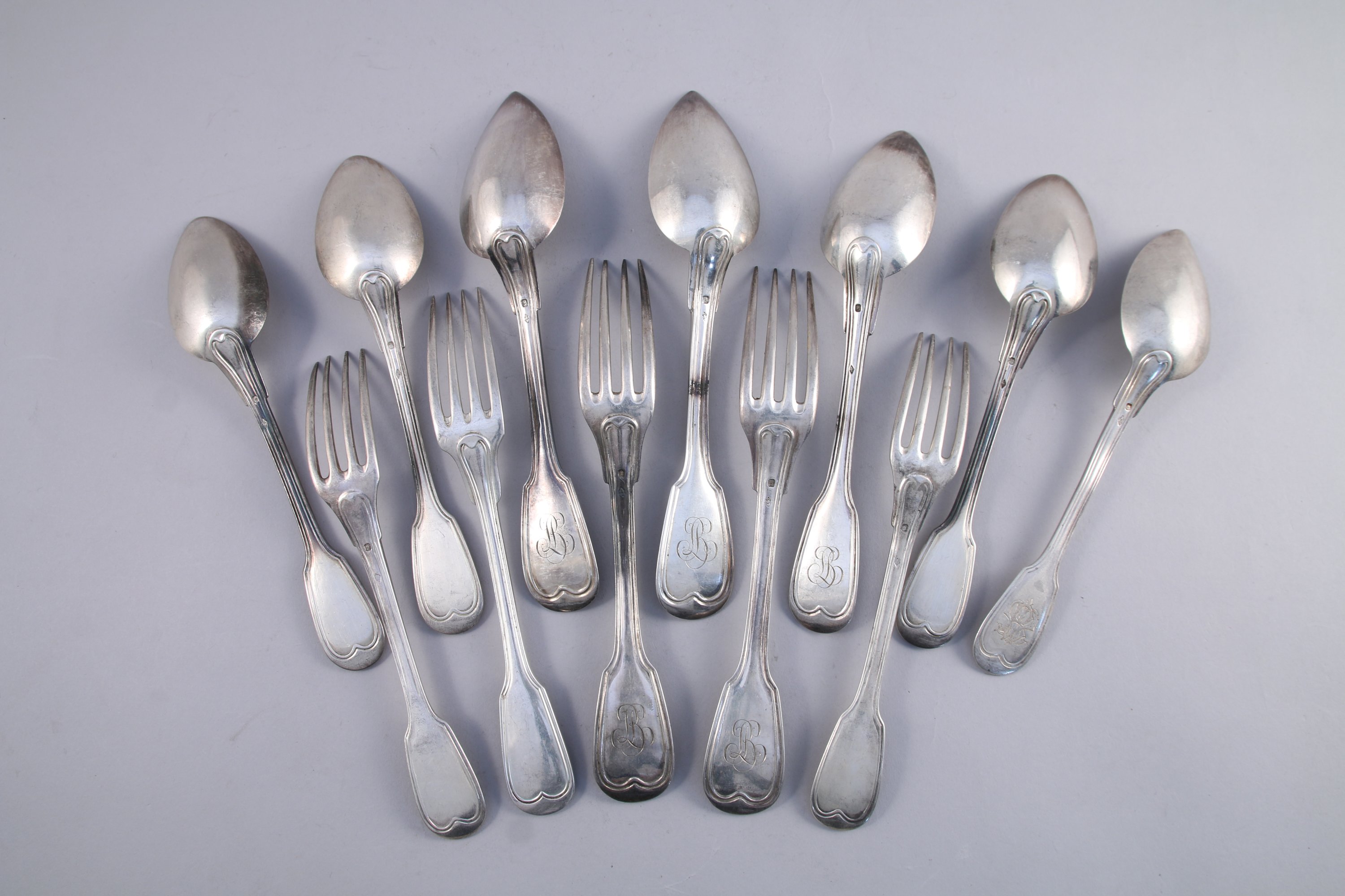 RÉUNION de 21 PIÈCES : 13 CUILLÈRES et HUIT FOURCHETTES en argent, modèle filet-contours :