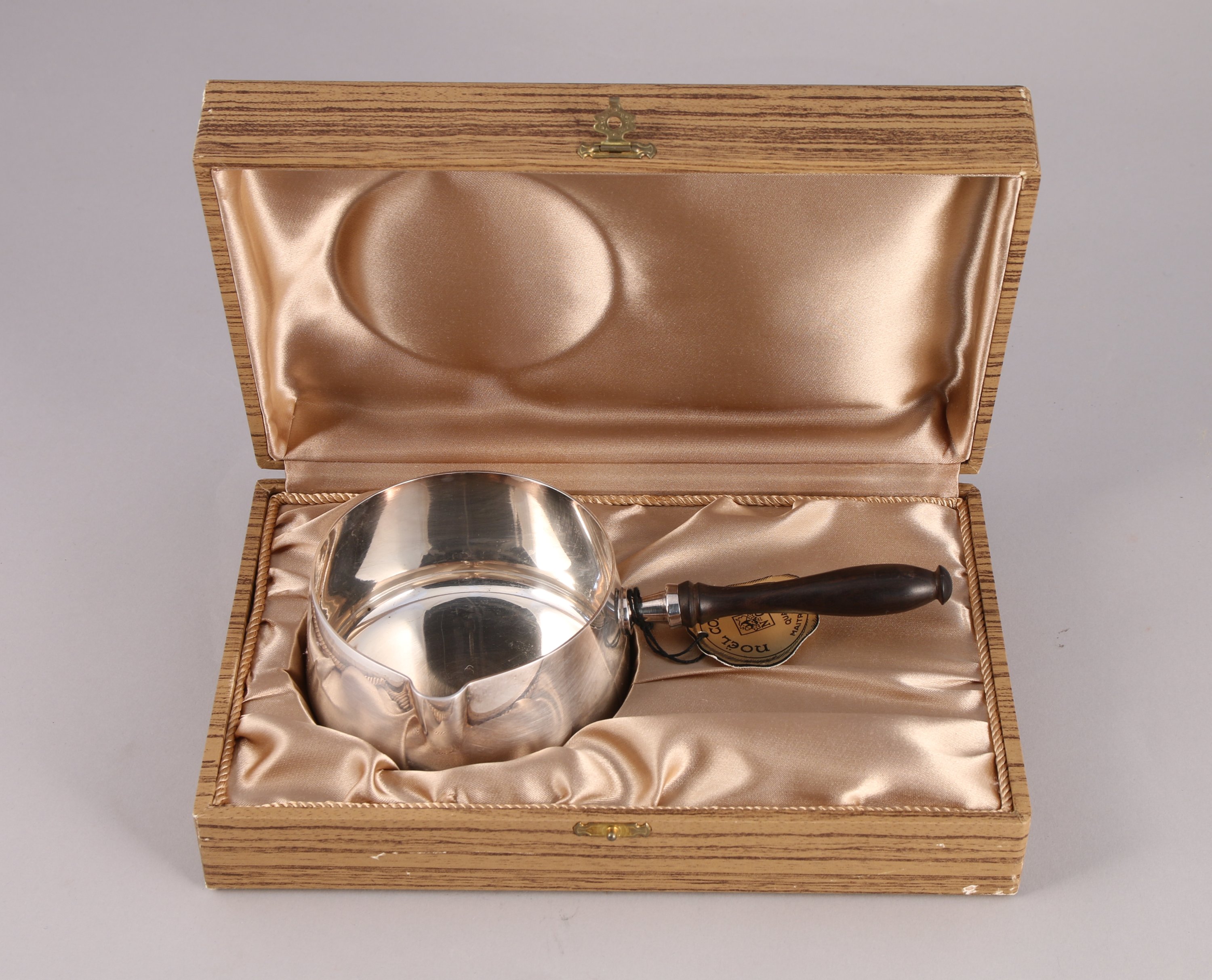 POÊLON DE TABLE en métal argenté uni à manche latéral en bois tourné.