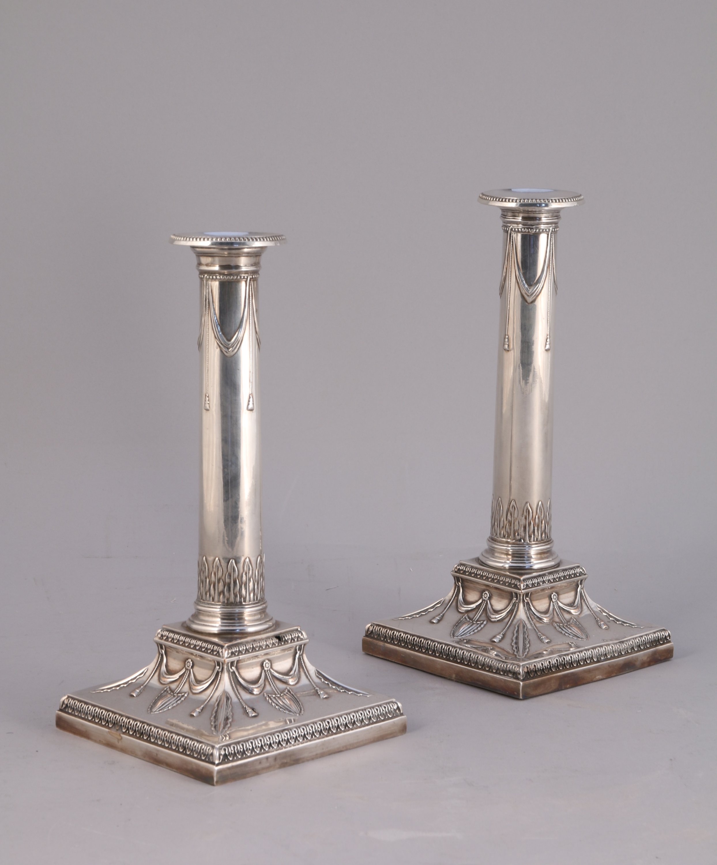 PAIRE DE FLAMBEAUX en cuivre argenté à décor repoussé de rais-de-perle, draperies et passementeries, feuilles d'eau, écussons et rais-de-coeur. Fût colonne reposant sur une base de forme carrée.