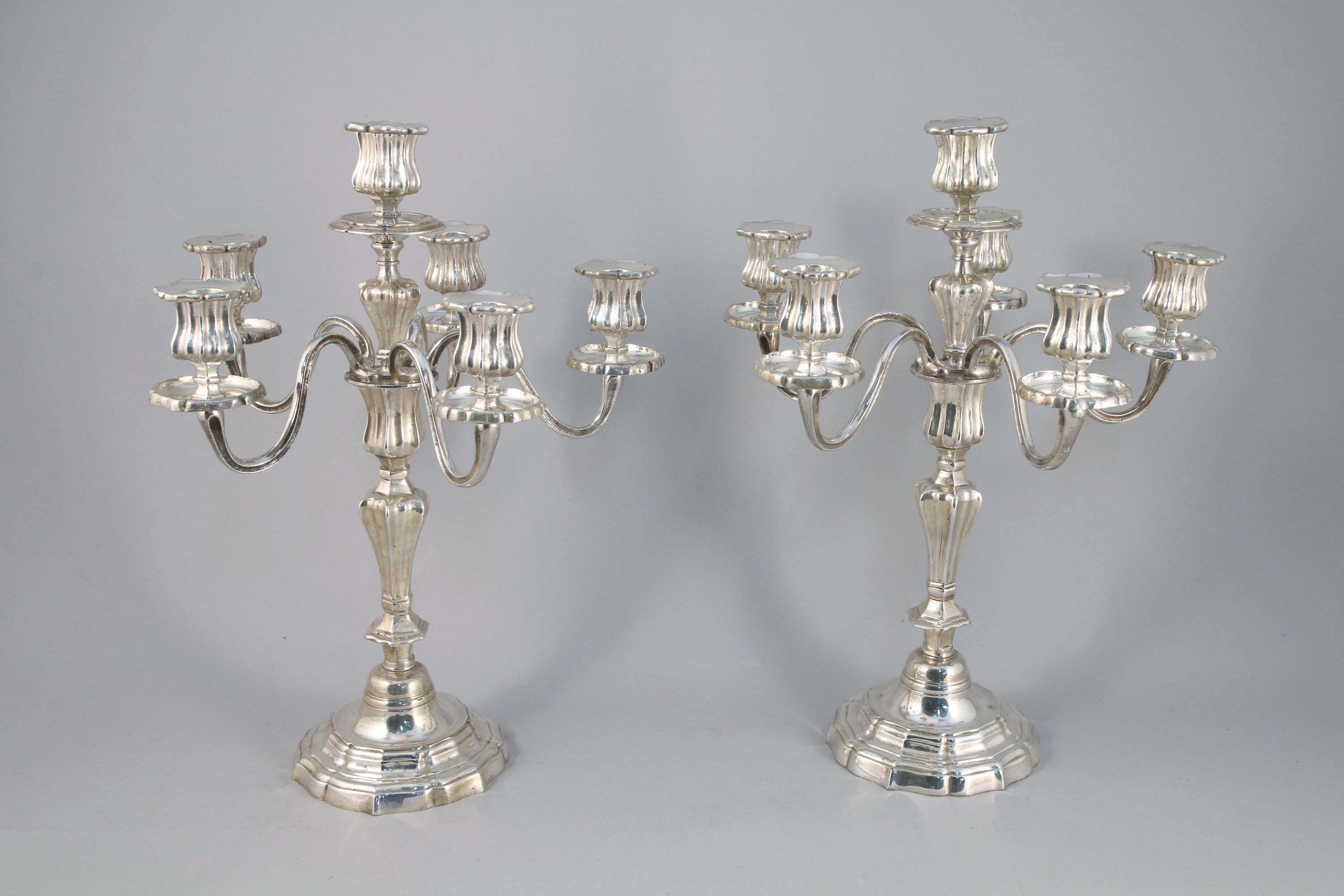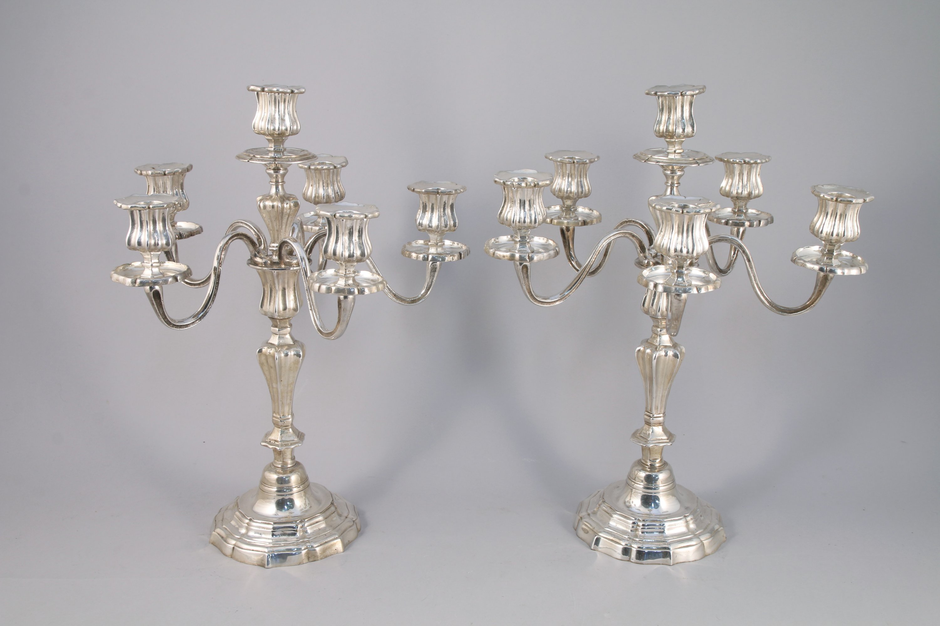 PAIRE DE CANDÉLABRES à six lumères en bronze argenté à décor de côtes pincées. Fût balustre, base de forme chantournée.
