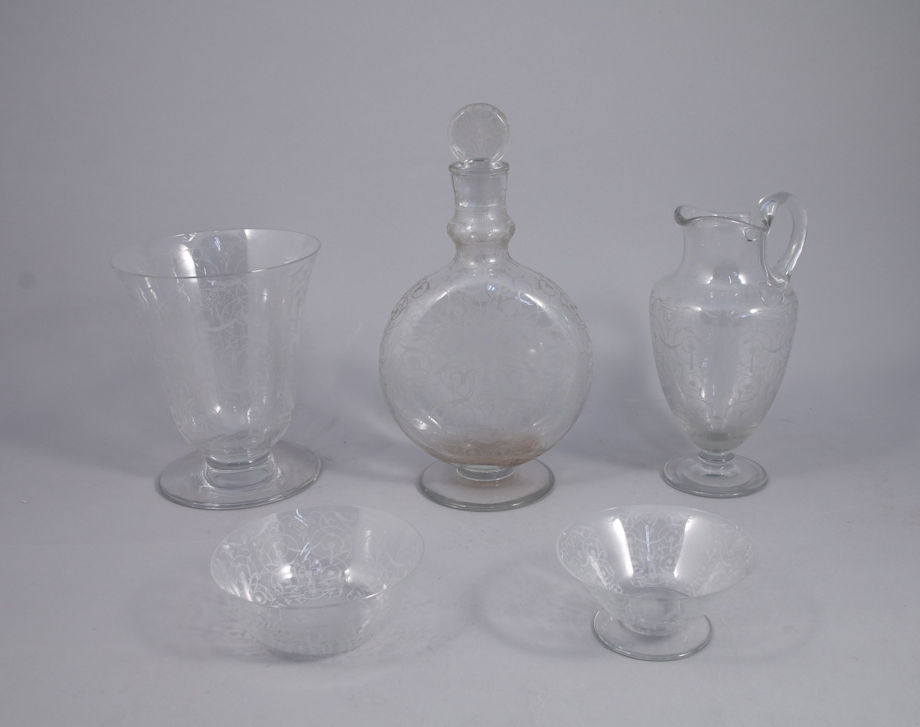 BACCARAT. Important SERVICE de VERRES, 98 PIÈCES, modèle Michel-Ange, en cristal gravé de rinceaux. Il se compose de 14 verres à eau; 12 verres à vin; 14 verres à vin blanc; 20 verrres à porto; 22 flûtes à champagne; huit coupes à glace; trois carafes et un bouchon de carafe à vin (une fêlée au pied); trois brocs à eau; une coupelle et un vase (éclat). Signés. (nombreuses égrenures, en l'état)