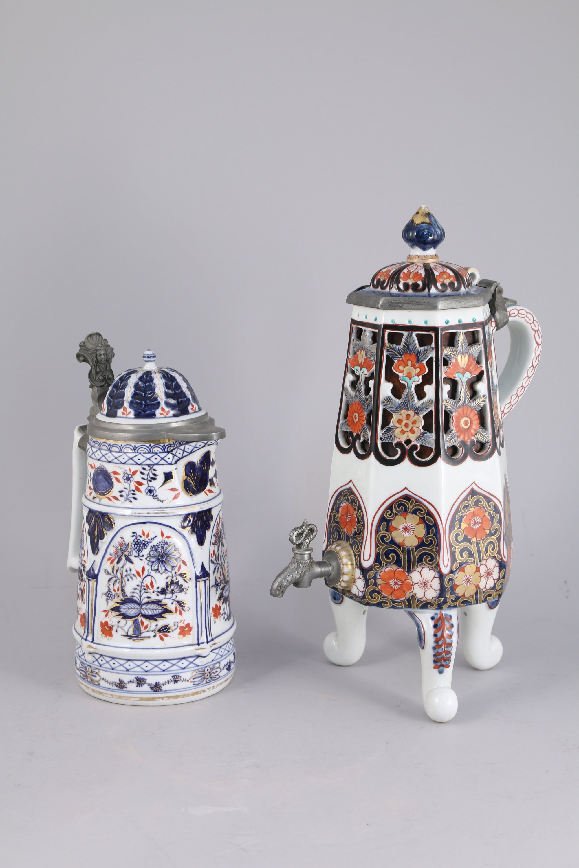 - PICHET couvert de forme tronconique en porcelaine émaillée bleu, rouge et or dans style Imari de bouquets floraux et frises de quadrillages. Le décor est structuré par des feuillages et arcatures en léger relief. Couvercle à charnière cerclé d'étain. L'appui-pouce orné d'un masque féminin coiffé d'une coquille et flanqué de cuirs découpés.