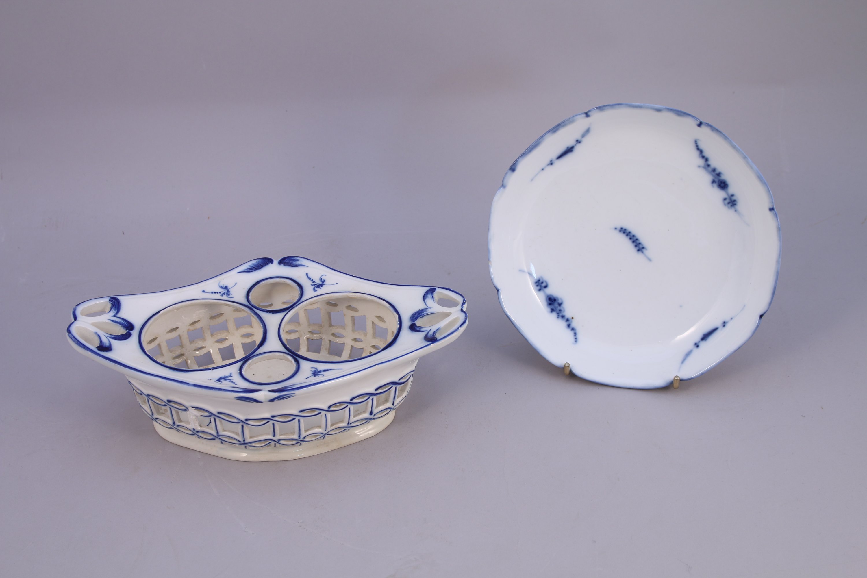 - PORTE HUILIER-VINAIGRIER de forme oblongue en faïence. Décor dit "à la brindille" en camaïeux bleu et peignés bleus. Les côtés ajourés à l'imitation de la vannerie. Marque en creux "BLI". XIXe. Haut. 8,5, Long. 26,5 cm. (restauration)