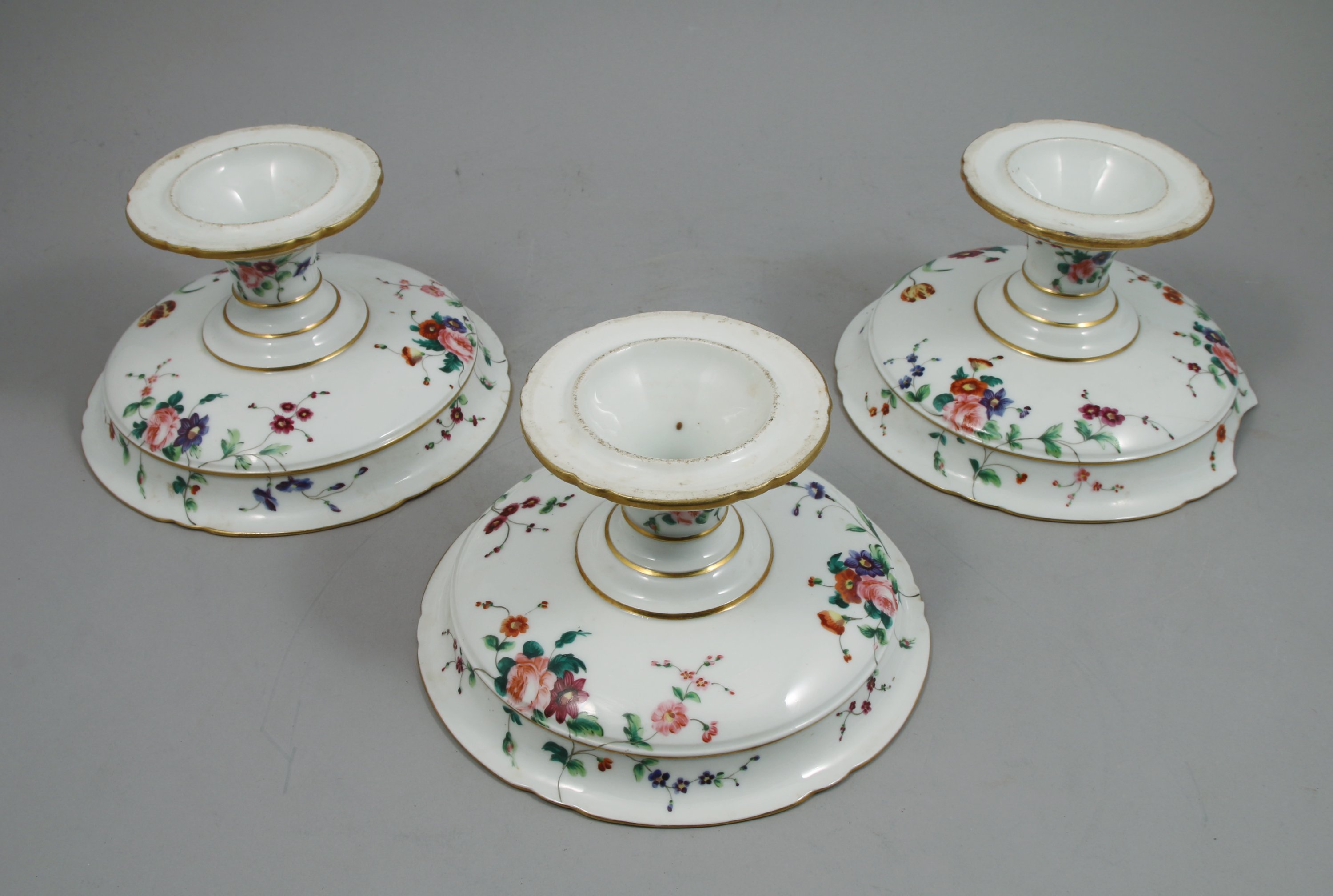 PARIS. TROIS COUPES ronde sur piédouche, en porcelaine polychrome et or. Décor plein de semis de fleurs au naturel et tulipes.