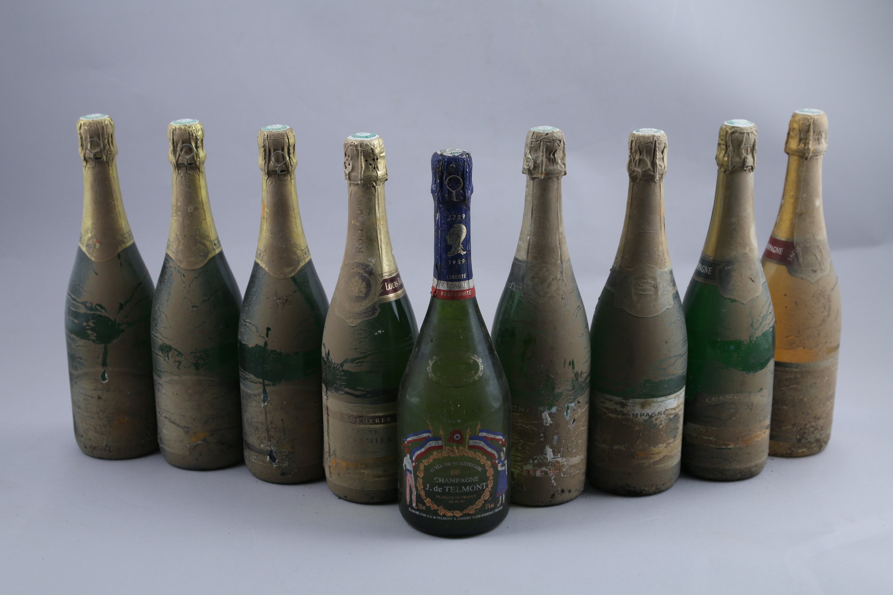 CHAMPAGNE. 9 bouteilles dont : 1 bouteille J. de Telmont cuvée du bicentenaire 1989 (N, étiquette tachée), 3 bouteilles Michel Pommelet (N, étiquettes tachées et déchirées), 1 bouteille Louis Roederer (N, étiquette tachée), 1 bouteille Jacques Courson (N, étiquette tachée), 2 bouteilles Piper Heisieck (étiquettes très tachée), 1 bouteille étiquette déchirée champagne inconnu (N)