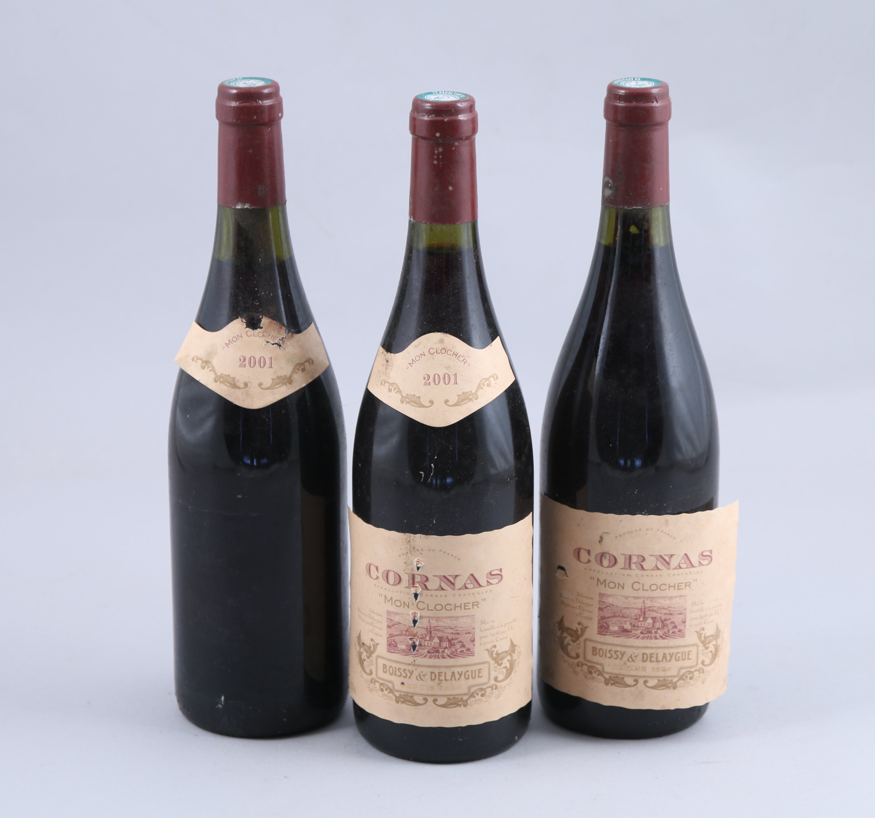 CORNAS. Mon Clocher, Boissy & Delaygue, 2001. 3 bouteilles. (N et BG, étiquettes détachées)