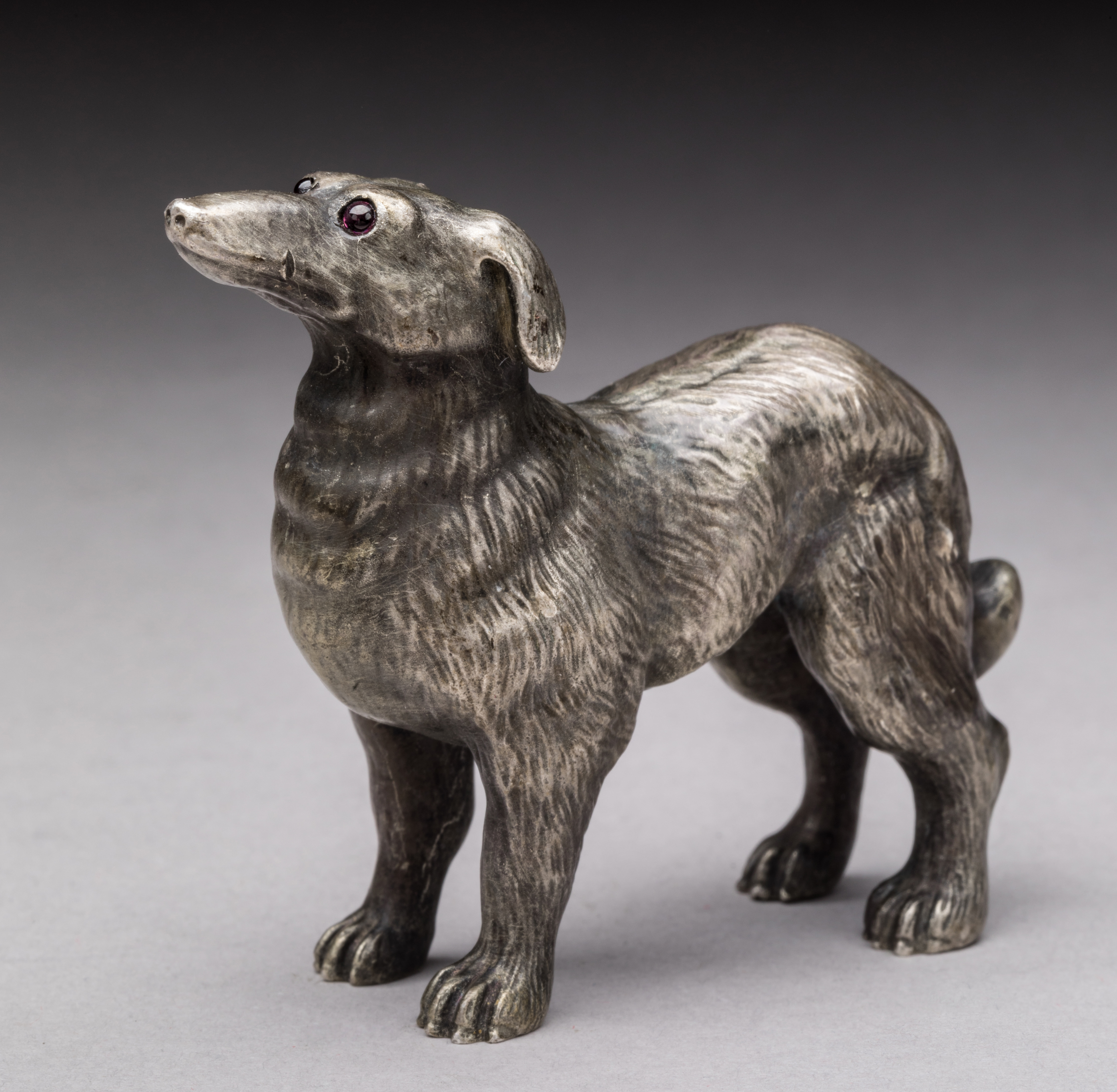 LÉVRIER debout en argent (plein) ciselé. Les yeux incrustés d'un cabochon de rubis.