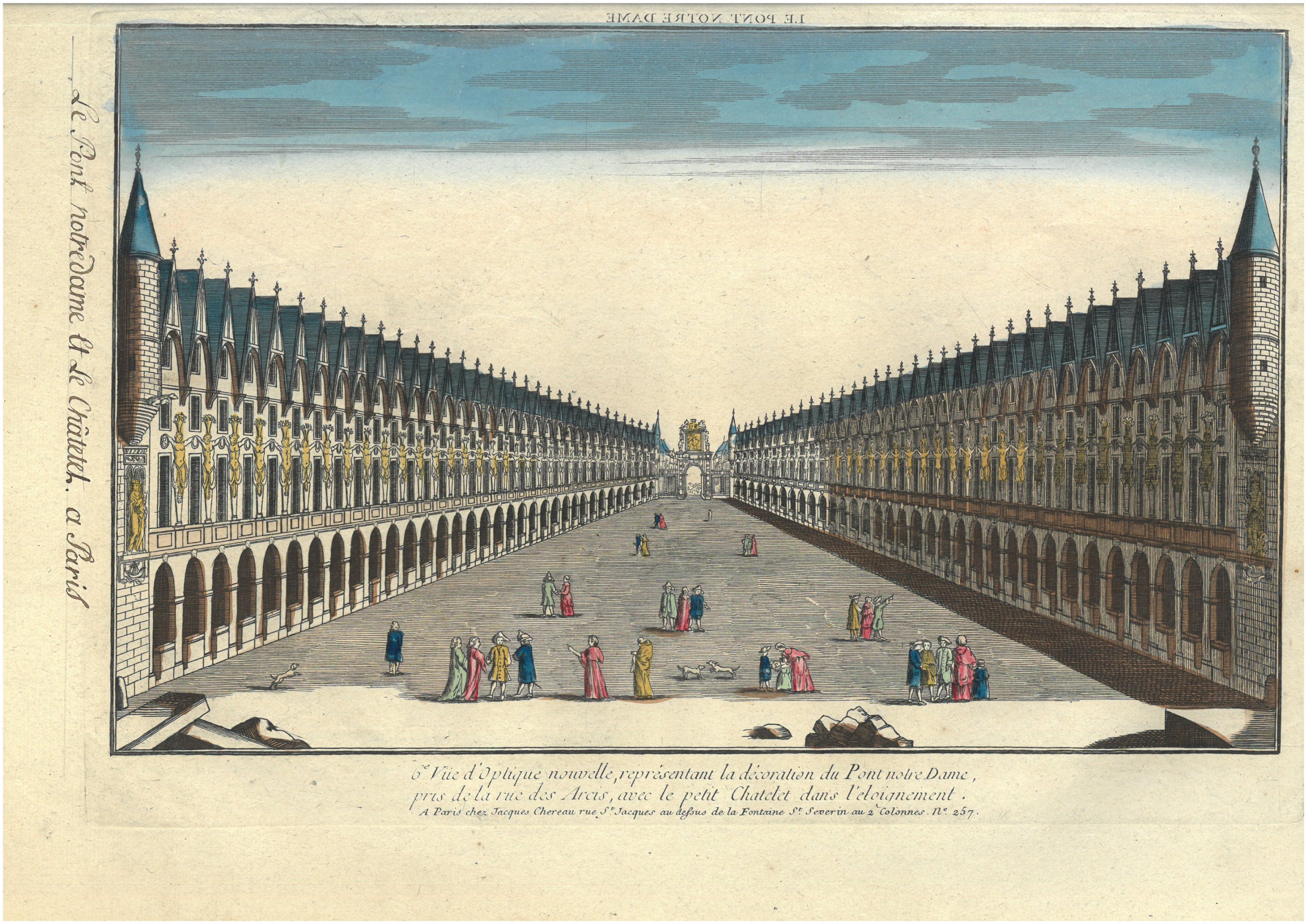 Les vues d'optiques témoignent d'une vogue des images en perspective, montrées dans les salons dès la fin du XVIIIe siècle et au début du XIXe siècle. Ce lot présente de nombreuses vues des ponts, places et évènements marquants de la ville de Paris.