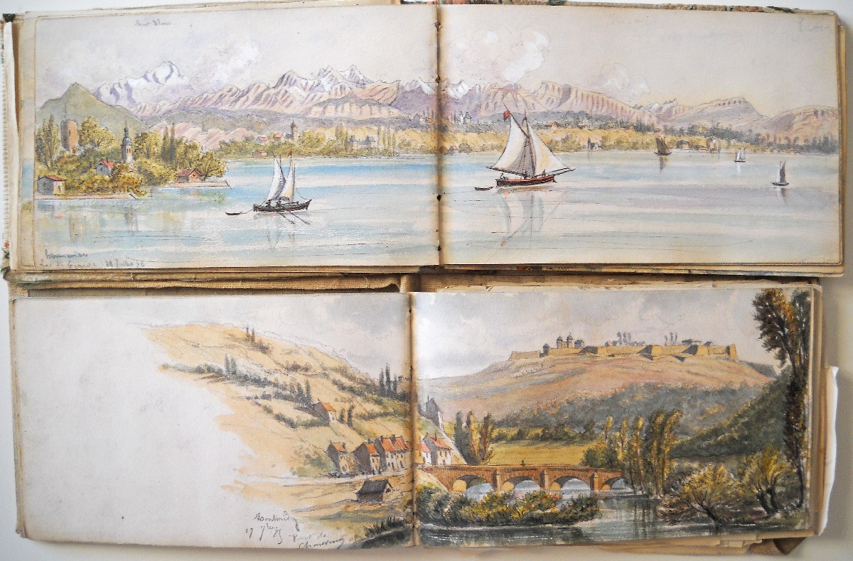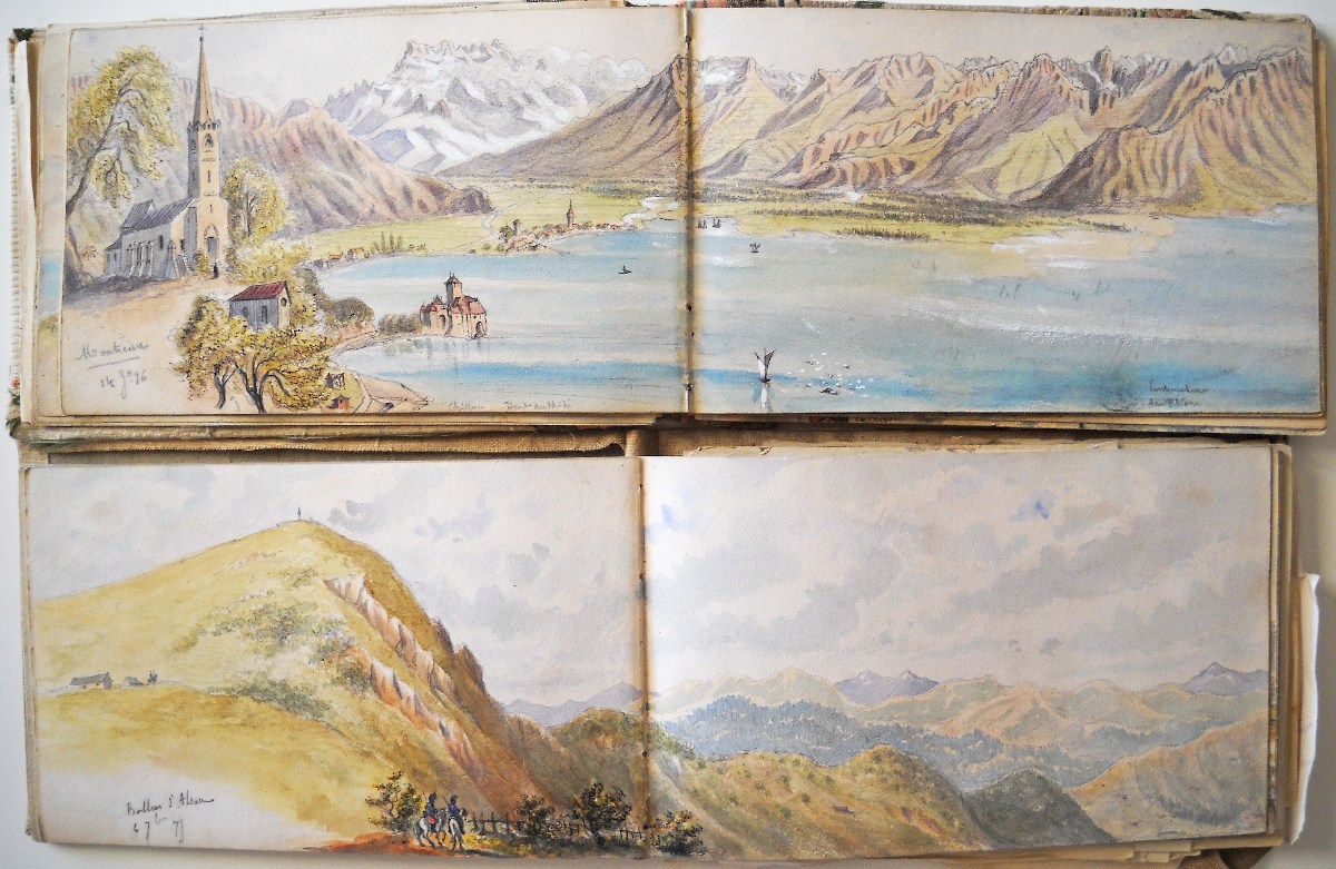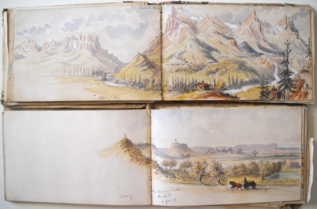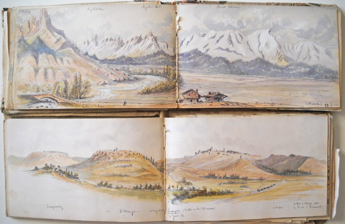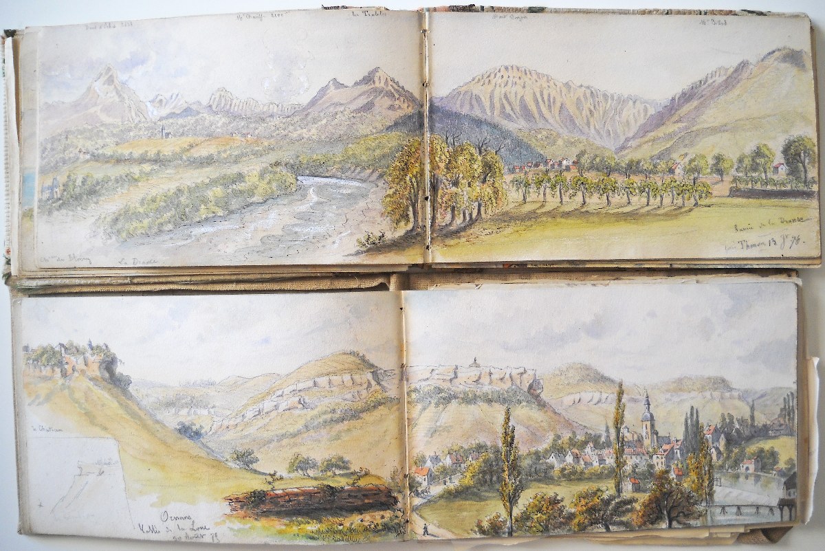2 carnets souvenirs personnels du chef d'escadron Guioth représentant différents paysages de massifs montagneux visités d'août à octobre 1875 et de juin à août 1876 : Tarcenay, Ornans, Lods, Mouthier Haute Pierre (vallée de la Loire), le Pain de Sucre ; le Saut de la Truite, le Ballon d'Alsace ; Montmédy et sa citadelle ; Besançon : la Porte Taillée, le Pont de Battant ; Montferrand bord du Doubs ; Langres, la vallée de la Marne ; Montrond, Mouthier ; Le fort de Joux, Pontarlier ; Toul, Villey le Sec ; fort d'Arches ; la chaine des Vosges ; vallée du Rahin ; forêt de Darney, Bains-les-Bains ; Dompaire la Viéville ; Faverney ; Montbéliard ; Chamesol, Saint Hippolyte, vallée du Dessoubre ; Blamont ; Jougne (Jura) ; Vallorbe, Le Jura Suisse ; Lac de Genève, Lausanne ; Evian ; Rochers de Mémise ; Ravin de la Dranse près Thonon ; Vevey la Tour ; Montreux ; Bonneville, La Cluse, Vallée de l'Arve, Sallanches, Chamonix ; La Flégère, Aiguille du Midi, le Mont blanc, aiguille d'Argentière, Cascade du Chapeau, Mer de glace ; Trient, cascade de Pissevache ; lac de Genève Petite rive ; Saint Paul, La Dent d'Oche ; Chillon ; Gorge de la Drance ; Lausanne ; lac des 4 cantons, lac de Zug, lac de Lucerne ; Lucerne, lac d'Uri ; lac de Zürich, Schaffhausen ; etc.