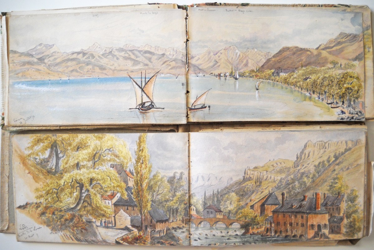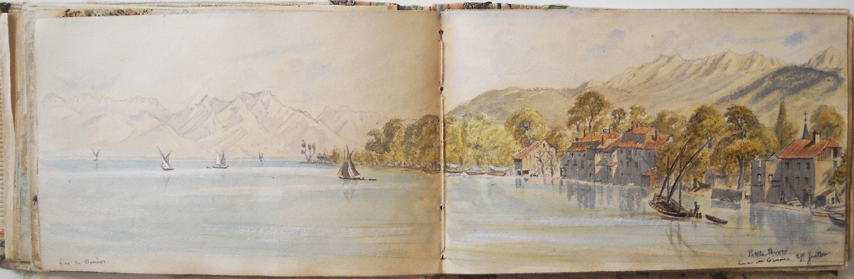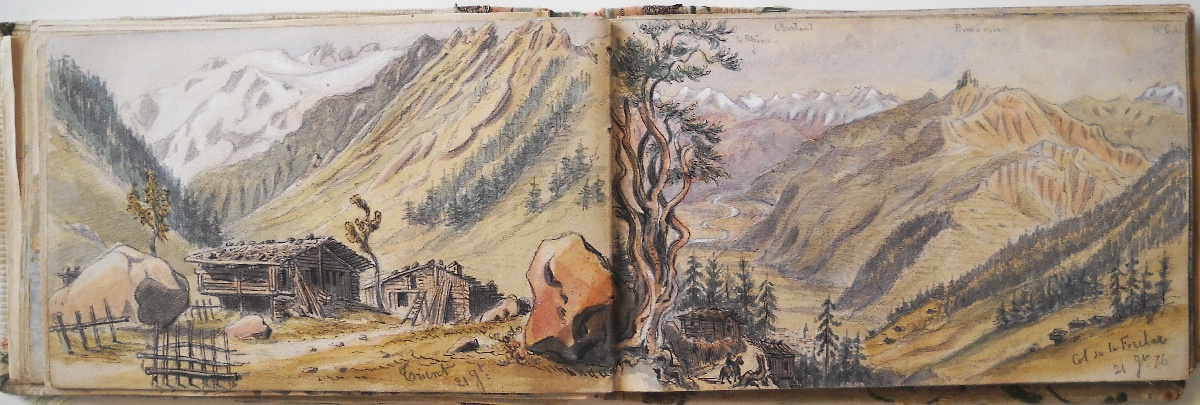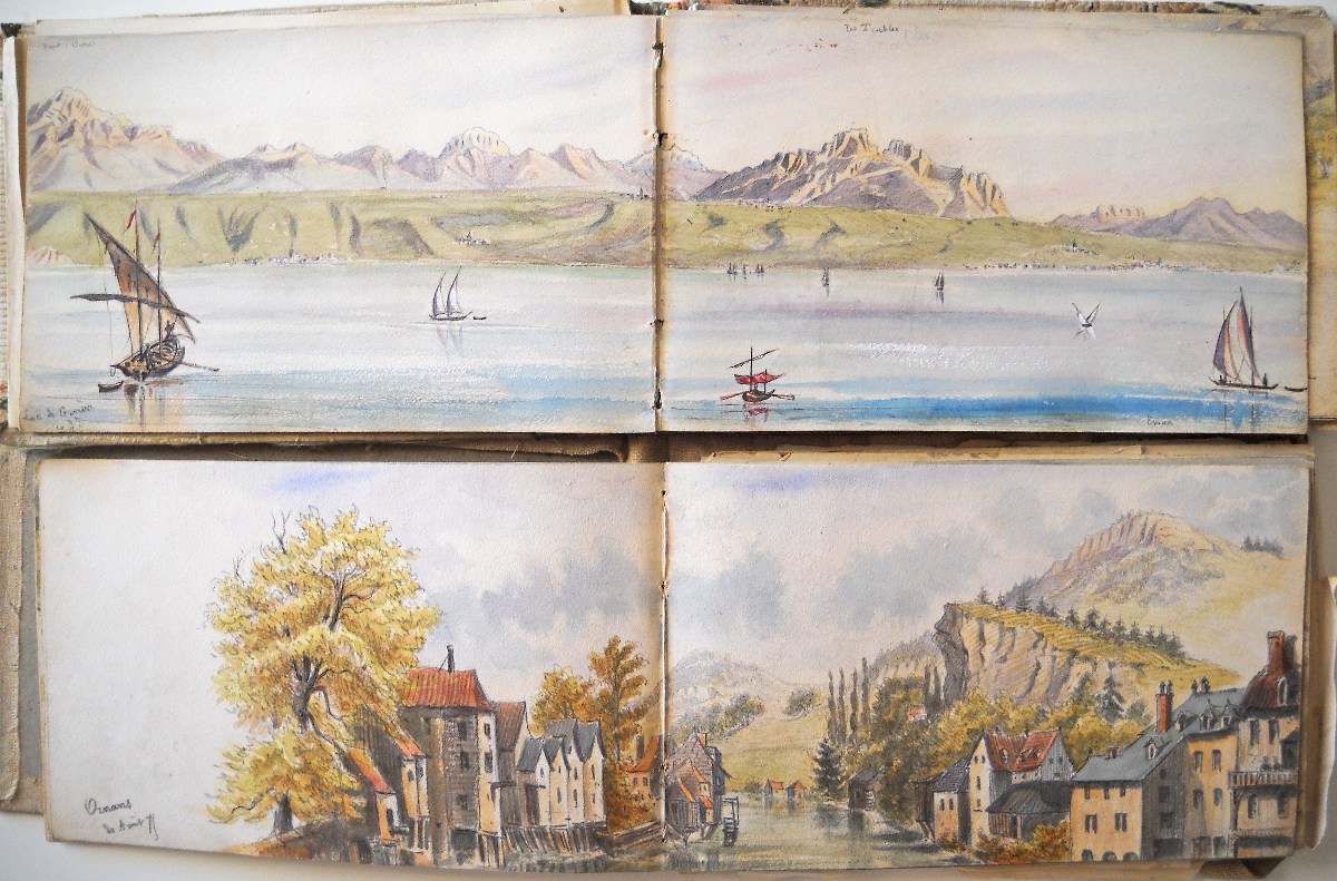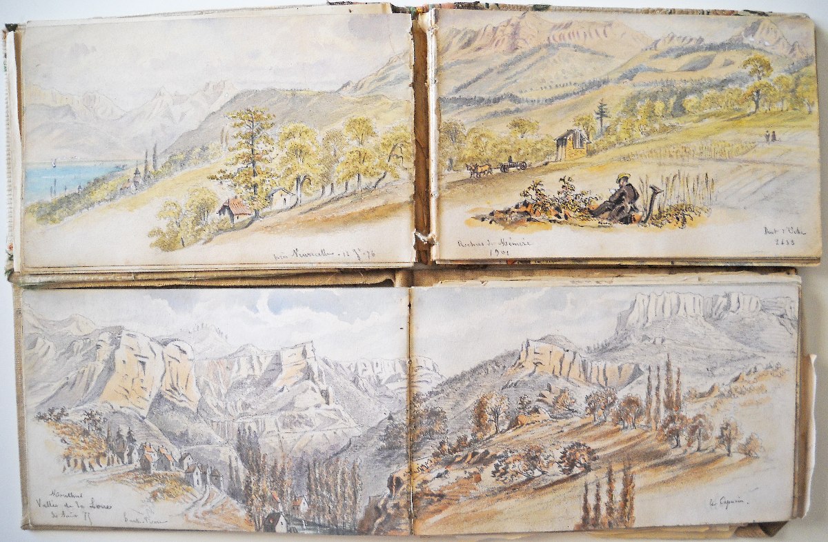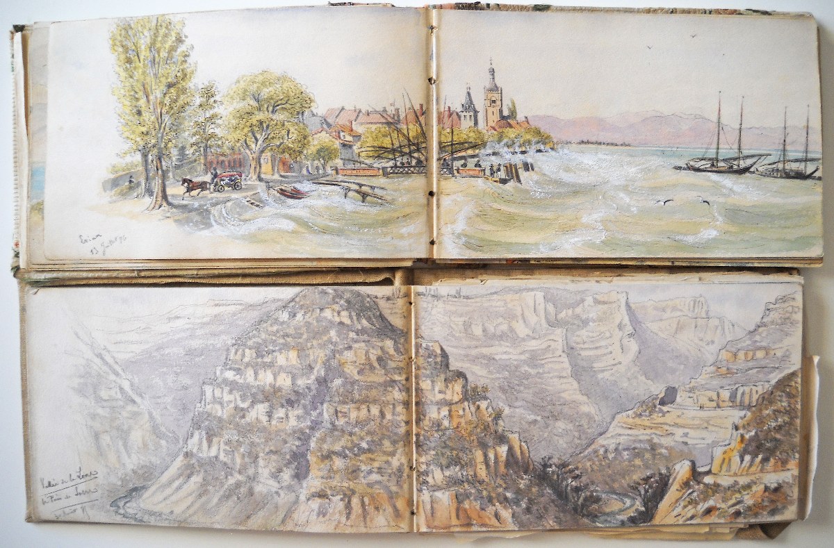 2 carnets souvenirs personnels du chef d'escadron Guioth représentant différents paysages de massifs montagneux visités d'août à octobre 1875 et de juin à août 1876 : Tarcenay, Ornans, Lods, Mouthier Haute Pierre (vallée de la Loire), le Pain de Sucre ; le Saut de la Truite, le Ballon d'Alsace ; Montmédy et sa citadelle ; Besançon : la Porte Taillée, le Pont de Battant ; Montferrand bord du Doubs ; Langres, la vallée de la Marne ; Montrond, Mouthier ; Le fort de Joux, Pontarlier ; Toul, Villey le Sec ; fort d'Arches ; la chaine des Vosges ; vallée du Rahin ; forêt de Darney, Bains-les-Bains ; Dompaire la Viéville ; Faverney ; Montbéliard ; Chamesol, Saint Hippolyte, vallée du Dessoubre ; Blamont ; Jougne (Jura) ; Vallorbe, Le Jura Suisse ; Lac de Genève, Lausanne ; Evian ; Rochers de Mémise ; Ravin de la Dranse près Thonon ; Vevey la Tour ; Montreux ; Bonneville, La Cluse, Vallée de l'Arve, Sallanches, Chamonix ; La Flégère, Aiguille du Midi, le Mont blanc, aiguille d'Argentière, Cascade du Chapeau, Mer de glace ; Trient, cascade de Pissevache ; lac de Genève Petite rive ; Saint Paul, La Dent d'Oche ; Chillon ; Gorge de la Drance ; Lausanne ; lac des 4 cantons, lac de Zug, lac de Lucerne ; Lucerne, lac d'Uri ; lac de Zürich, Schaffhausen ; etc.