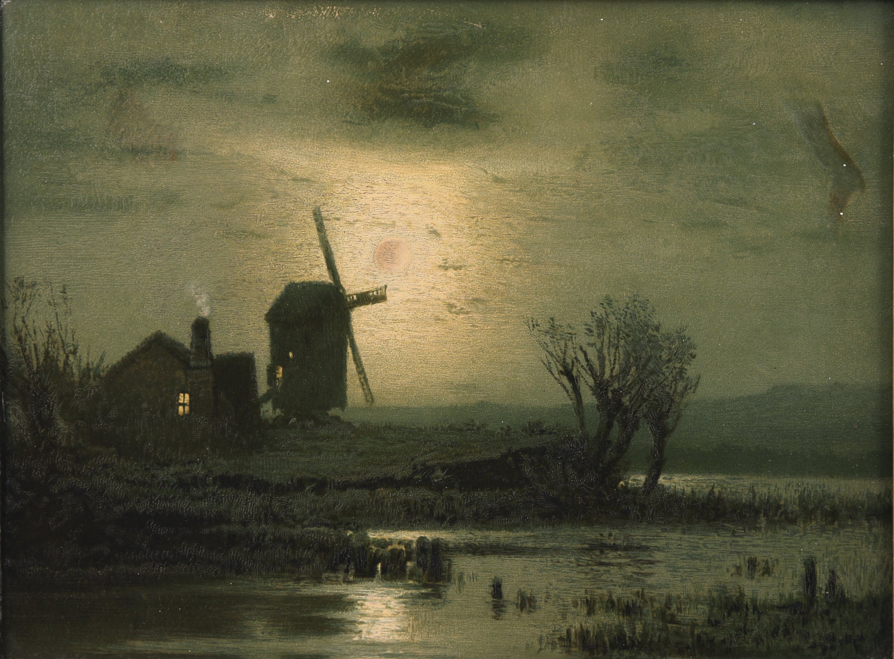 - Paysage nocturne au moulin dans le goût de Ruisdael. 33 x 25,5 cm.