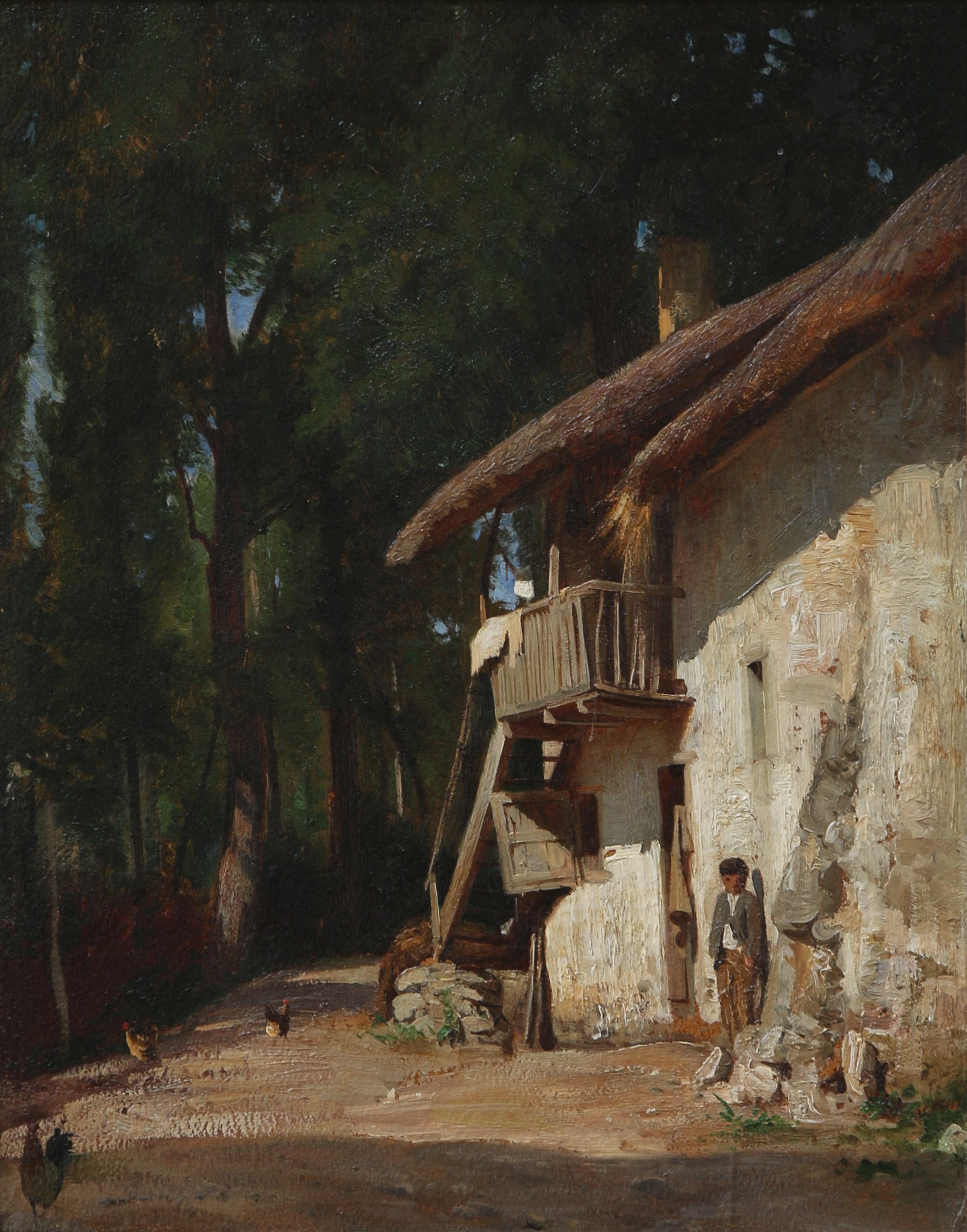 École du XIXème.Cour de ferme.Panneau d'acajou.Haut. 42,5 Larg. 32,5 cm.Dans...