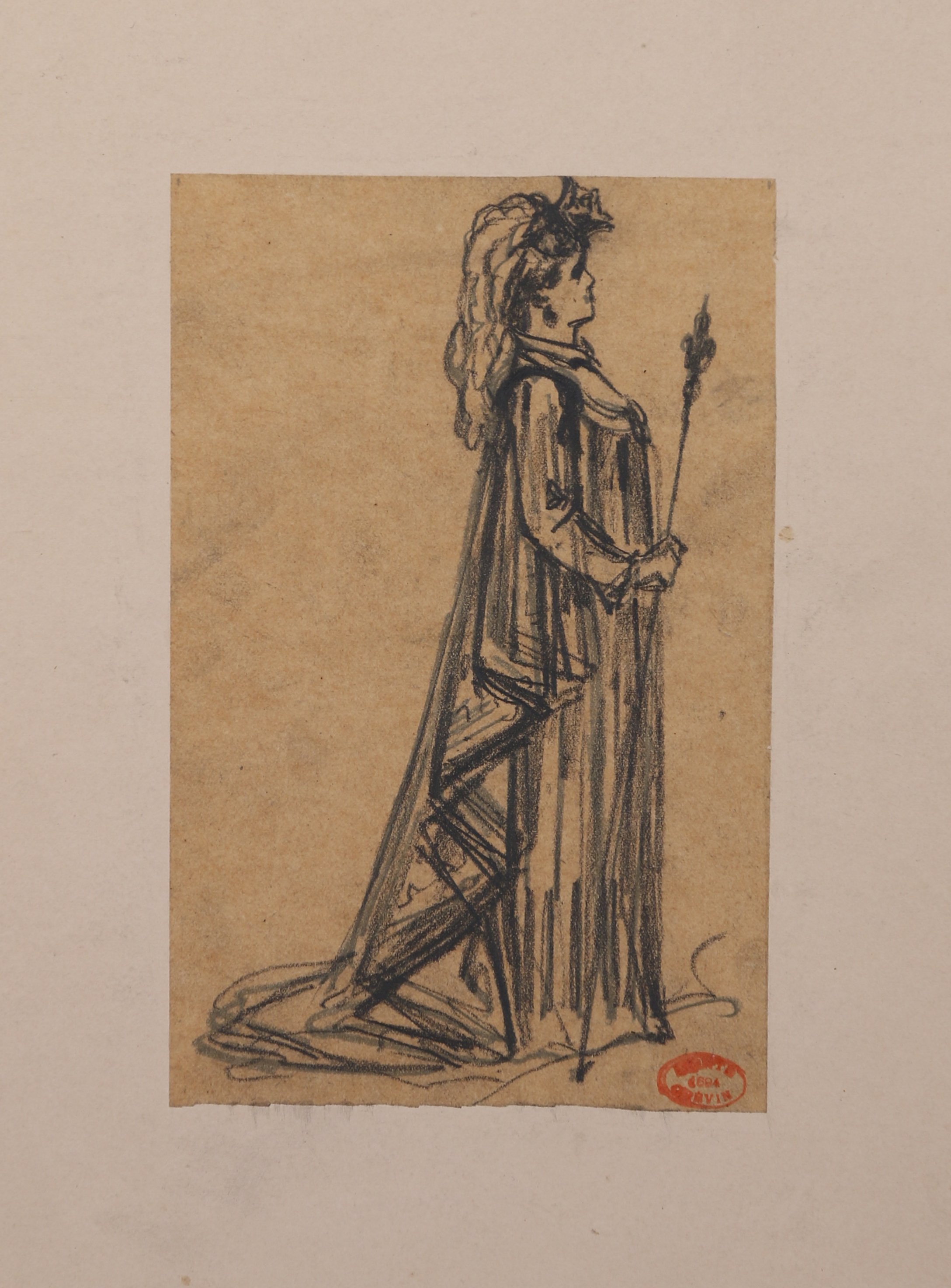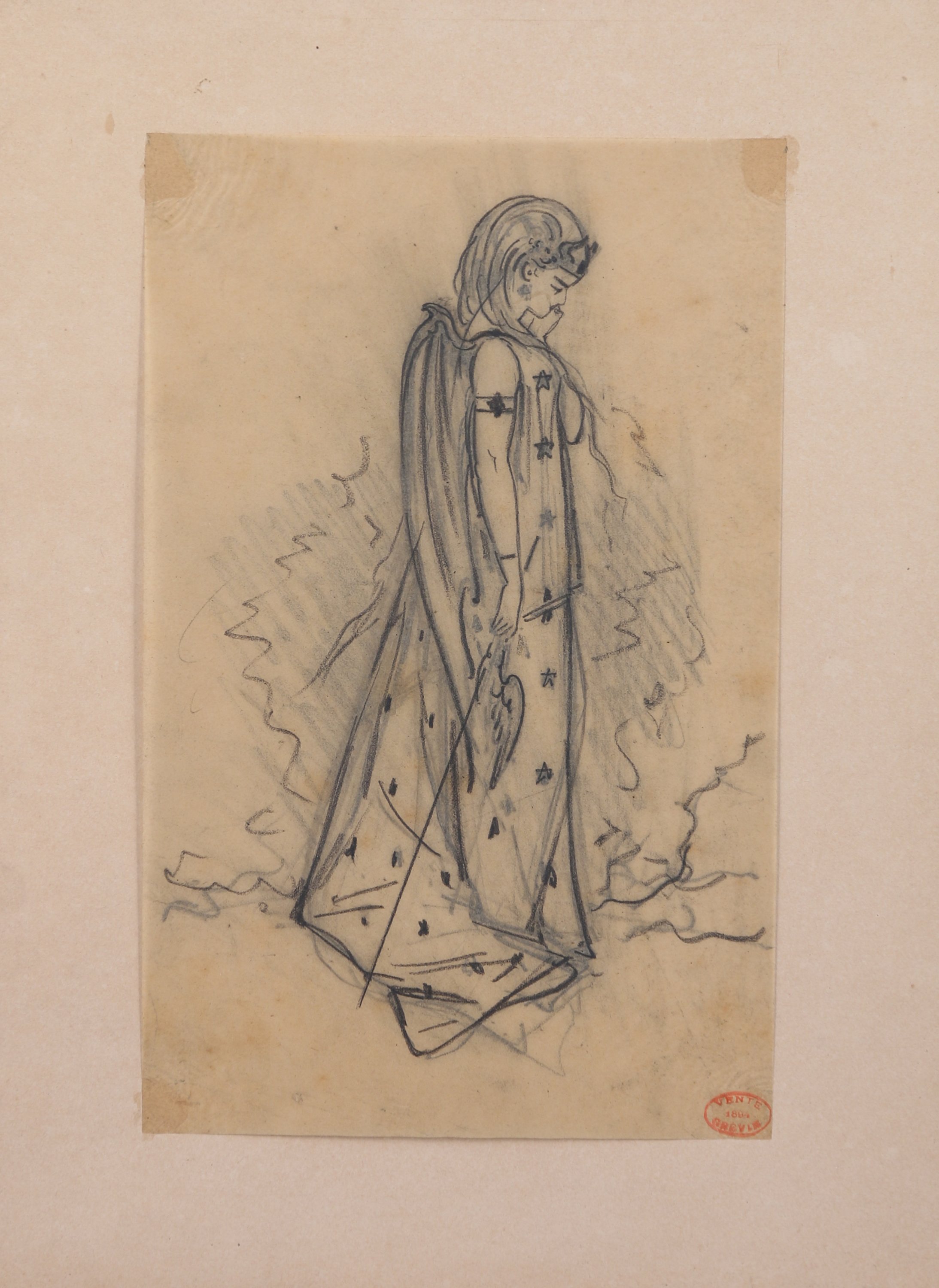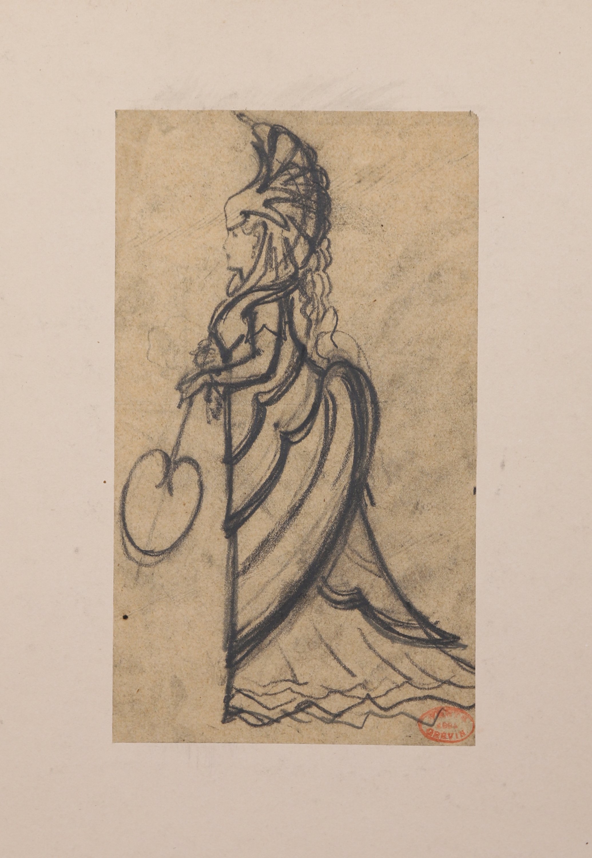 Sculpteur, caricaturiste, dessinateur et créateur de costumes de théâtre français, Alfred Grévin entre dans l'histoire en fondant le musée de cire qui porte son nom sur le boulevard Montmartre à Paris. La vente après décès de son fonds d'atelier dure deux jours à l'hôtel Drouot, les 12 et 13 juin 1894. Ses dessins et croquis pour le théatre sont vendus par lots (n°37 à 72), de même que ceux à destination des ballets (n°73 à 110).