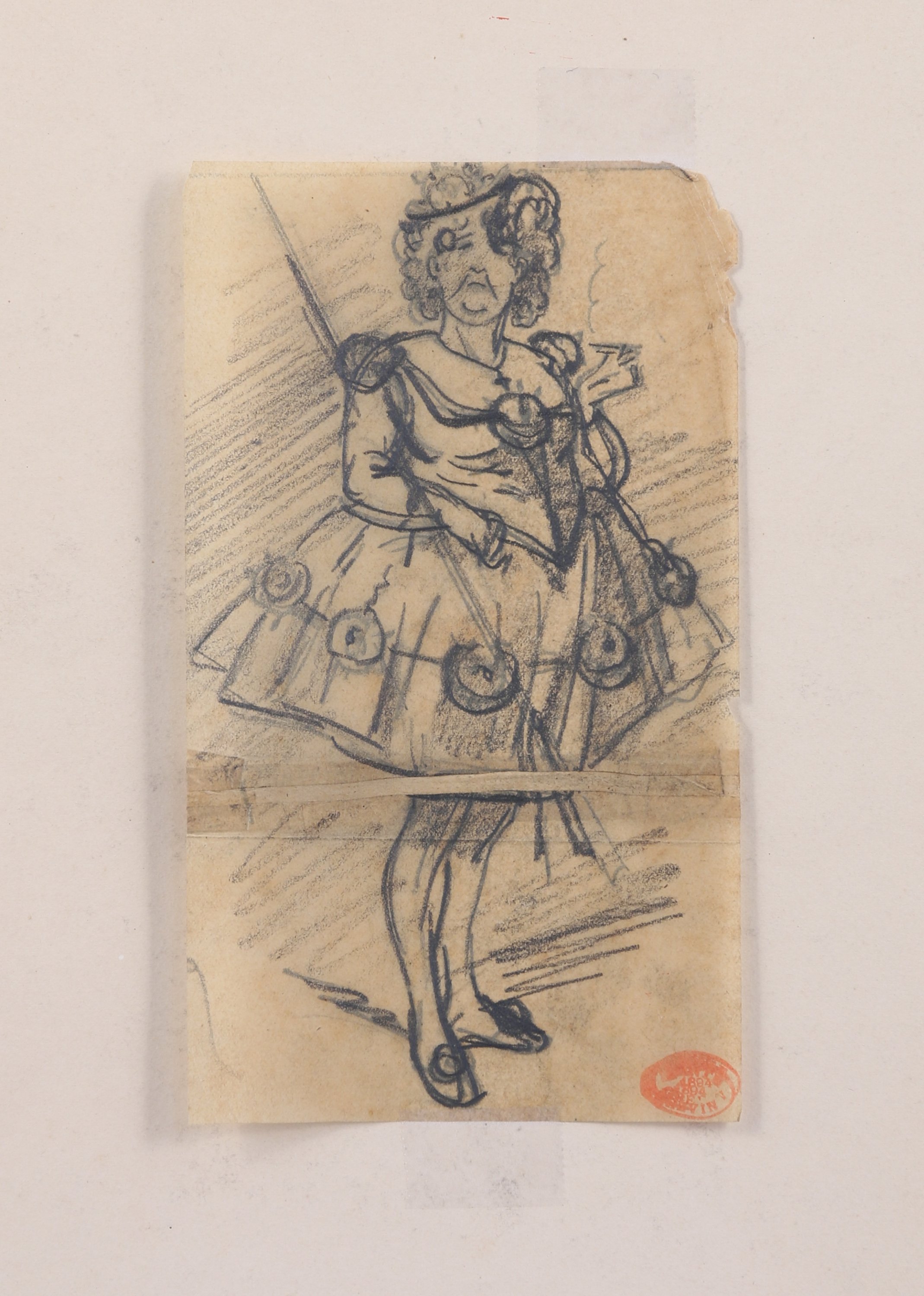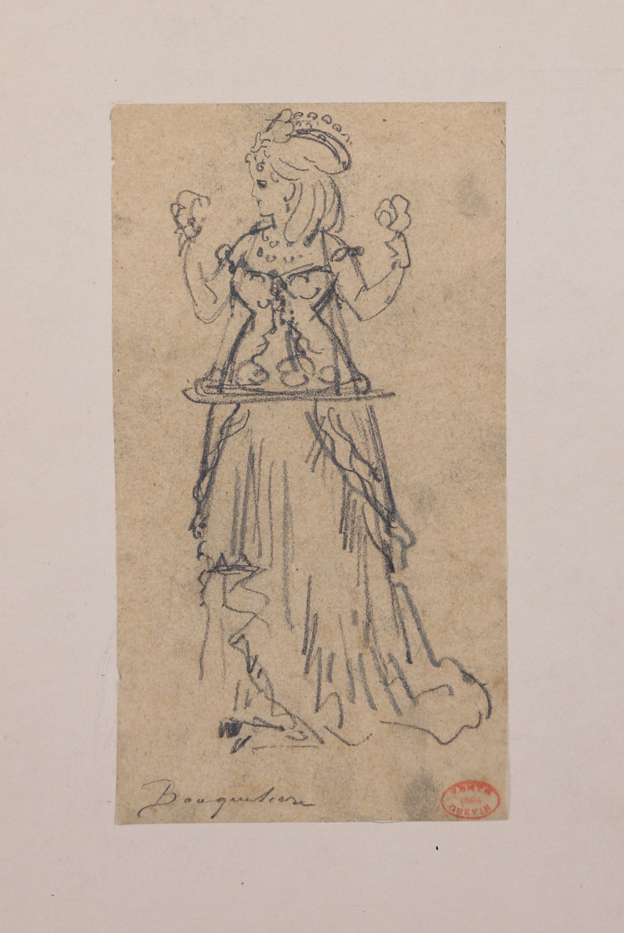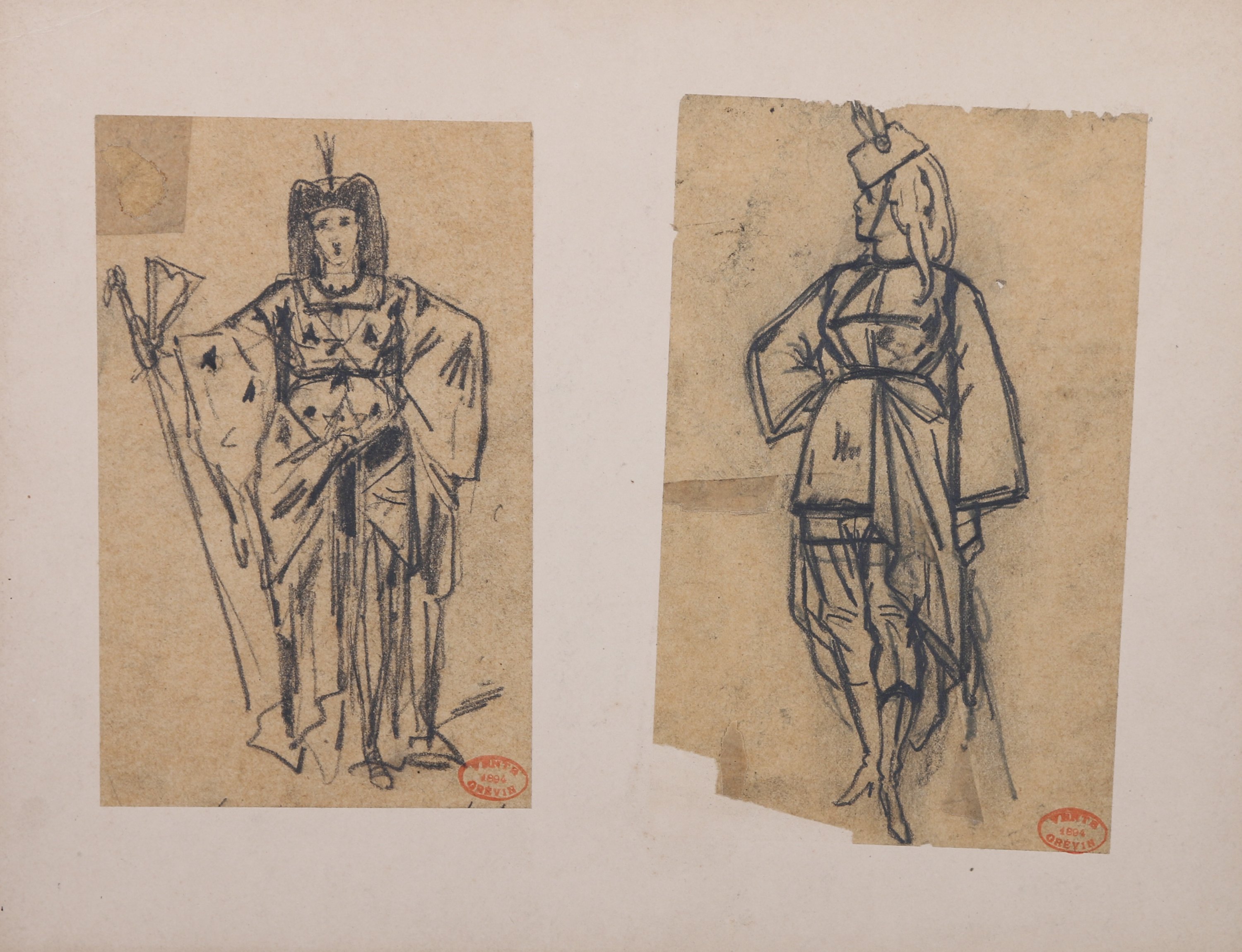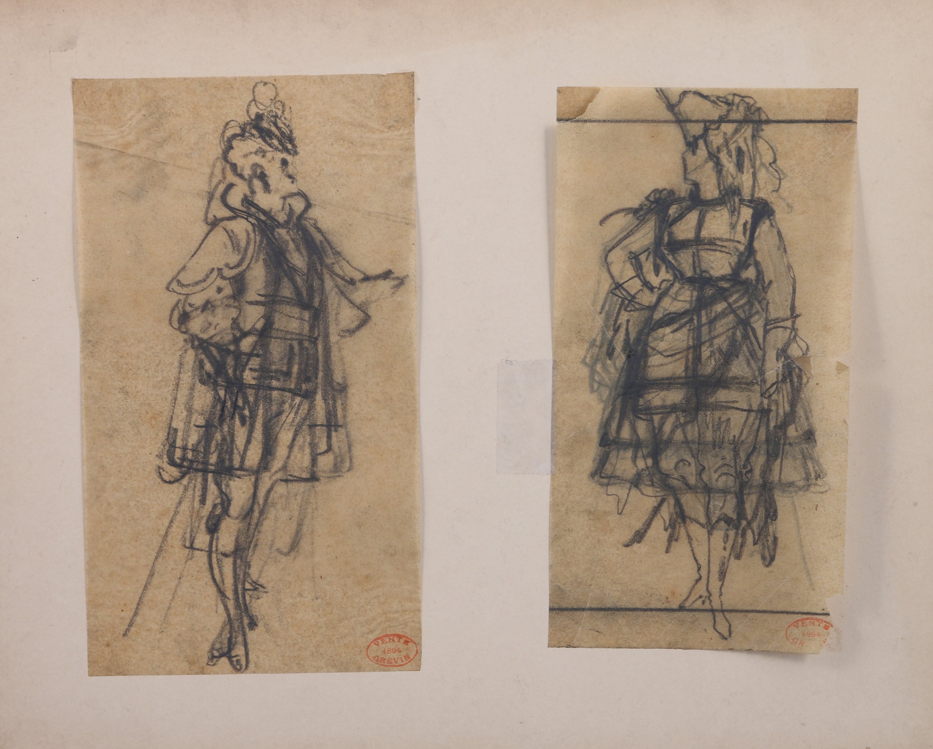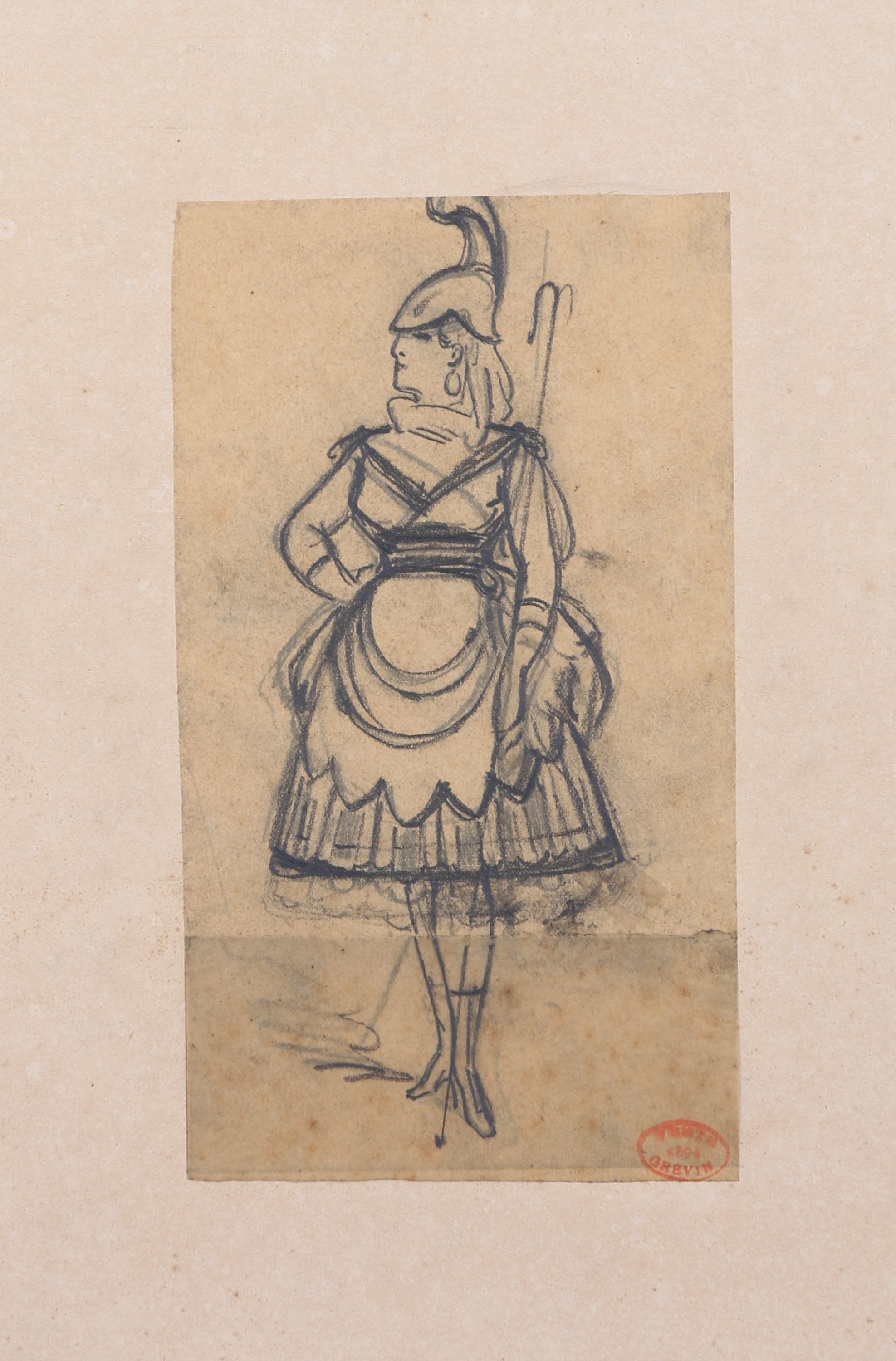 Sculpteur, caricaturiste, dessinateur et créateur de costumes de théâtre français, Alfred Grévin entre dans l'histoire en fondant le musée de cire qui porte son nom sur le boulevard Montmartre à Paris. La vente après décès de son fonds d'atelier dure deux jours à l'hôtel Drouot, les 12 et 13 juin 1894. Ses dessins et croquis pour le théatre sont vendus par lots (n°37 à 72), de même que ceux à destination des ballets (n°73 à 110).