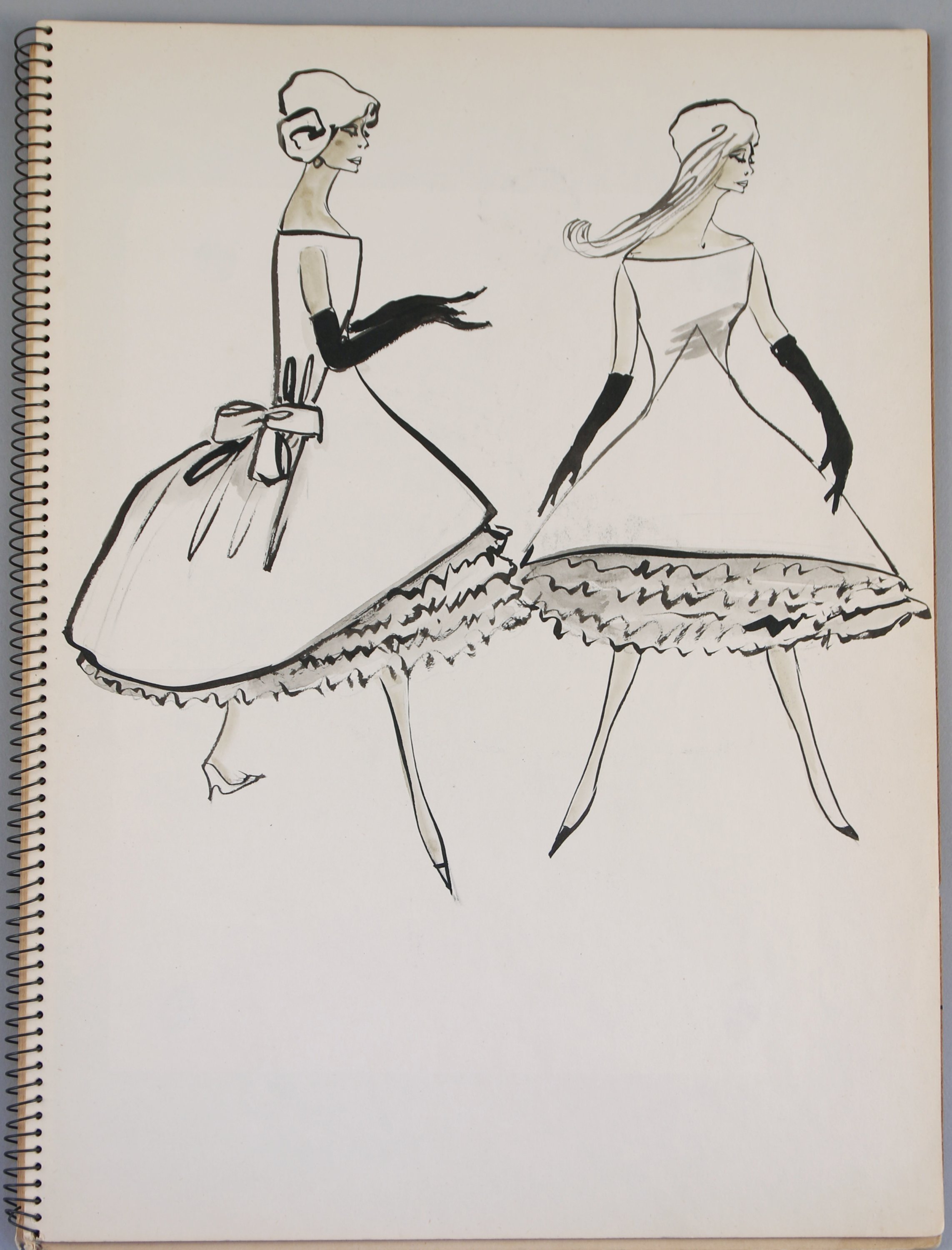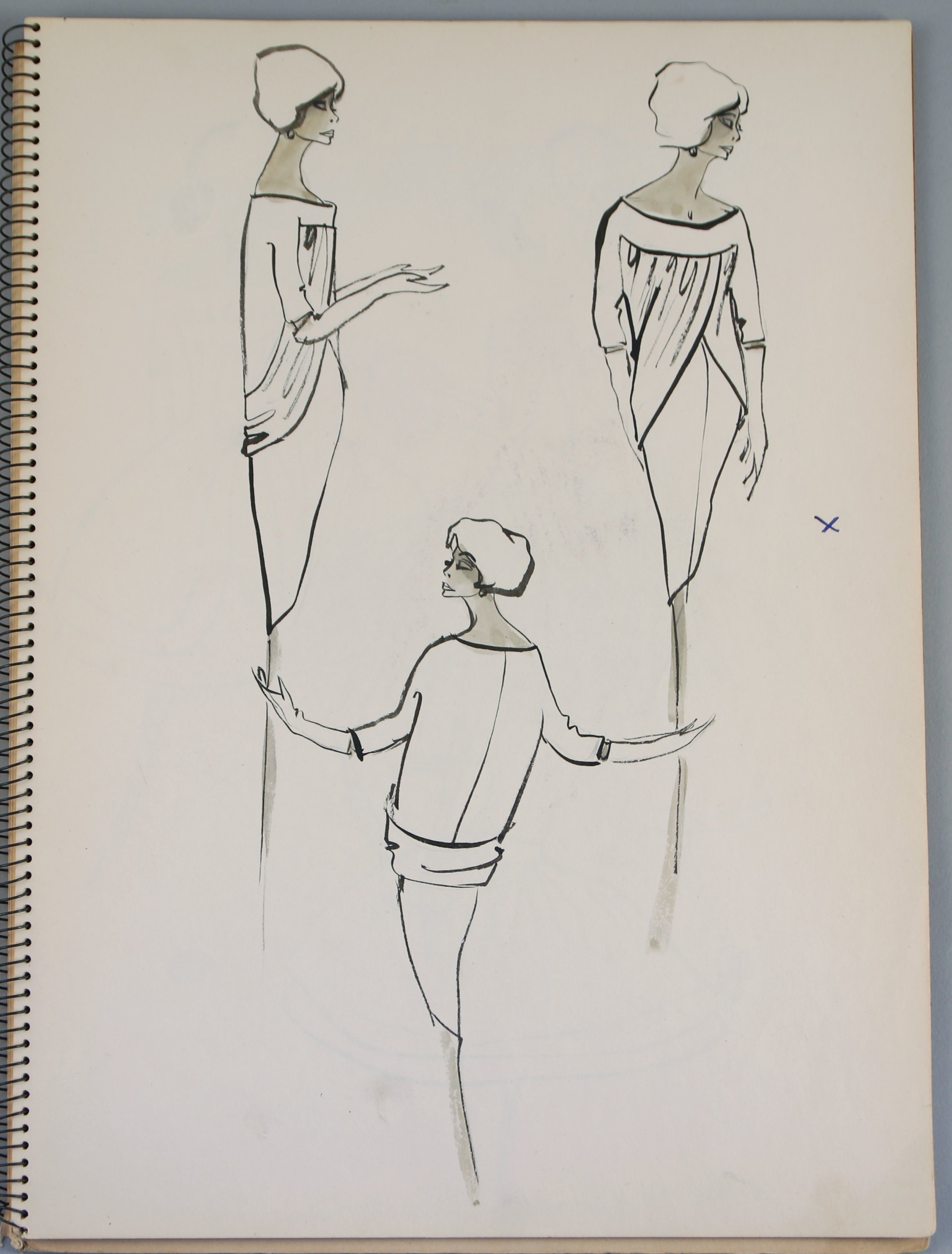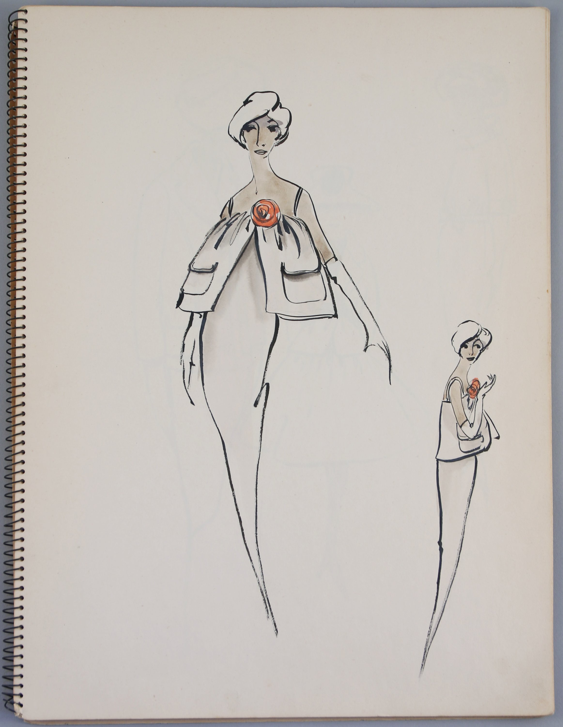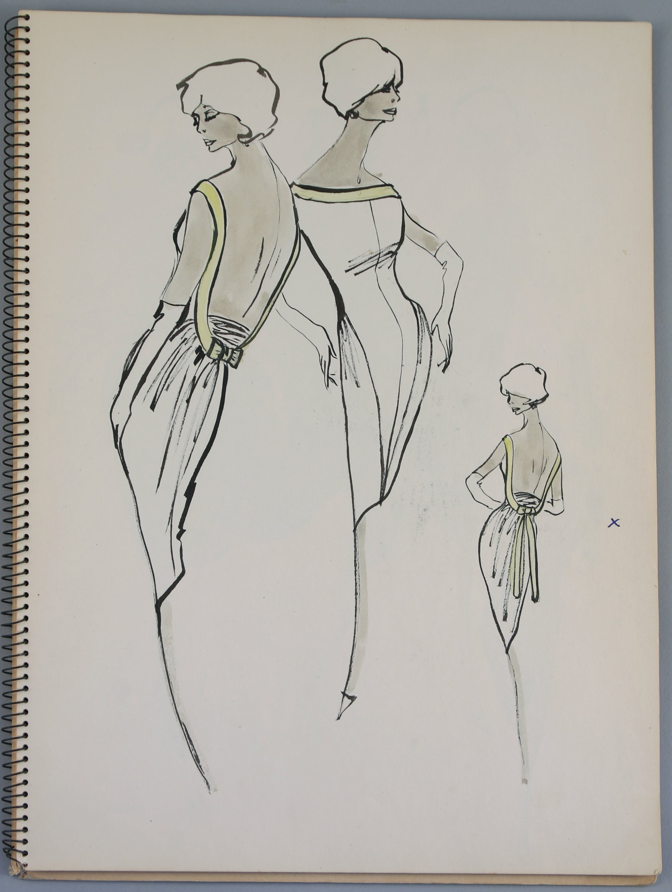 Si le jeune dessinateur italien René Gruau illustre les créations de Balenciaga, Rochas ou Givenchy dès son arrivé à Paris dans les années 1930, nos carnets sont à rapprocher de dessins réalisés pour Christian Dior (Ader, n°419 et 420, 18 novembre 2016) et Jacques Fath. Nos dessins rappellent en effet les premières collections d'Yves Saint Laurent chez Dior, avec sa célèbre ligne Trapèze en 1958, dont on retrouve la ligne d'épaule et l'encolure dégagée. De nombreuses maisons, comme celle de Jacques Heim, s'inspirent également de cette ligne, ainsi qu'en témoigne un carnet conservé au musée Galliera (2013.0.5).