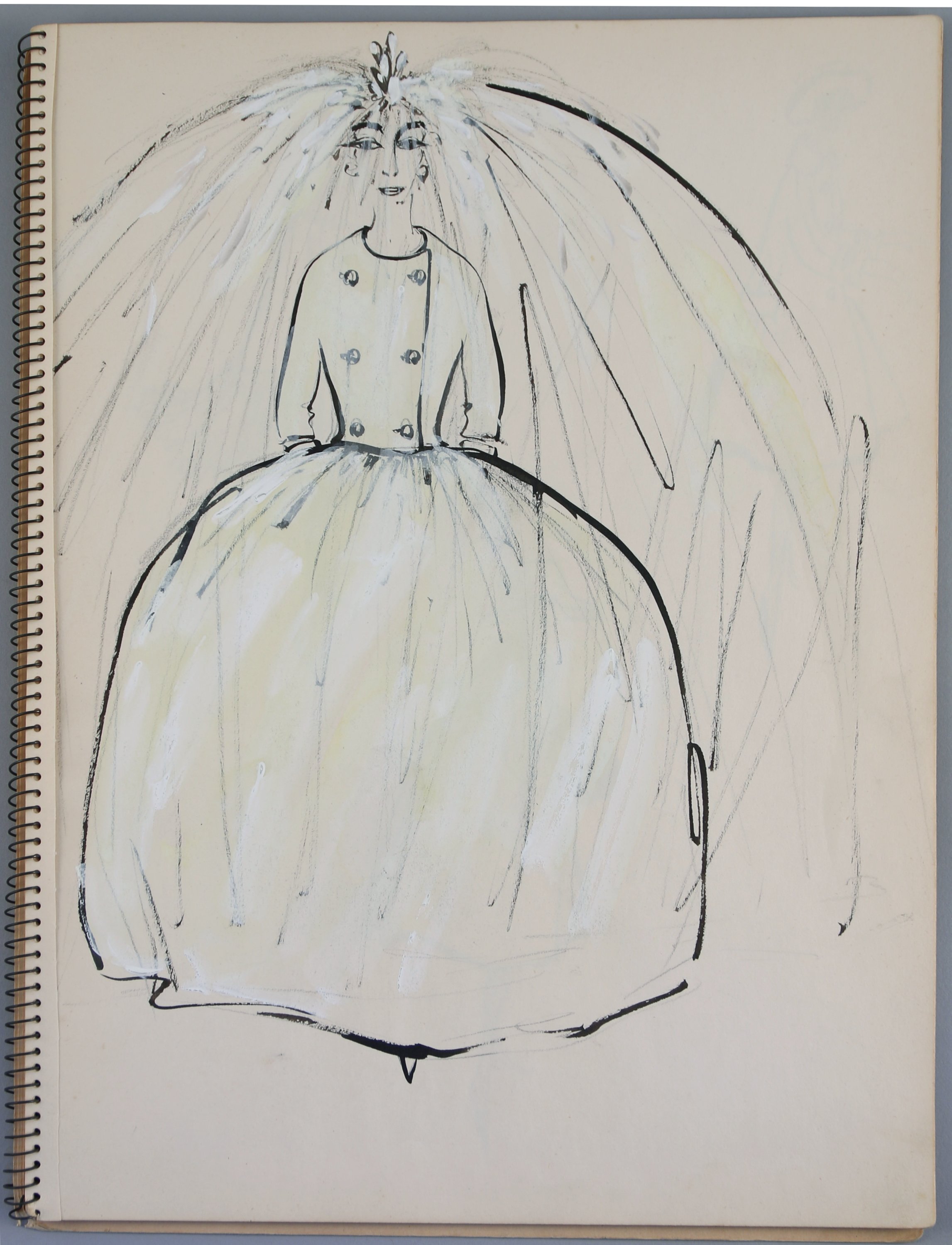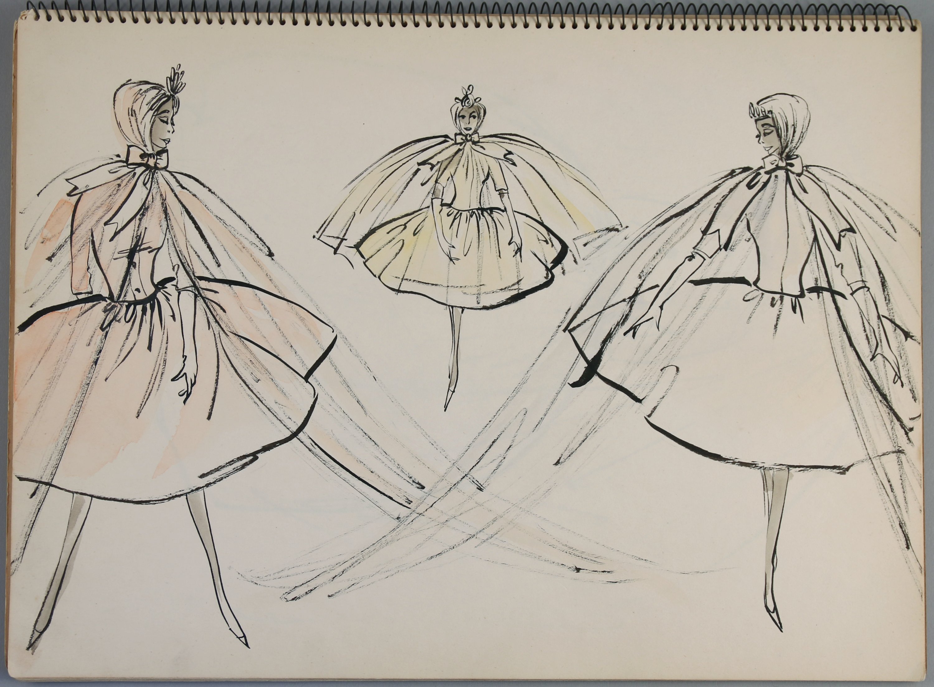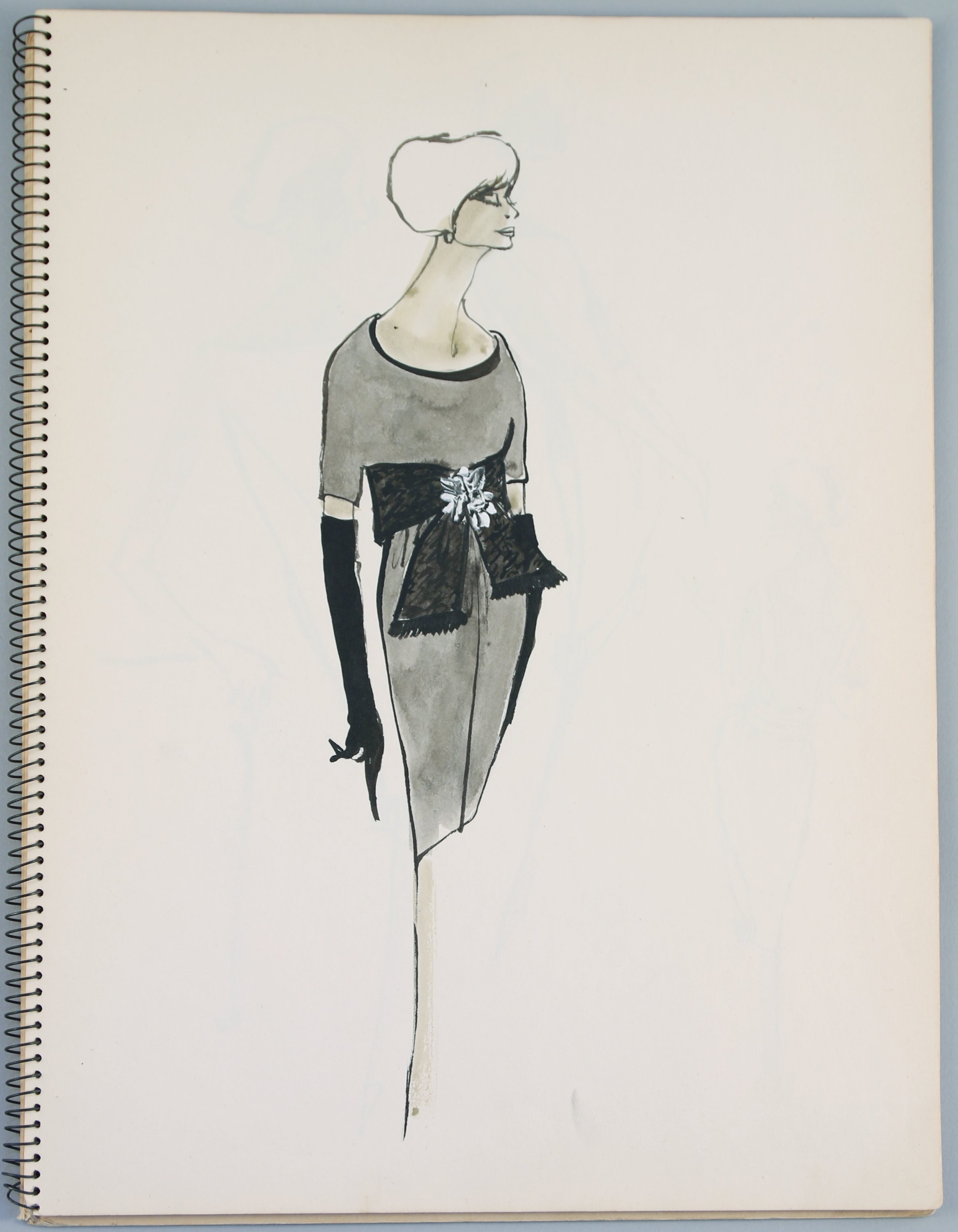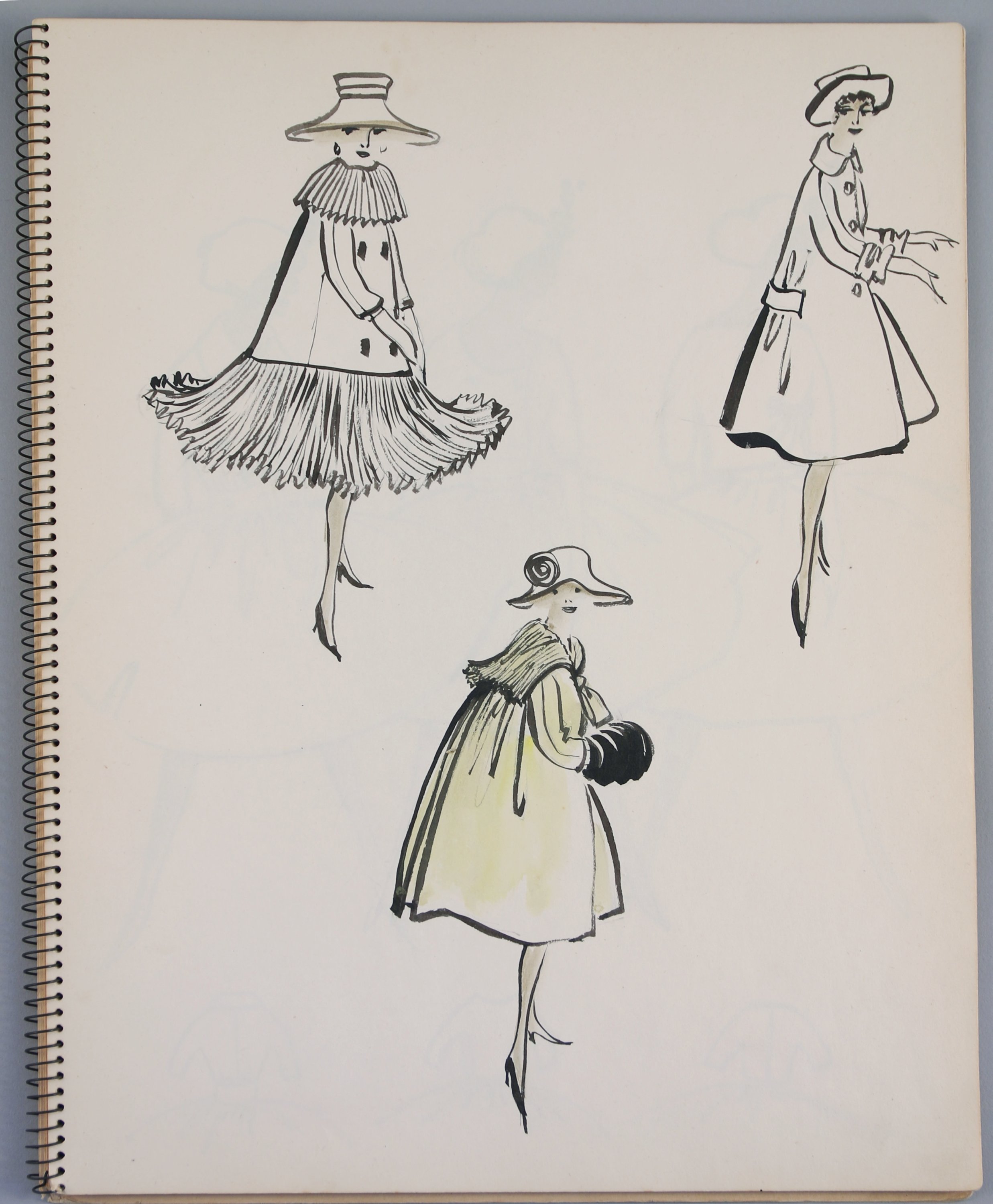 Si le jeune dessinateur italien René Gruau illustre les créations de Balenciaga, Rochas ou Givenchy dès son arrivé à Paris dans les années 1930, nos carnets sont à rapprocher de dessins réalisés pour Christian Dior (Ader, n°419 et 420, 18 novembre 2016) et Jacques Fath. Nos dessins rappellent en effet les premières collections d'Yves Saint Laurent chez Dior, avec sa célèbre ligne Trapèze en 1958, dont on retrouve la ligne d'épaule et l'encolure dégagée. De nombreuses maisons, comme celle de Jacques Heim, s'inspirent également de cette ligne, ainsi qu'en témoigne un carnet conservé au musée Galliera (2013.0.5).