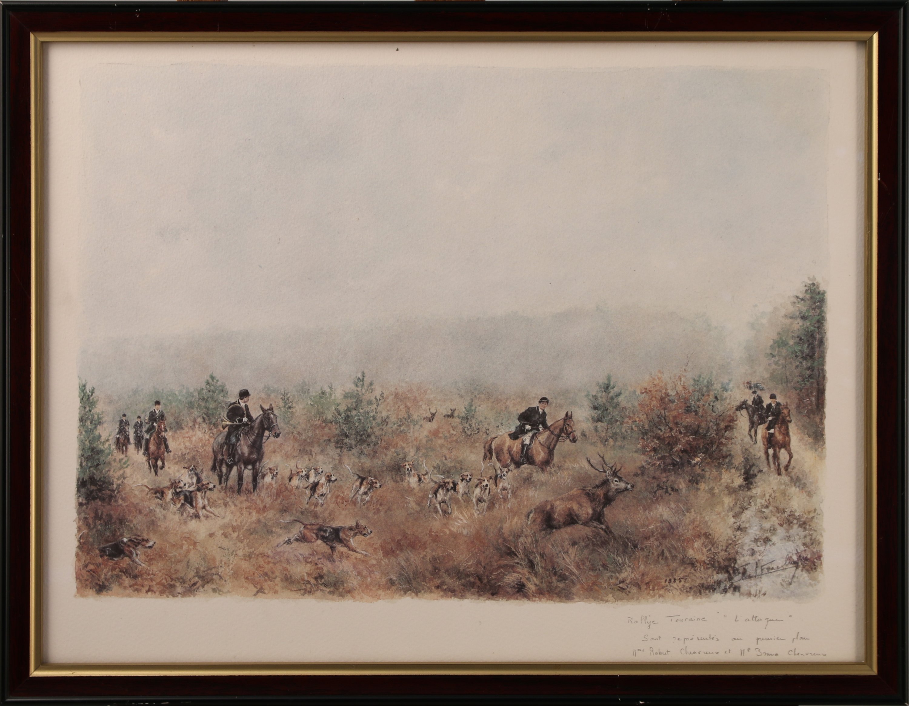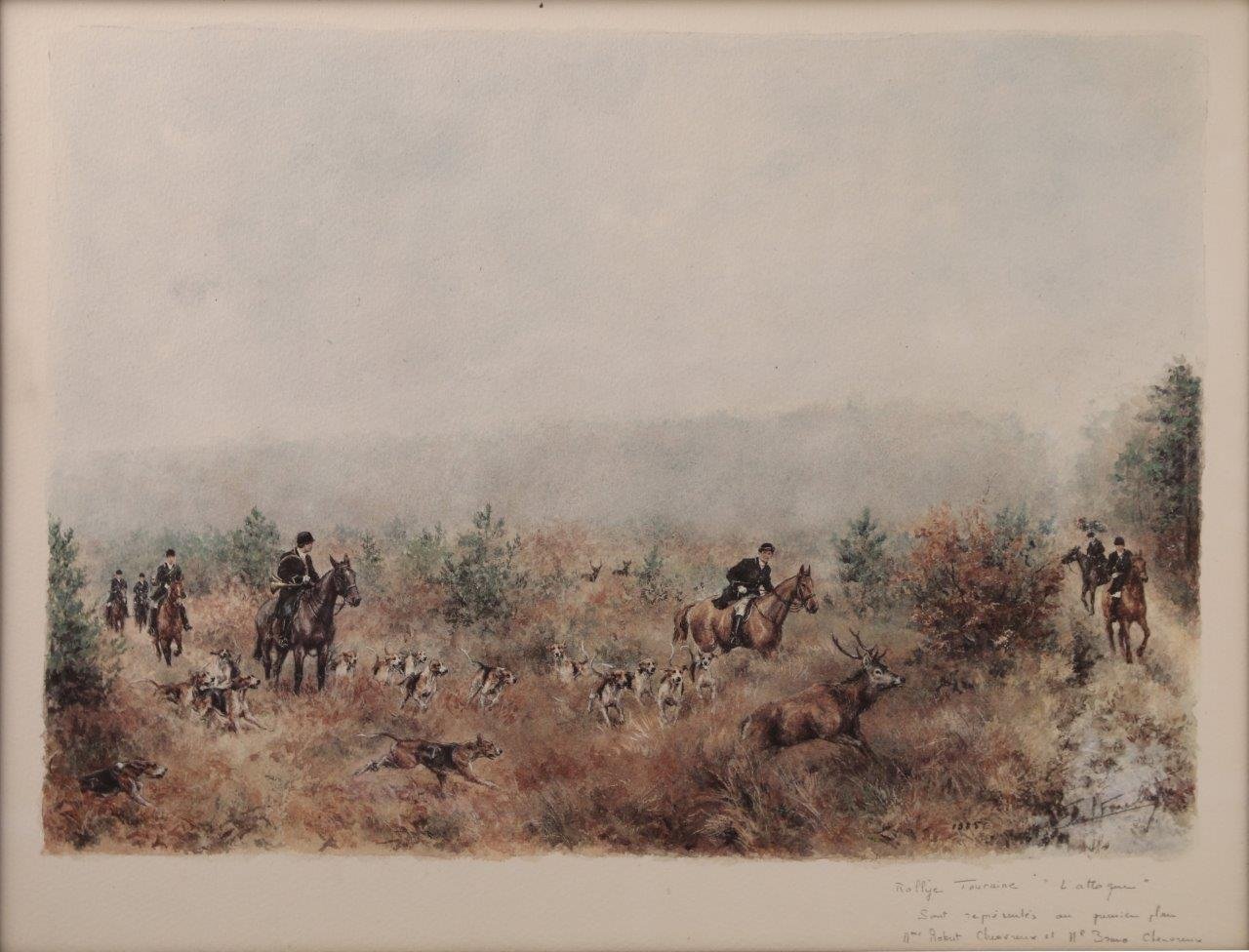 JOINT : une lithographie représentant une "Attaque" du Rallye Touraine en 1985 avec Mme Robert Cheuvreux et Me Bruno Cheuvreux" (25 x 35 cm) une reproduction en couleur d'une oeuvre de Karl Reille (13 x 18cm)