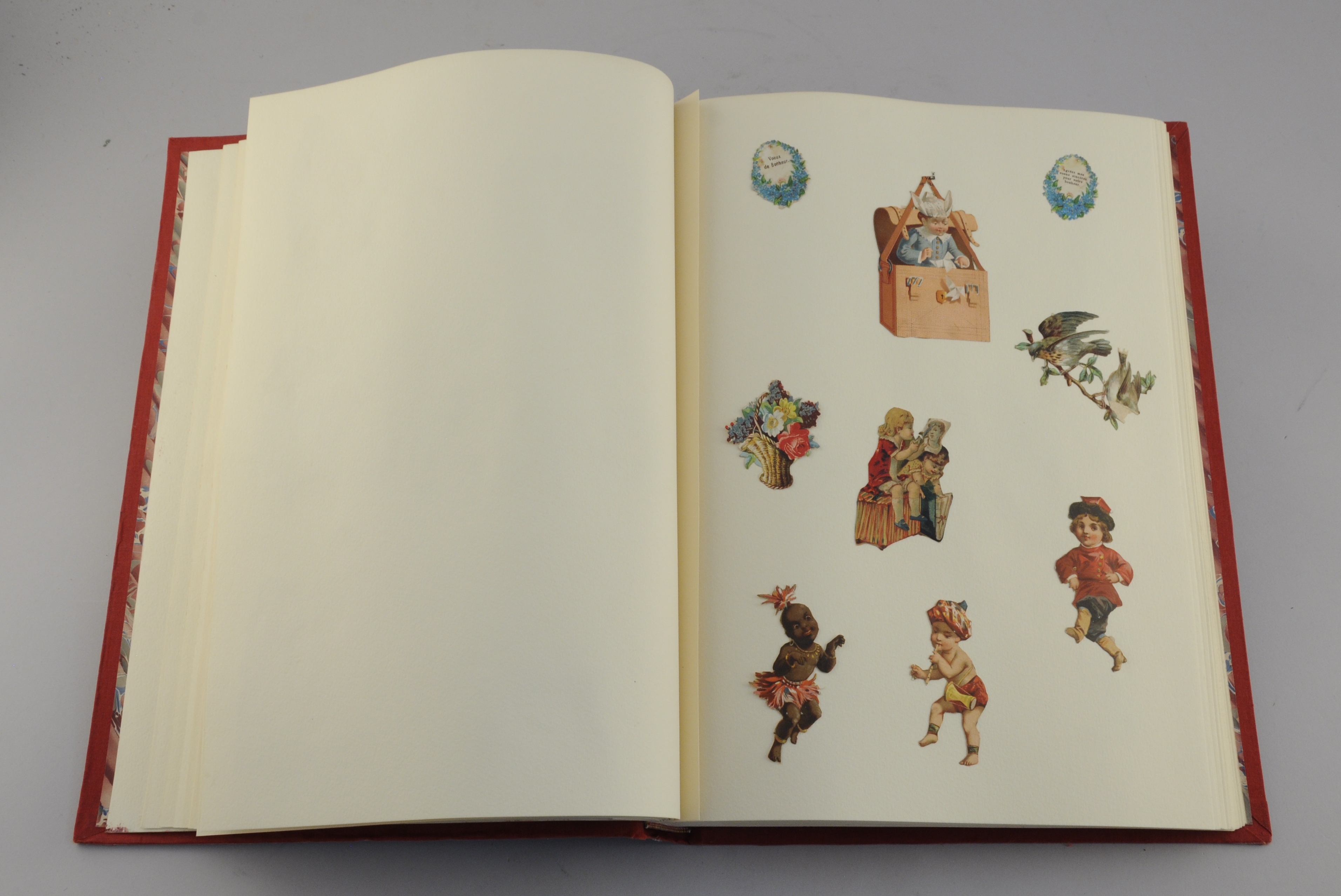 Riche ALBUM de CHROMOLITHOGRAPHIES enfantines, 58 pages. Il comprend de nombreuses images découpées et des cartes à collectionner dont Liebig, Trébucien, Suchard, Eysséric, Kaus ou encore Poulain.