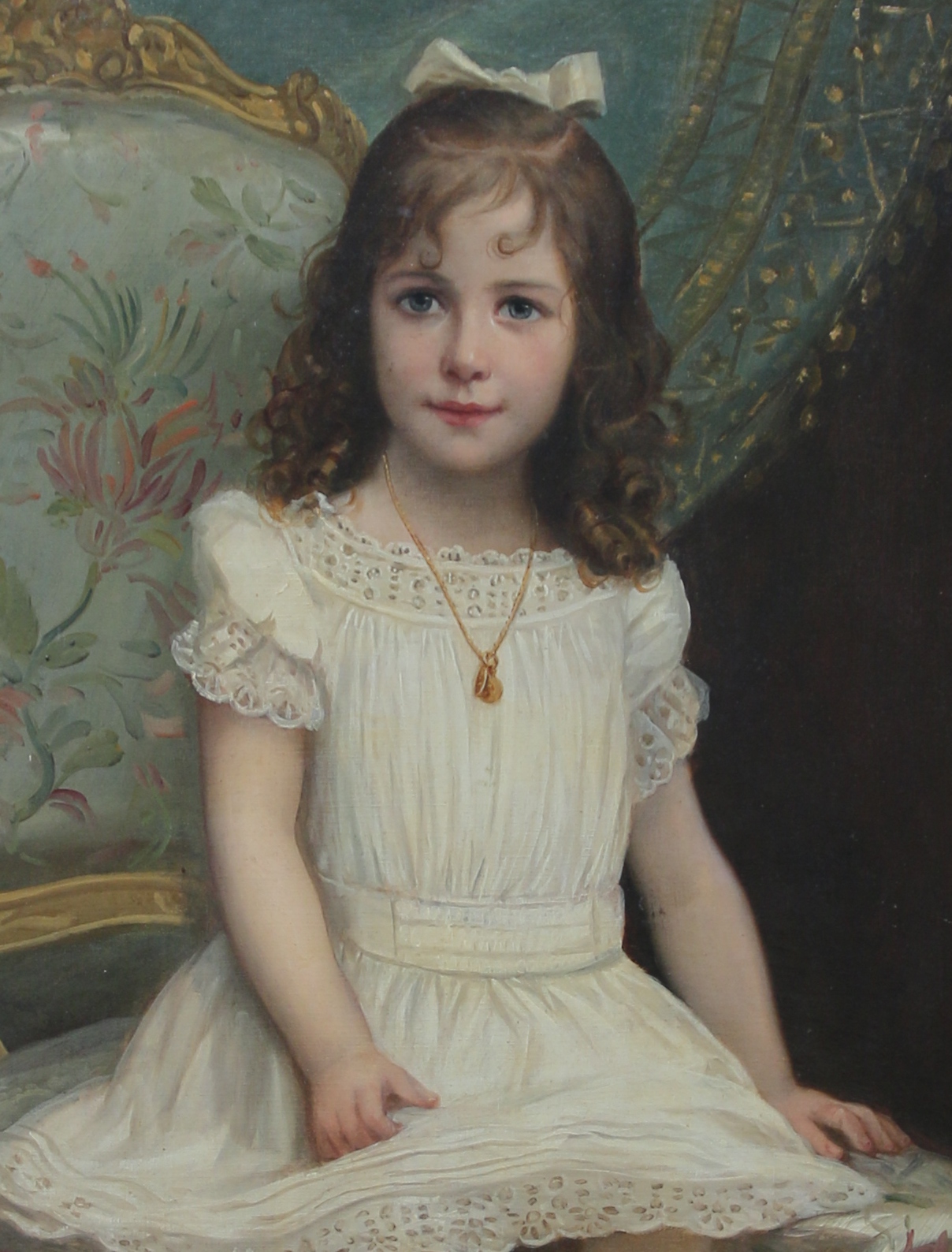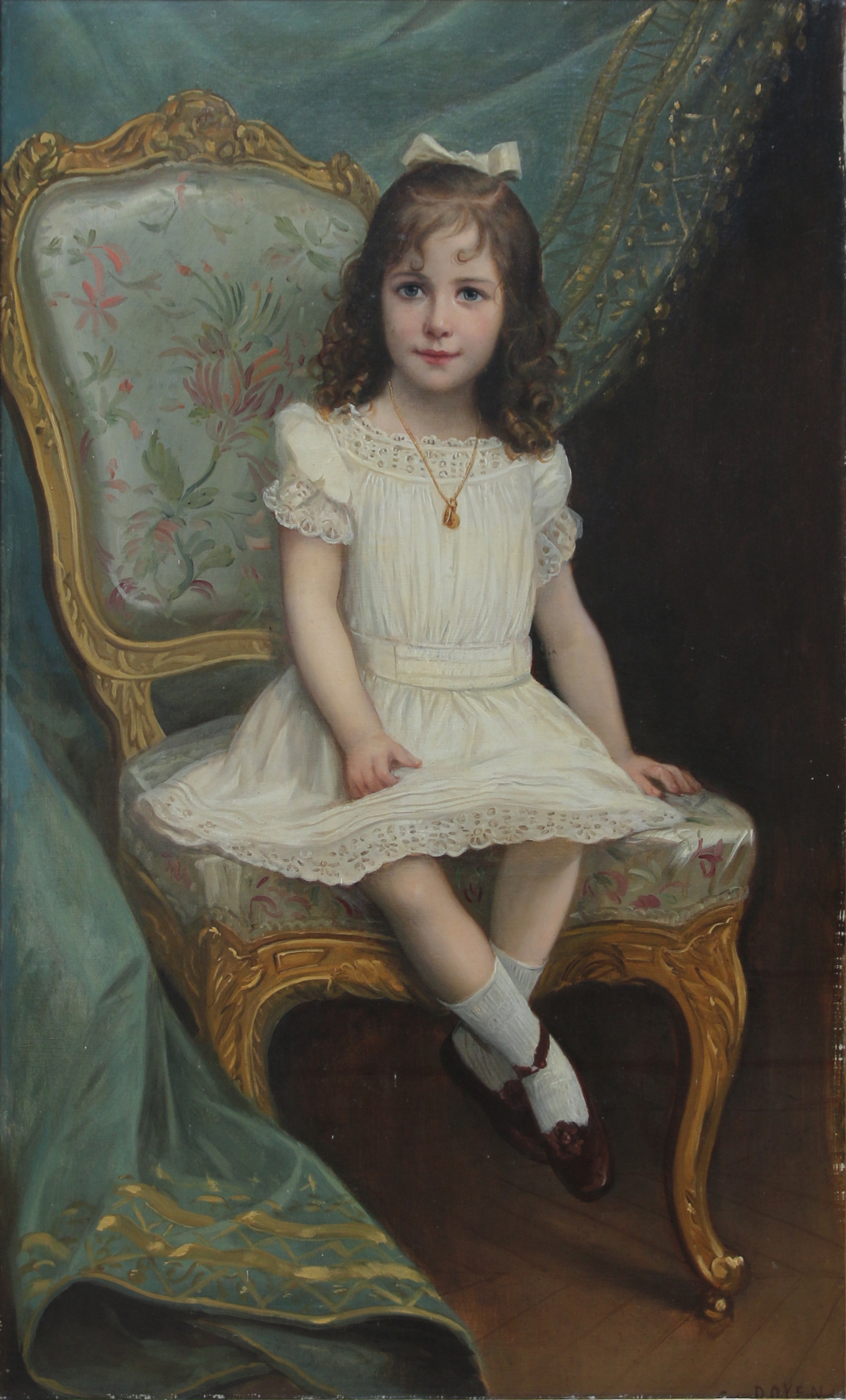 Portrait de Gabrielle Dauvilliers (1888-1891) ?, en robe de mousseline blanche, assise sur une chaise en bois sculpté et doré.