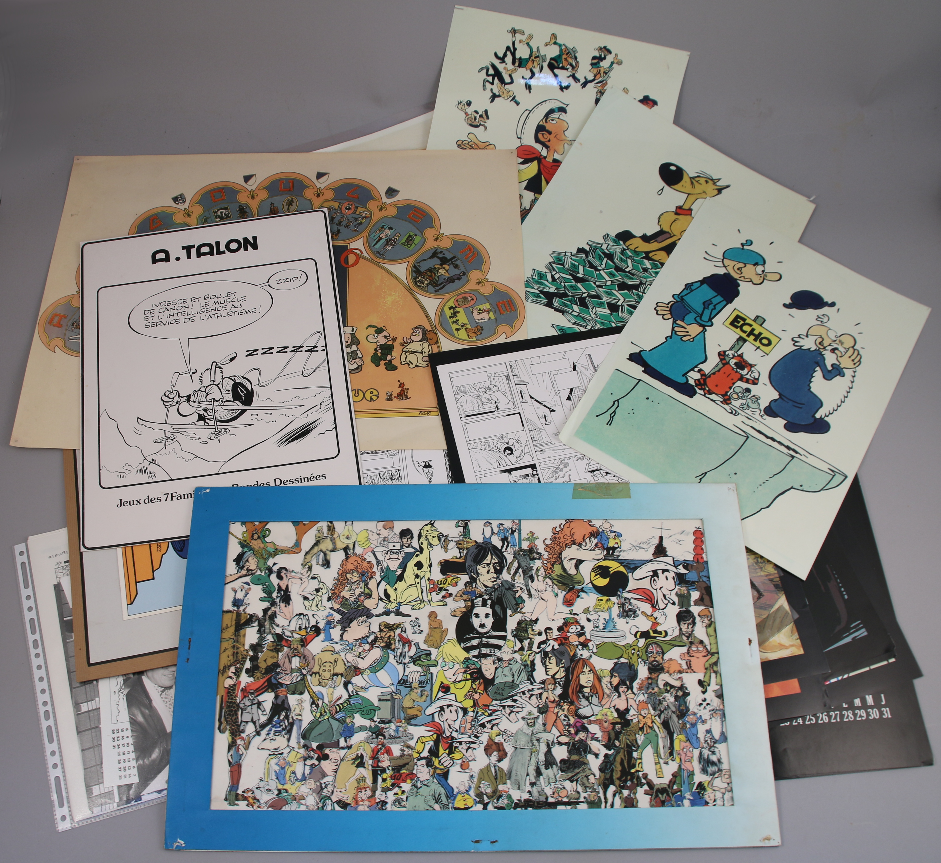 Ensemble de photos de dessinateurs, calendrier Dargaud 1984, dessins et celluloïds imprimés dont Léonard, Percevan, un grand calque avec de multiples personnages de bande dessinée pour les attachées de presse de la maison Dargaud.