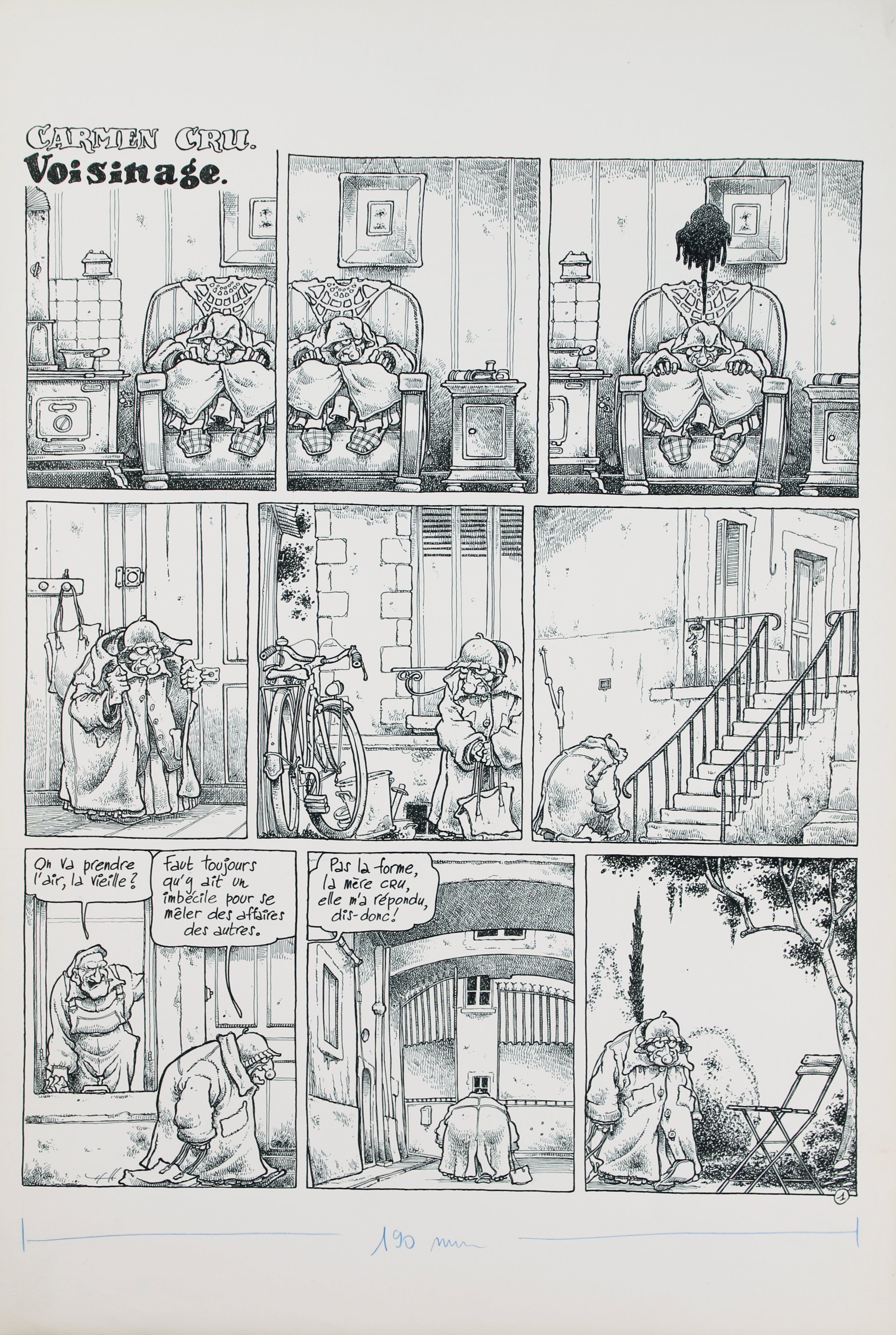 1ère planche de l'histoire (5 planches au total) publiée dans le magazine Fluide Glacial et dans l'album n°2 " La dame de fer " en 1985.