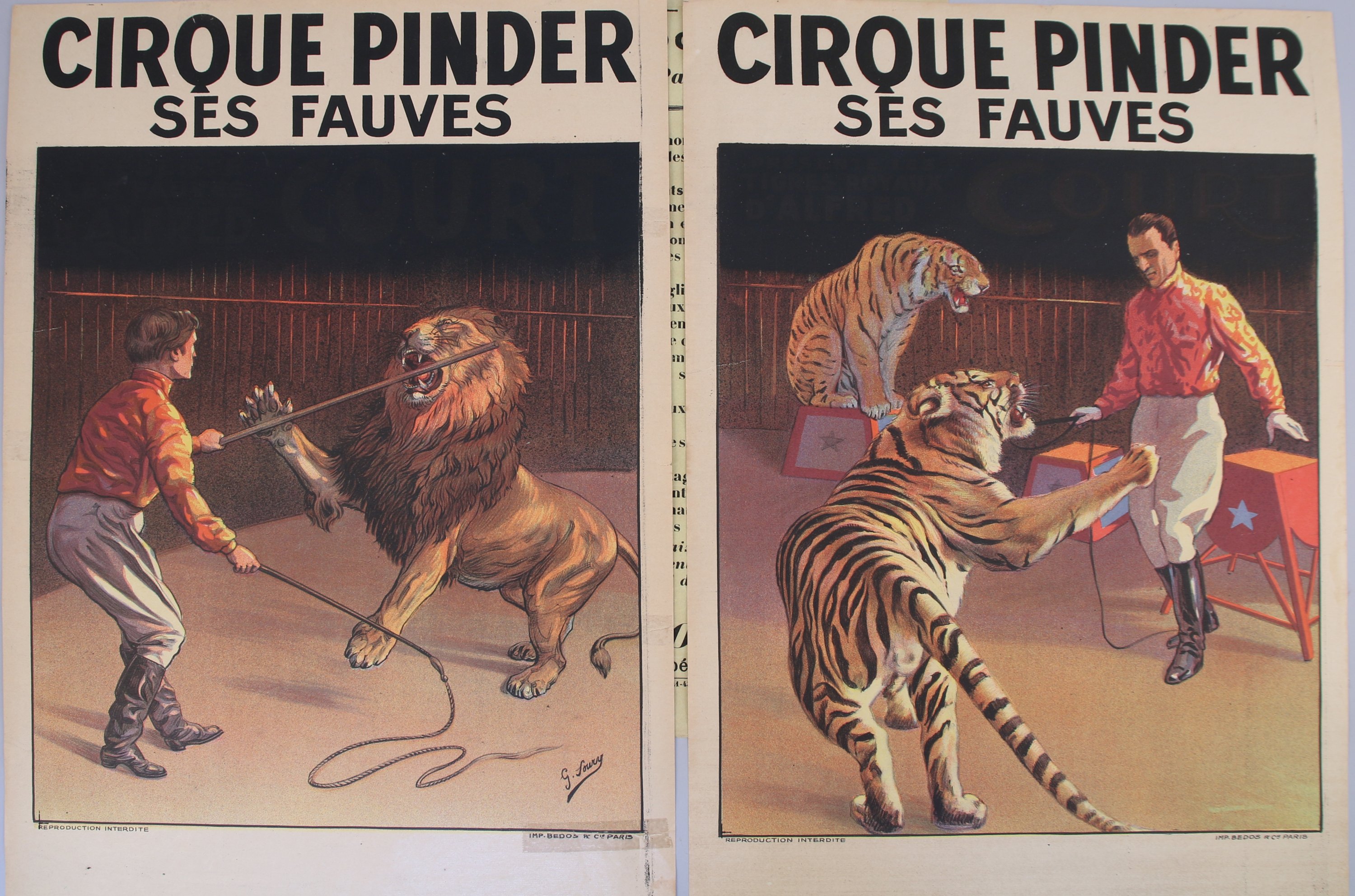 Dont deux affiches d'après G. Foury "Cirque Pinder ses Fauves" (59,5 x 40 cm petits accidents)