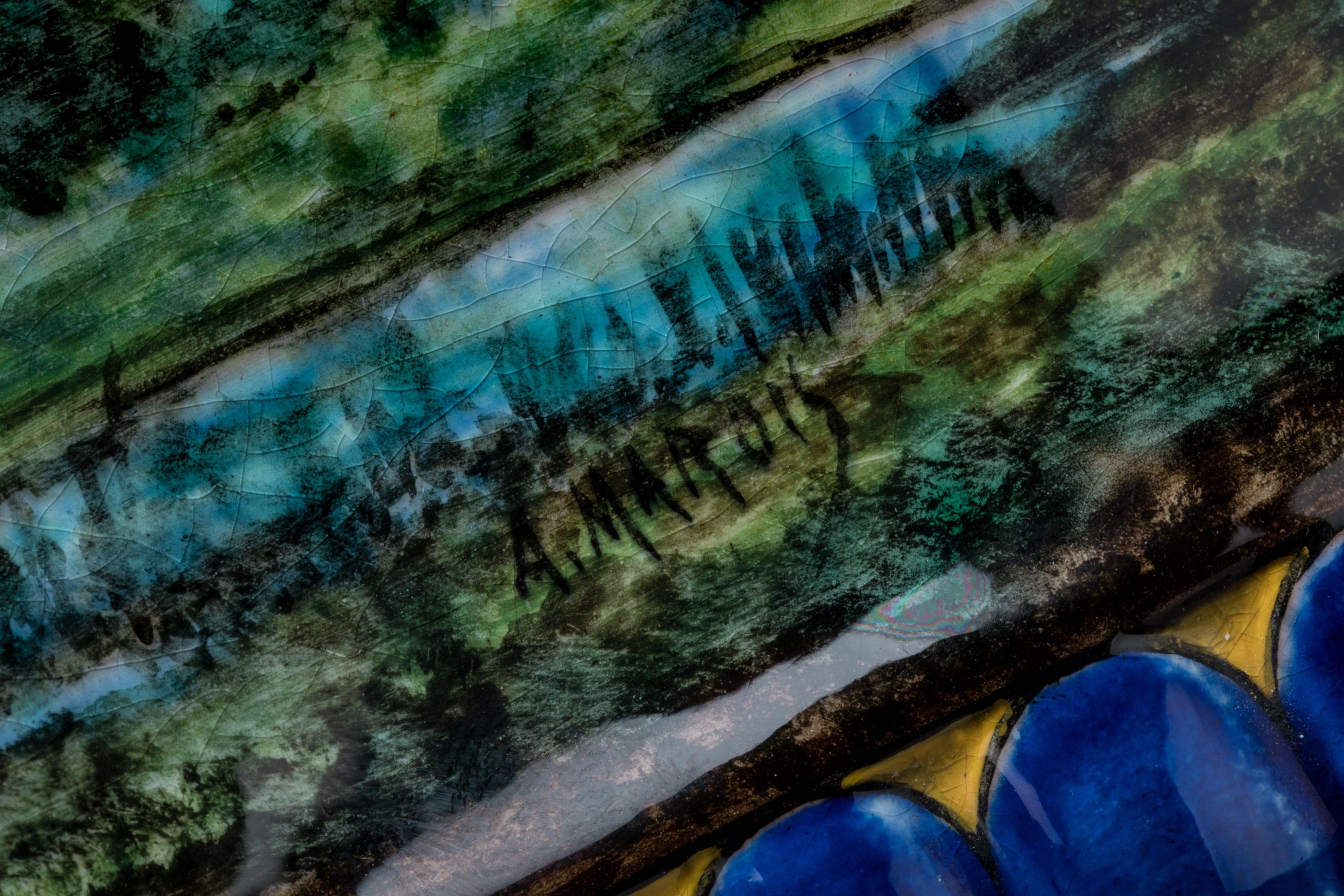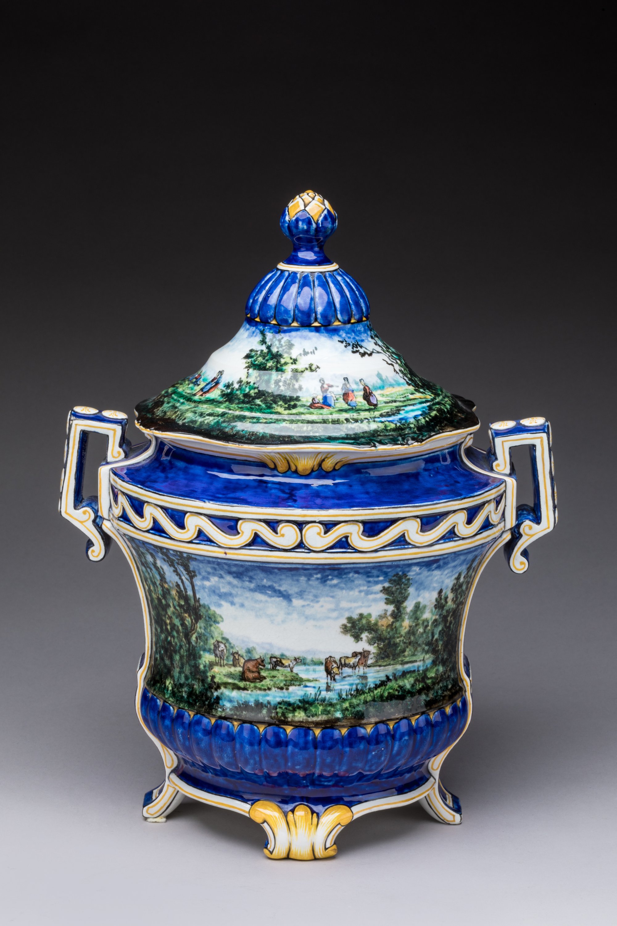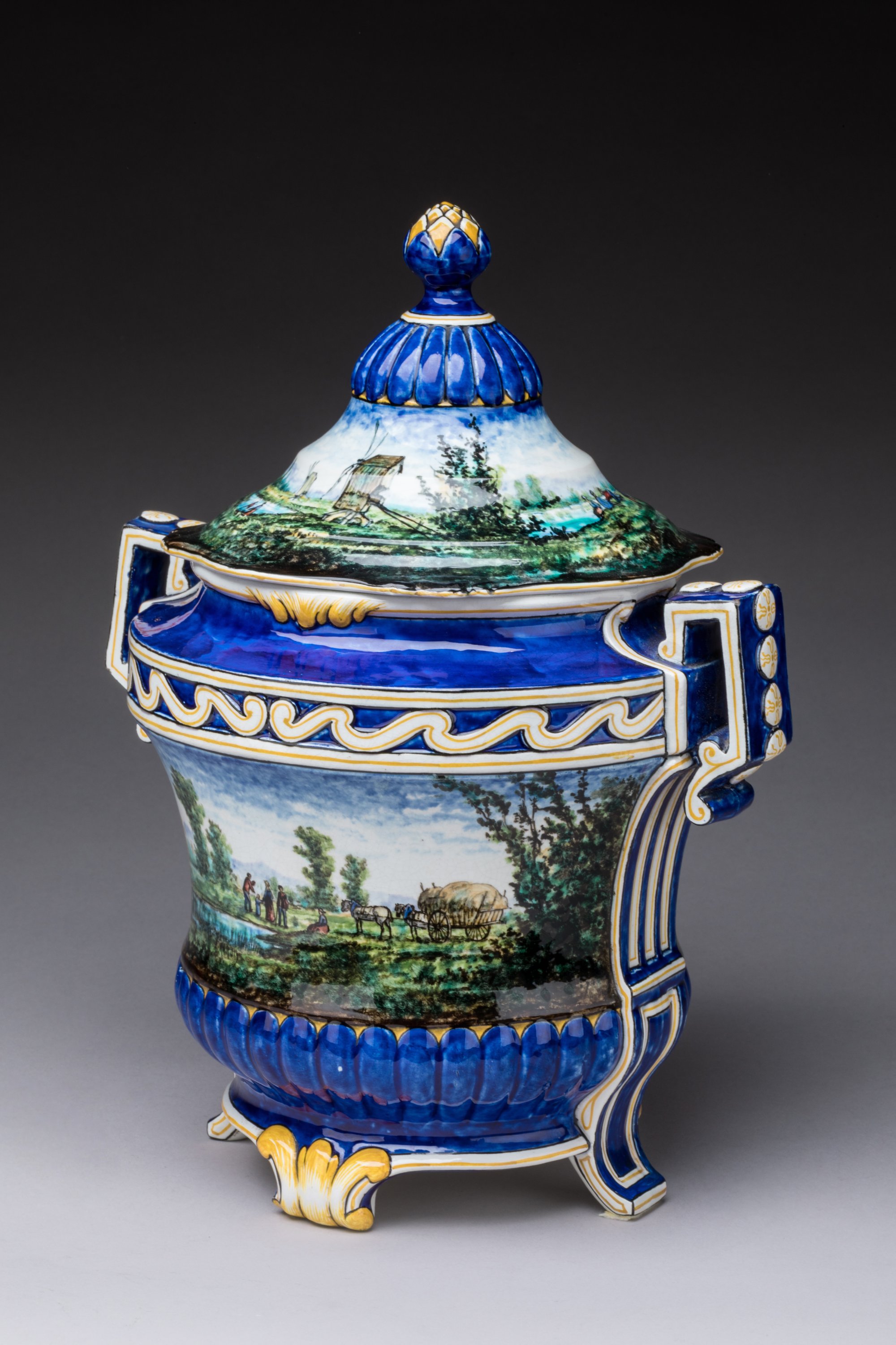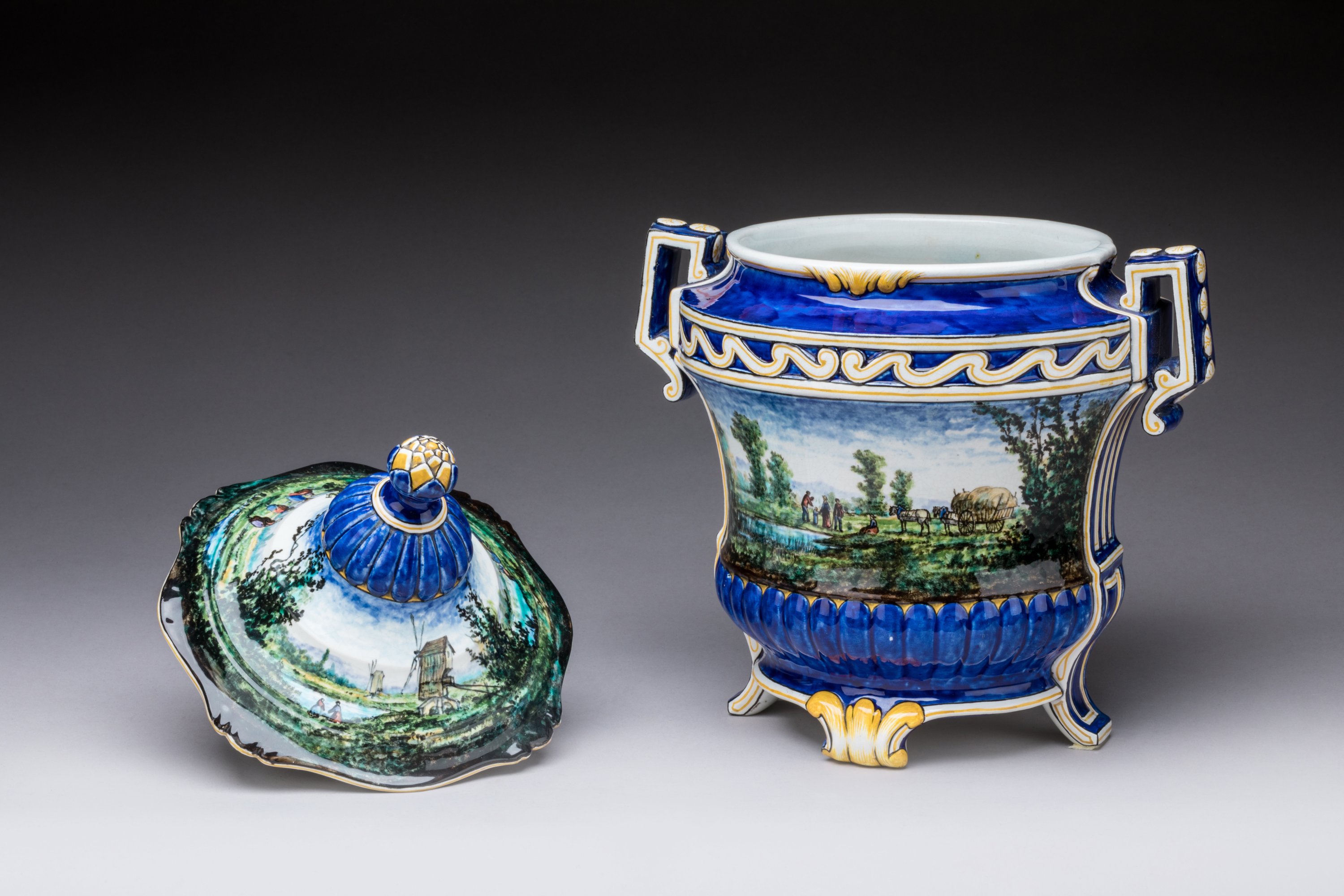 en céramique émaillée au décor peint qui épouse tout le couvercle et s'inscrit dans deux cartouches sur le vase, signé dans le décor.