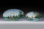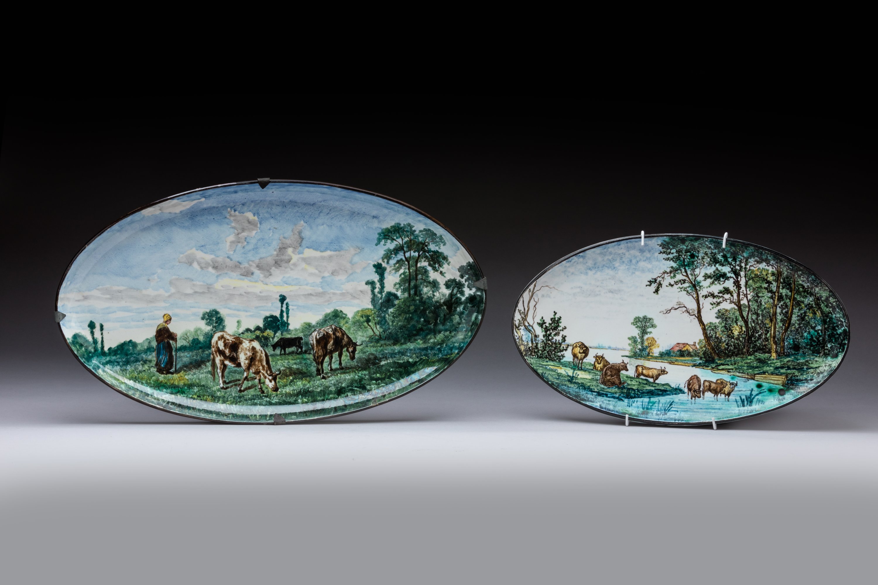 Deux plats ovales en céramique émaillée peinte dans le goût de Rosa Bonheur.