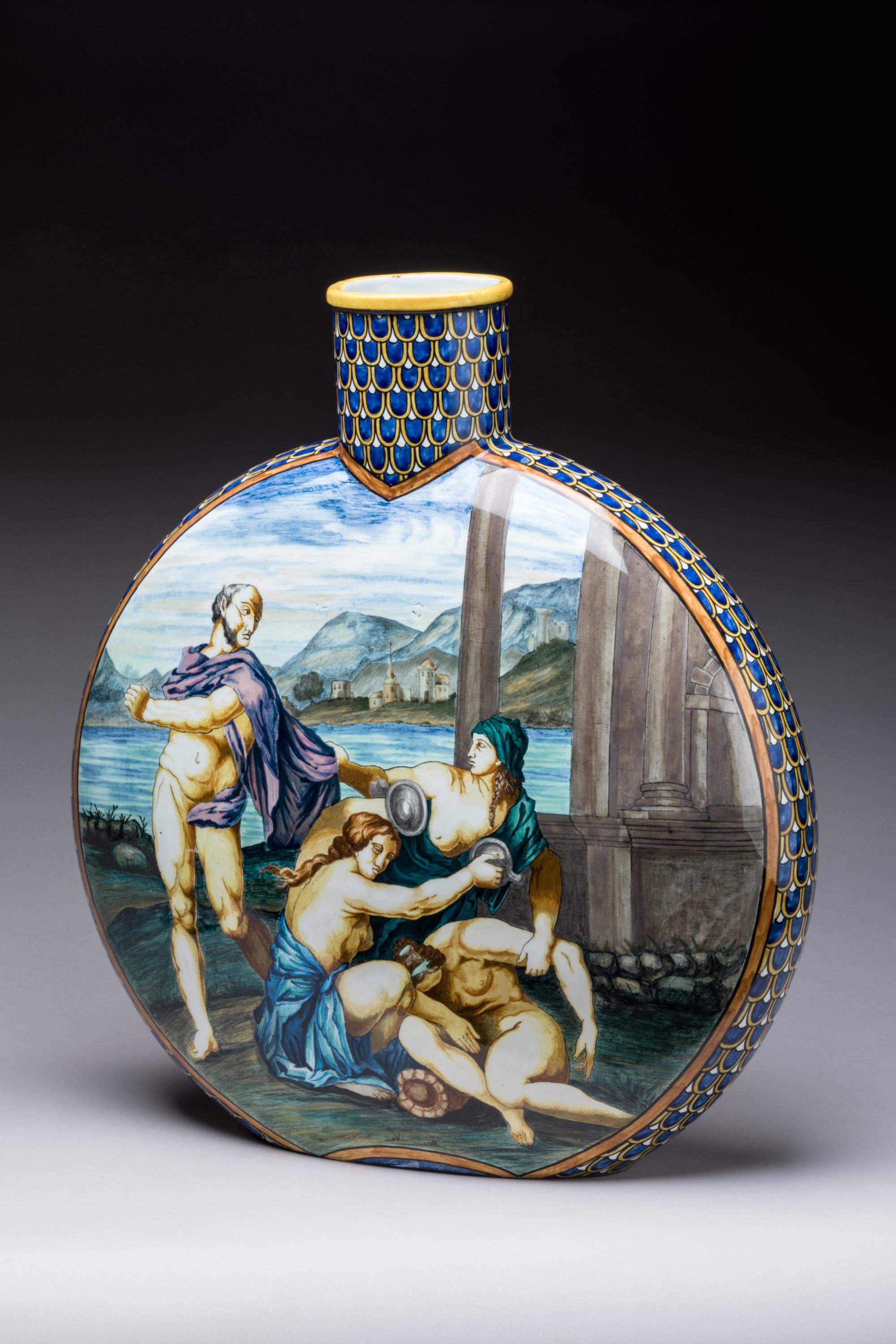 Impressionnante gourde plate en céramique émaillée peinte d'une face d'une scène de départ mythologique inspirée d'Homère et d'autre part d'une scène de bivouac de l'expédition de Charcot aux pôles.