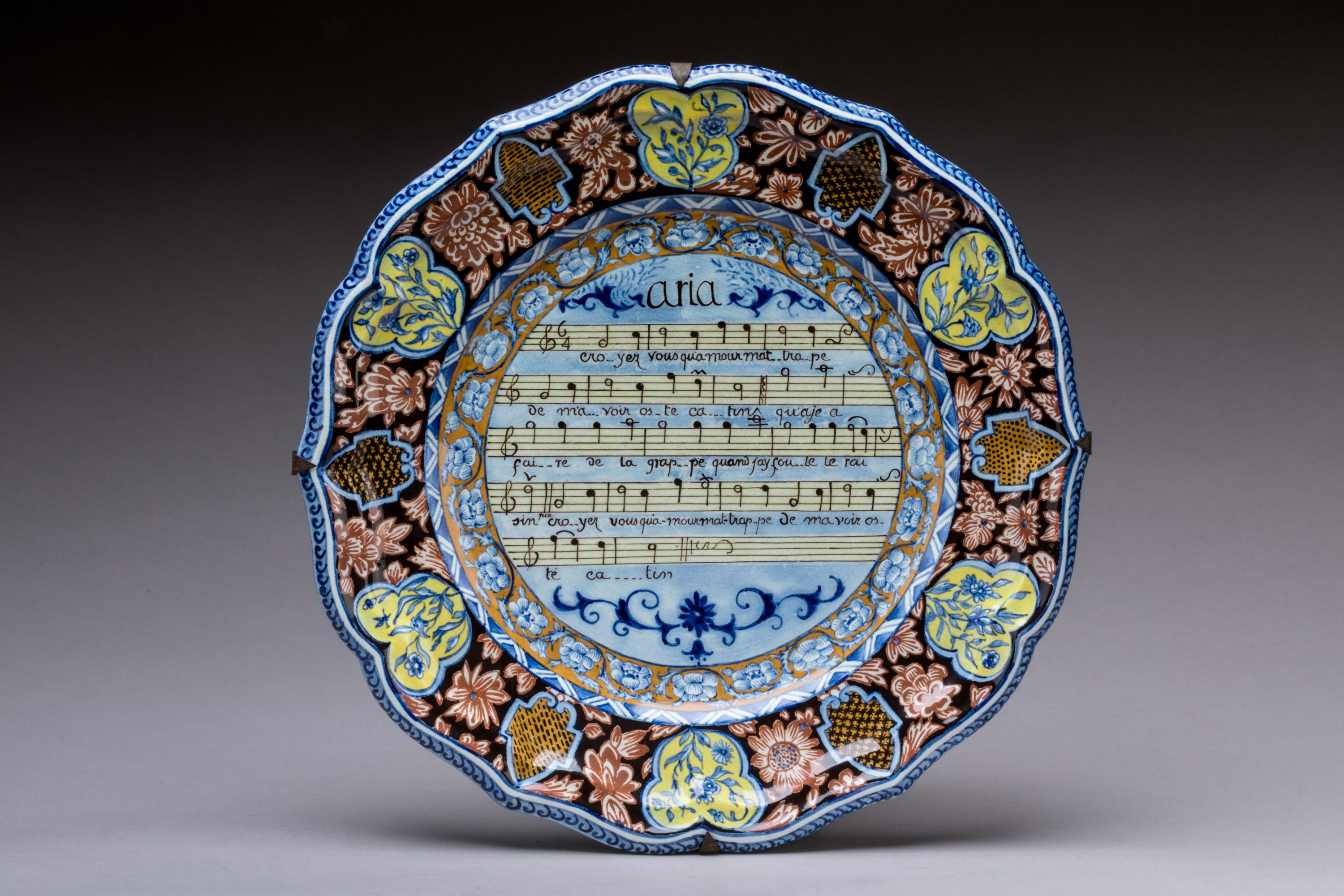 Assiette à bord contourné en céramique émaillée au décor peint d'une partition.