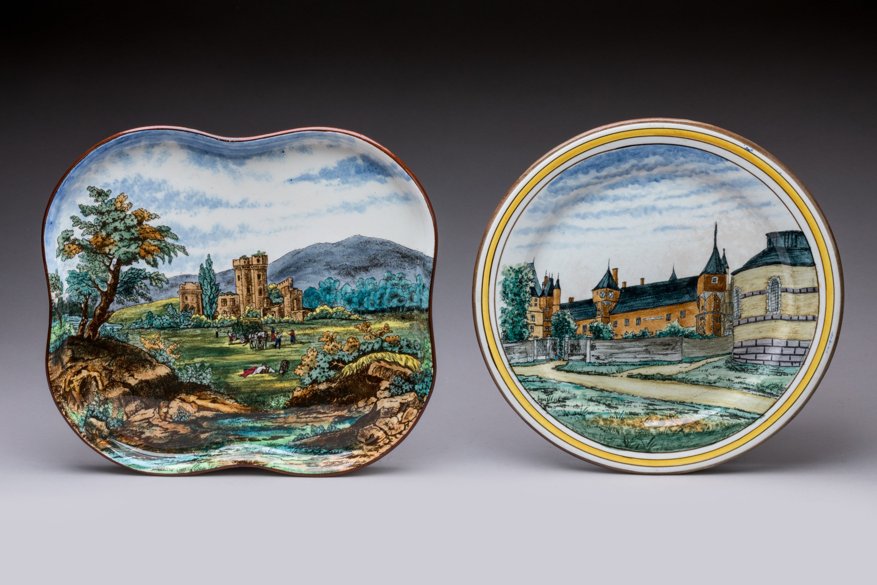 Assiette et sa gravure d'étude ainsi qu'un plateau de service fumeur (attribué à l'artiste) en céramique émaillée à décor peint.