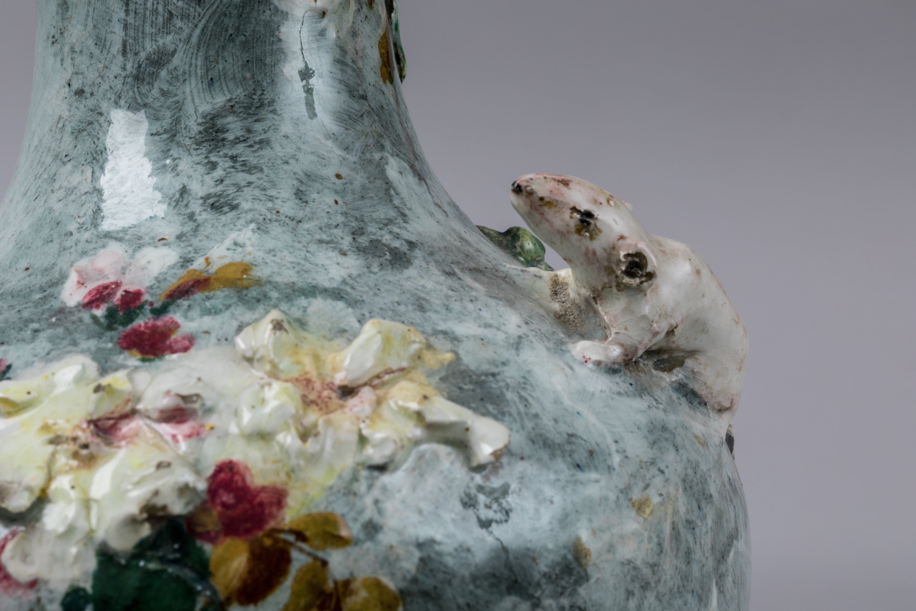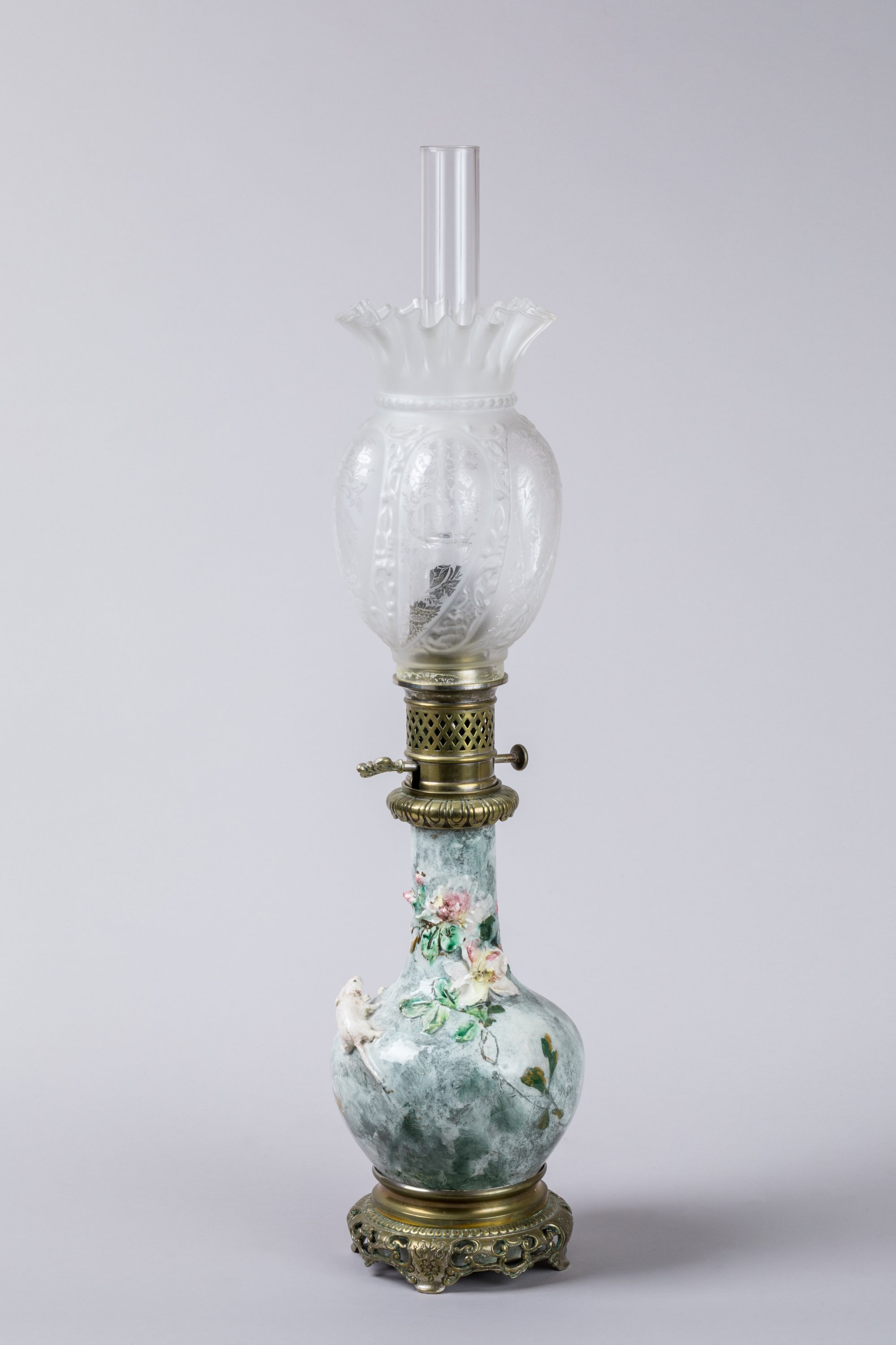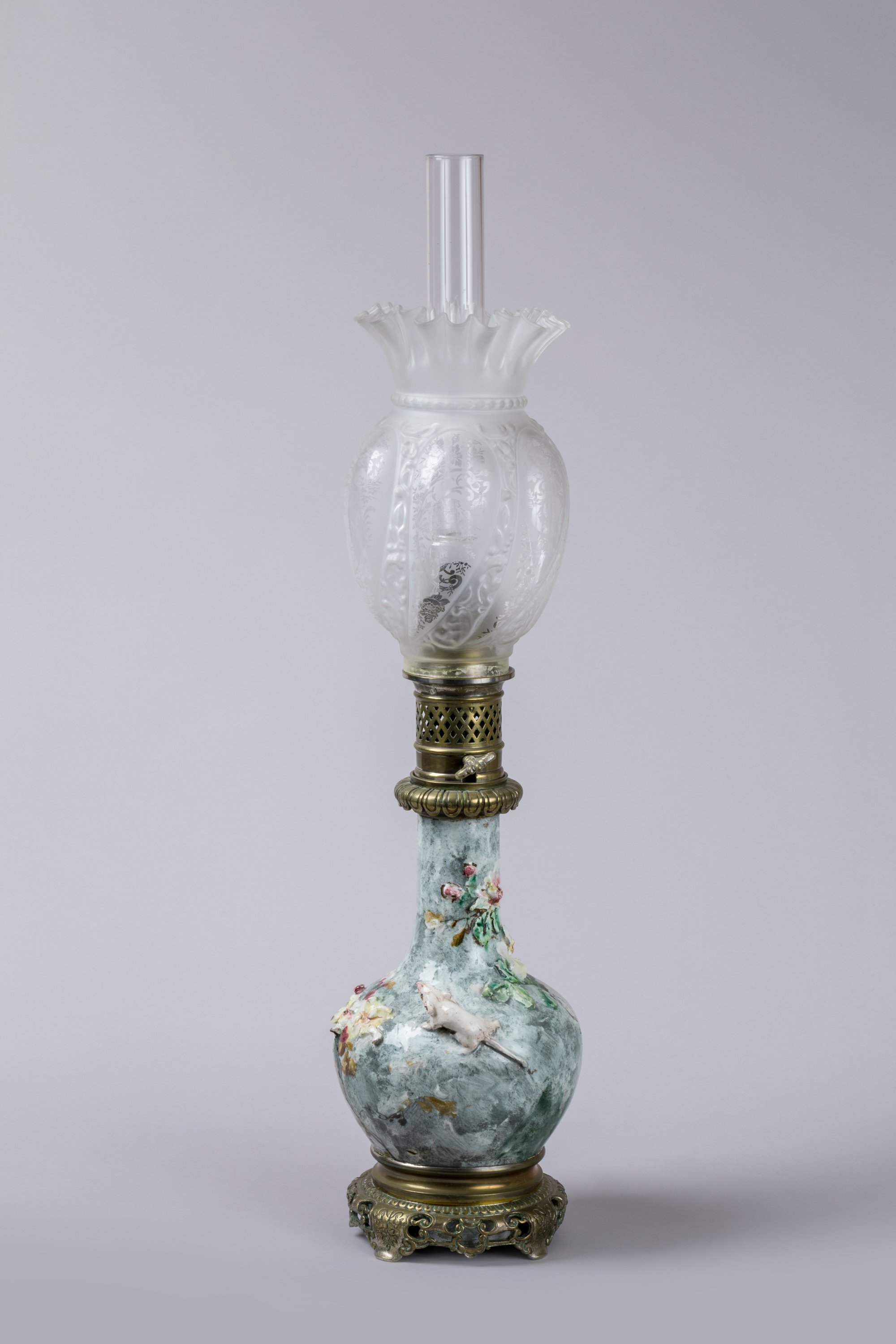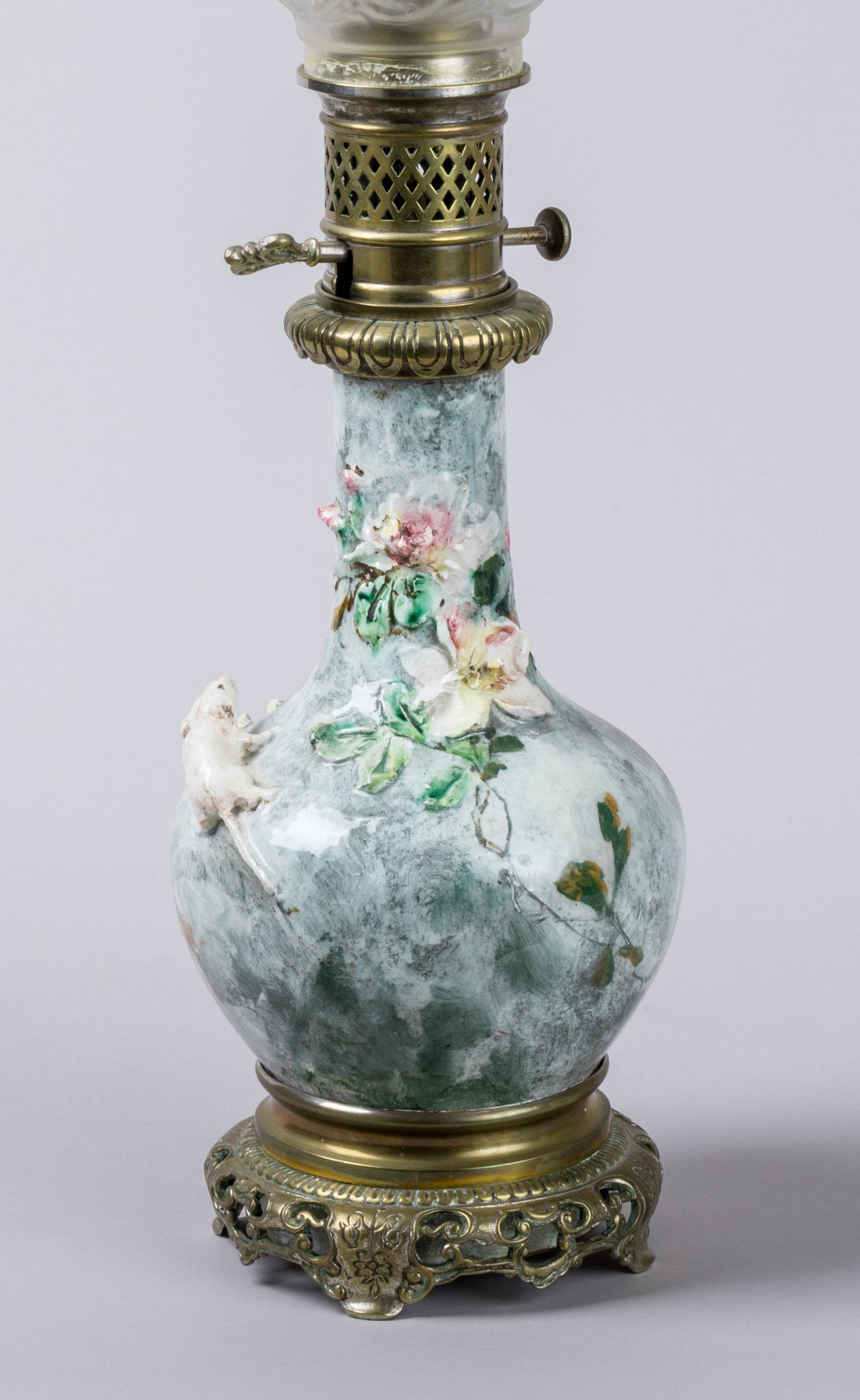 en barbotine impressionniste, une souris et un bouquet en applique. Dédicacée à Monsieur Guillier et signée "JeAn". Monture en cuivre, verrerie et globe de cristal gravé. Pièce unique.