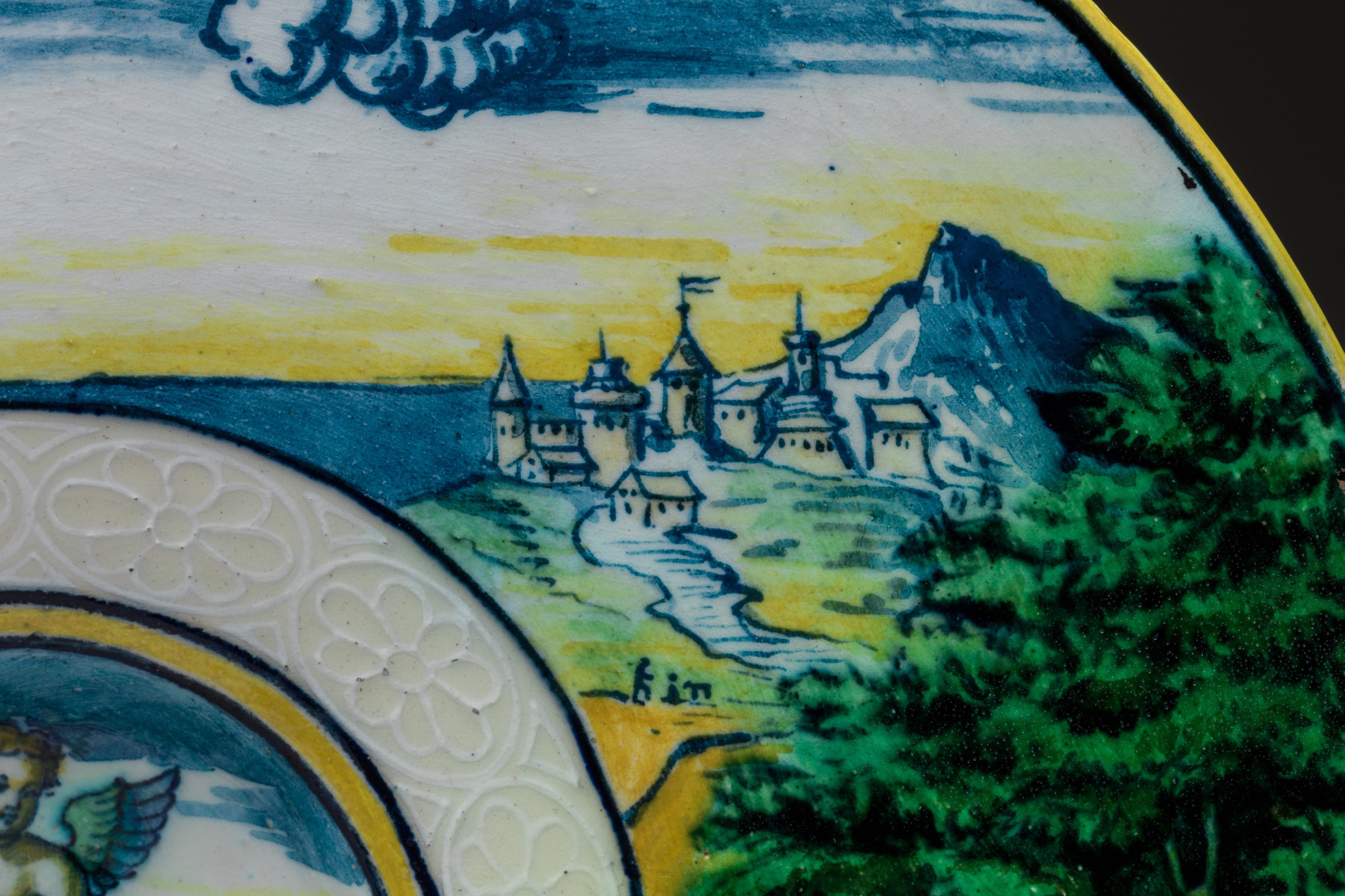 Très rare assiette en céramique émaillée à décor à historieto dans le goût de la Renaissance.