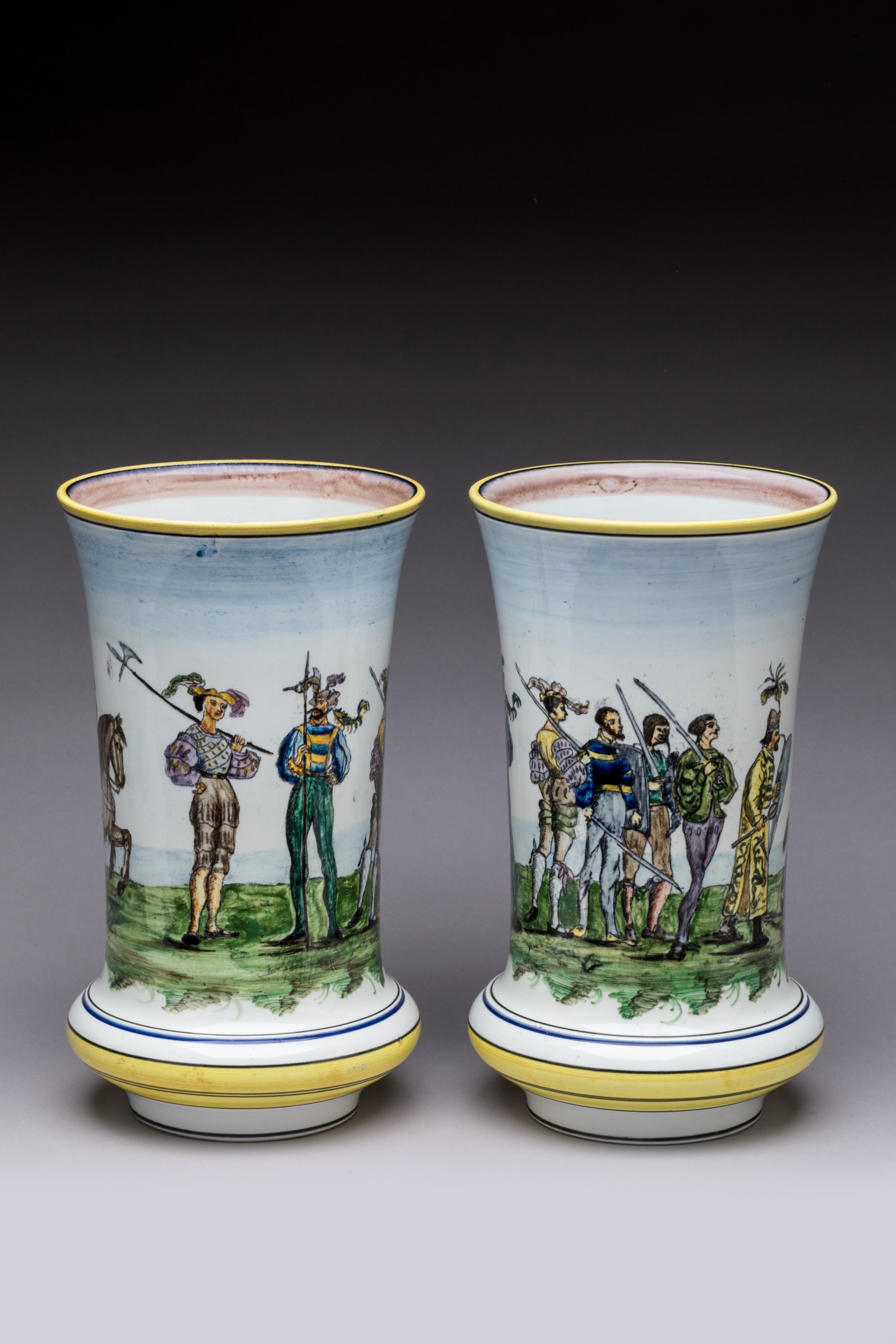 en céramique émaillée, à la panse enflée, à décor peint de frises de guerriers, signé dans le décor.