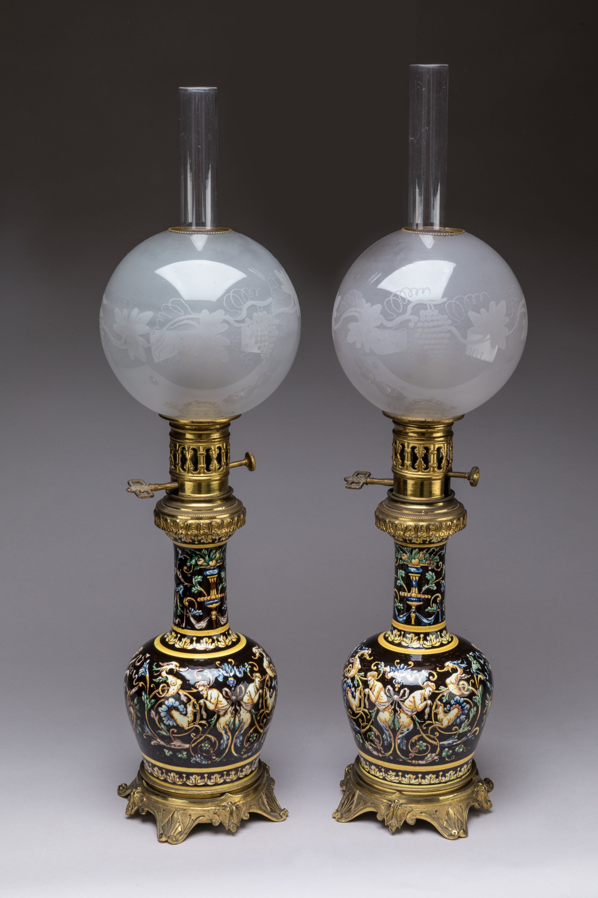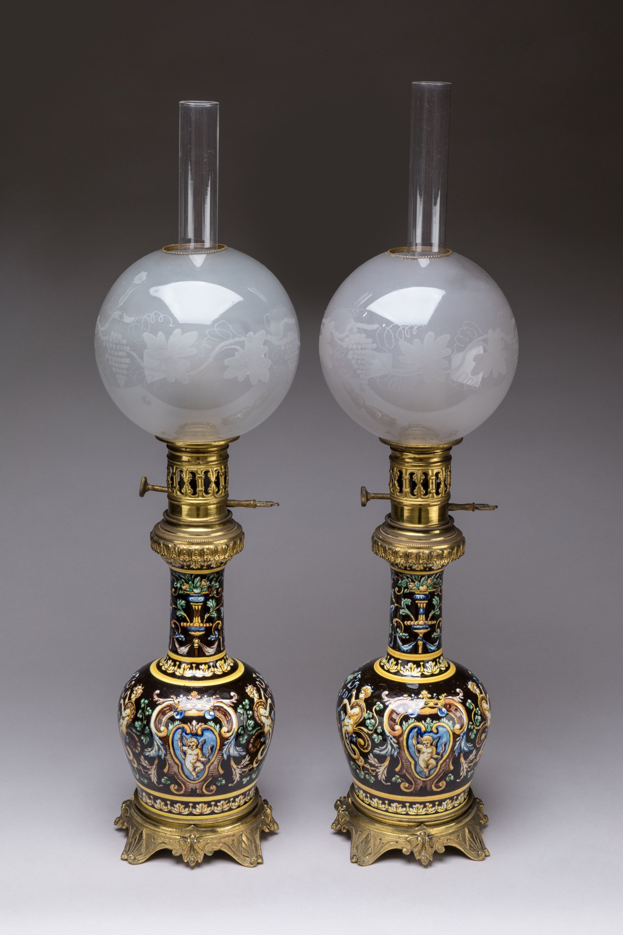en céramique émaillée de la Renaissance italienne à fond noir. Monture en cuivre, globe et tubes en vert.