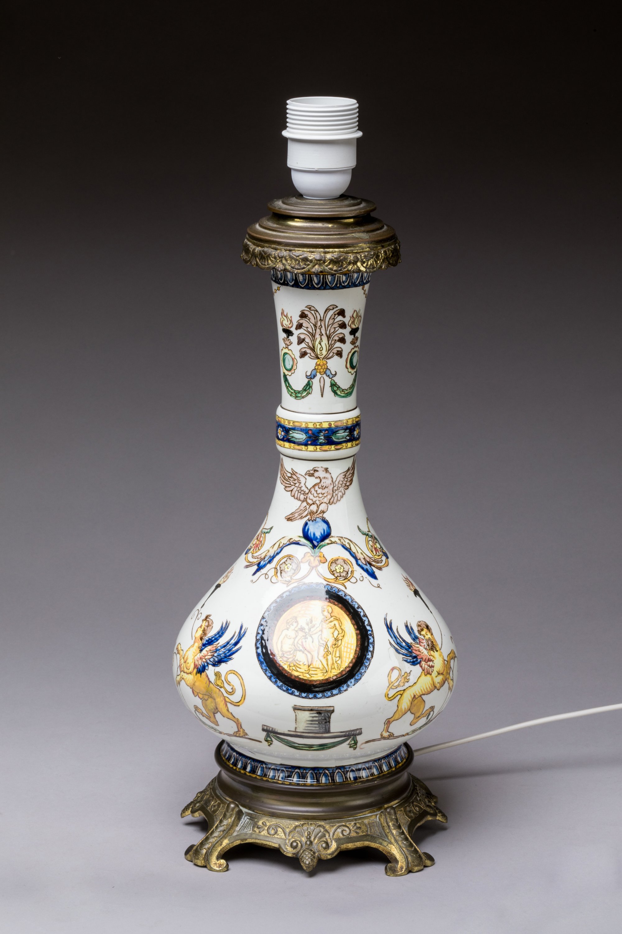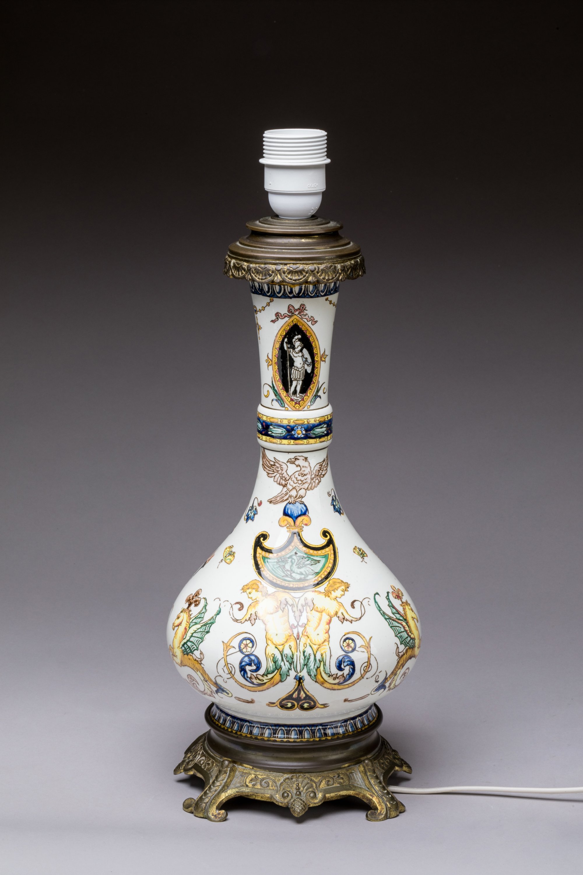 en céramique émaillée de la Renaissance italienne à fond blanc avec des cartouches peints. Montée à l'électricité.