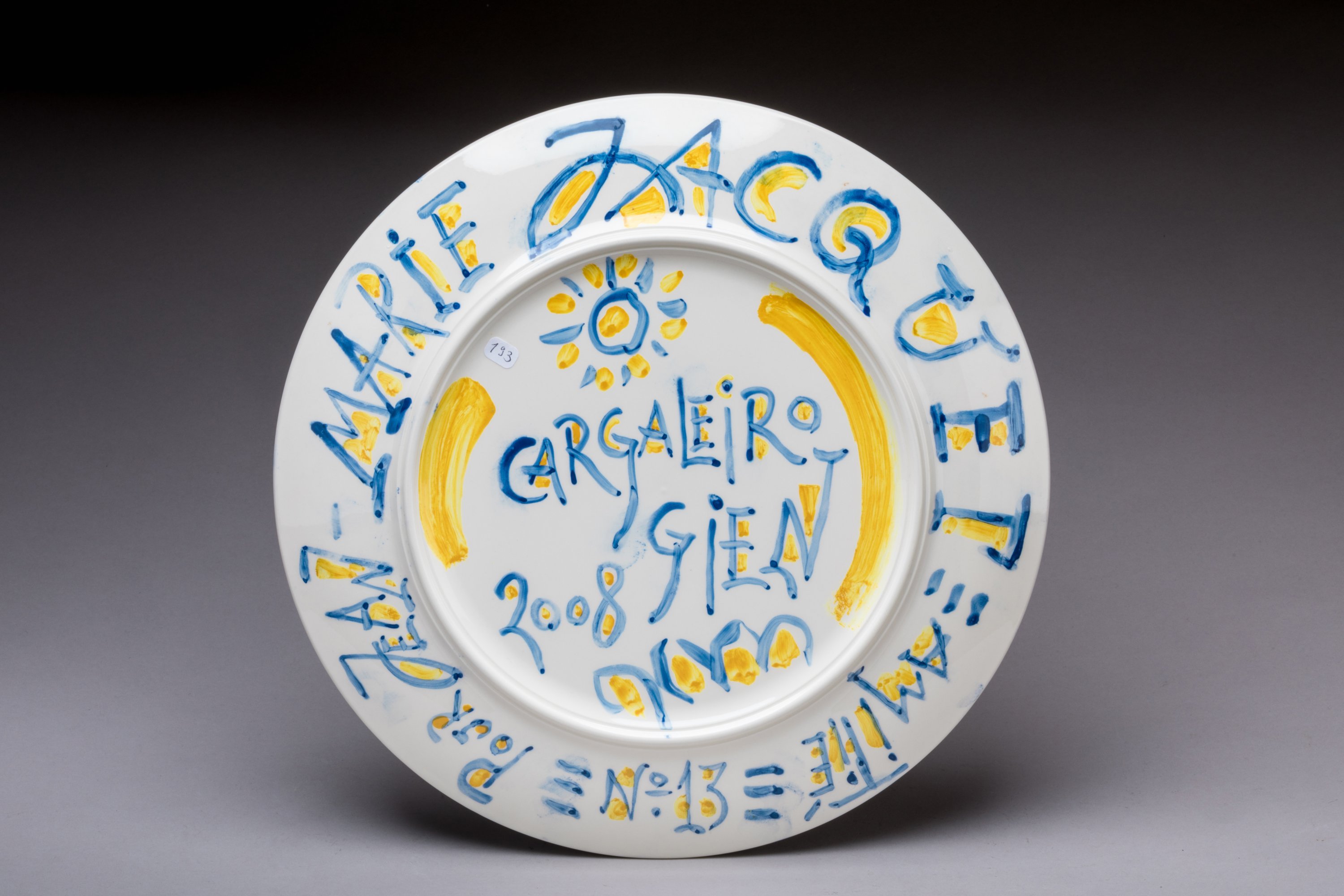 Marque de Gien olographe, monogrammé, avec dédicace "pour Jean-Marie Jacquet", amitiés, n°13. et daté 2008.
