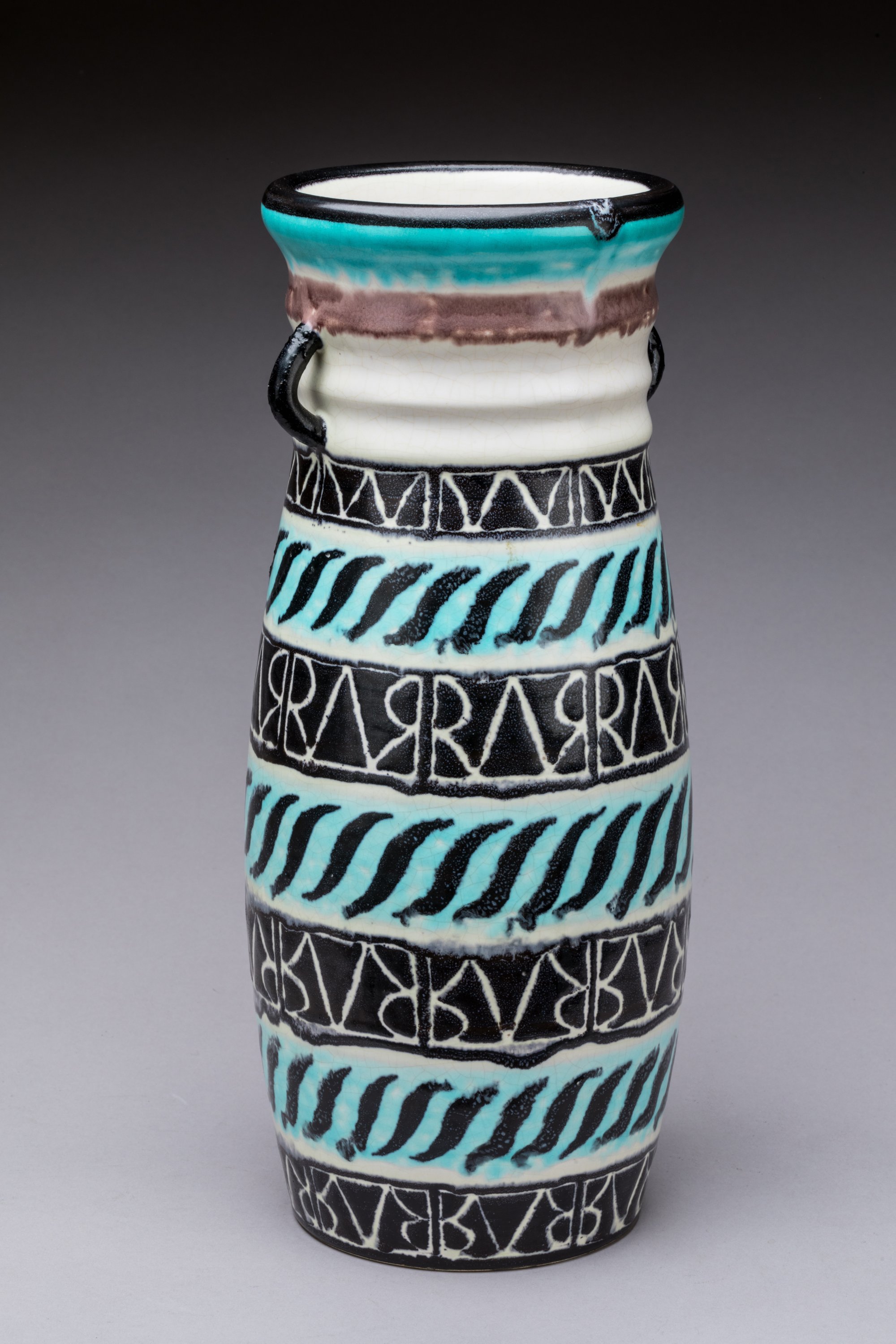 en céramique émaillée, peint de frise géométrique. Anses en demi-anneau.
