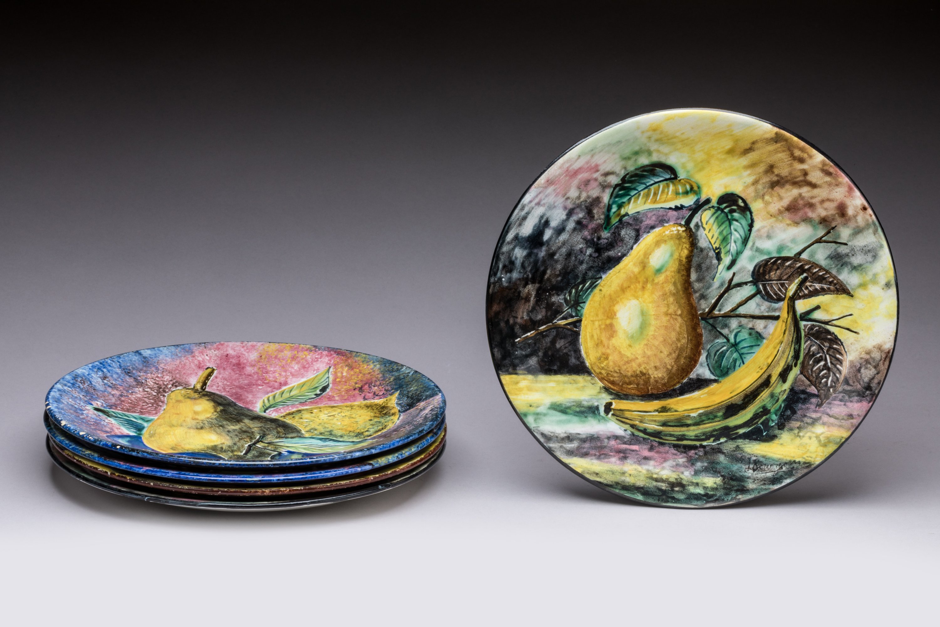 Cinq assiettes et un plat en céramique émaillée.