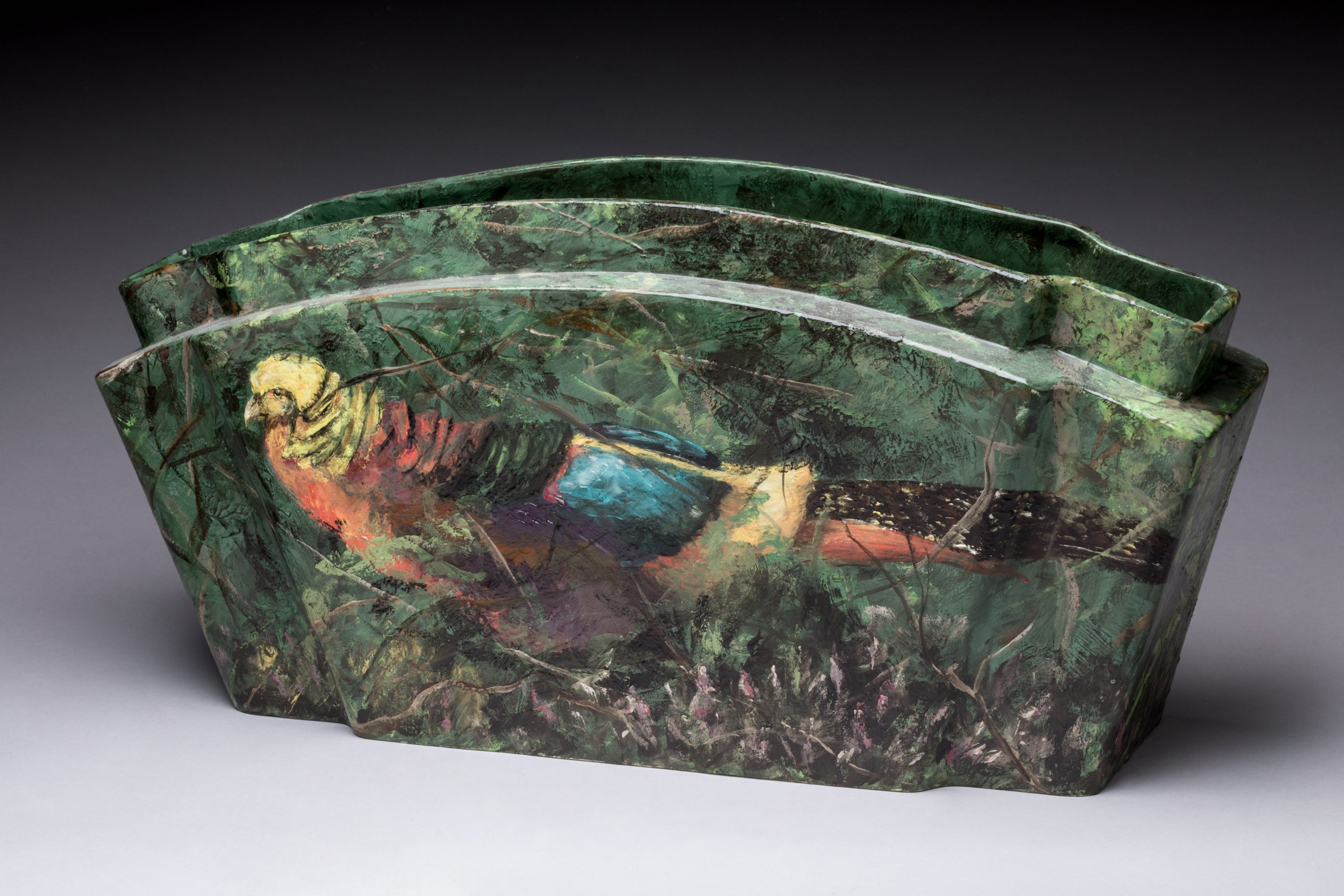 en barbotine émaillée à décor de faisans sur fond de sous-bois.