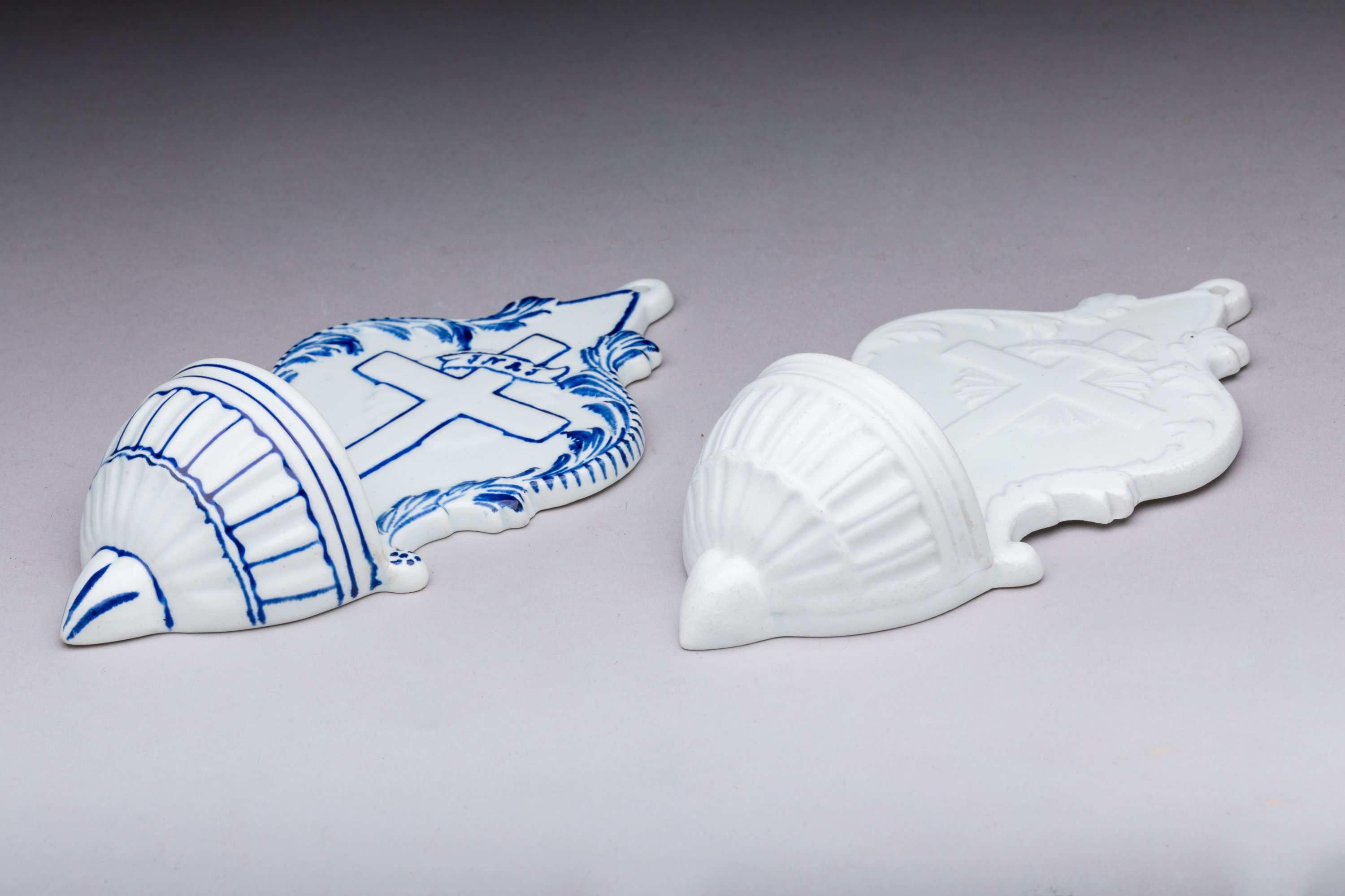 Deux BÉNITIERS aux CRUCIFIXen céramique émaillée l'un monochrome l'autre bleu...