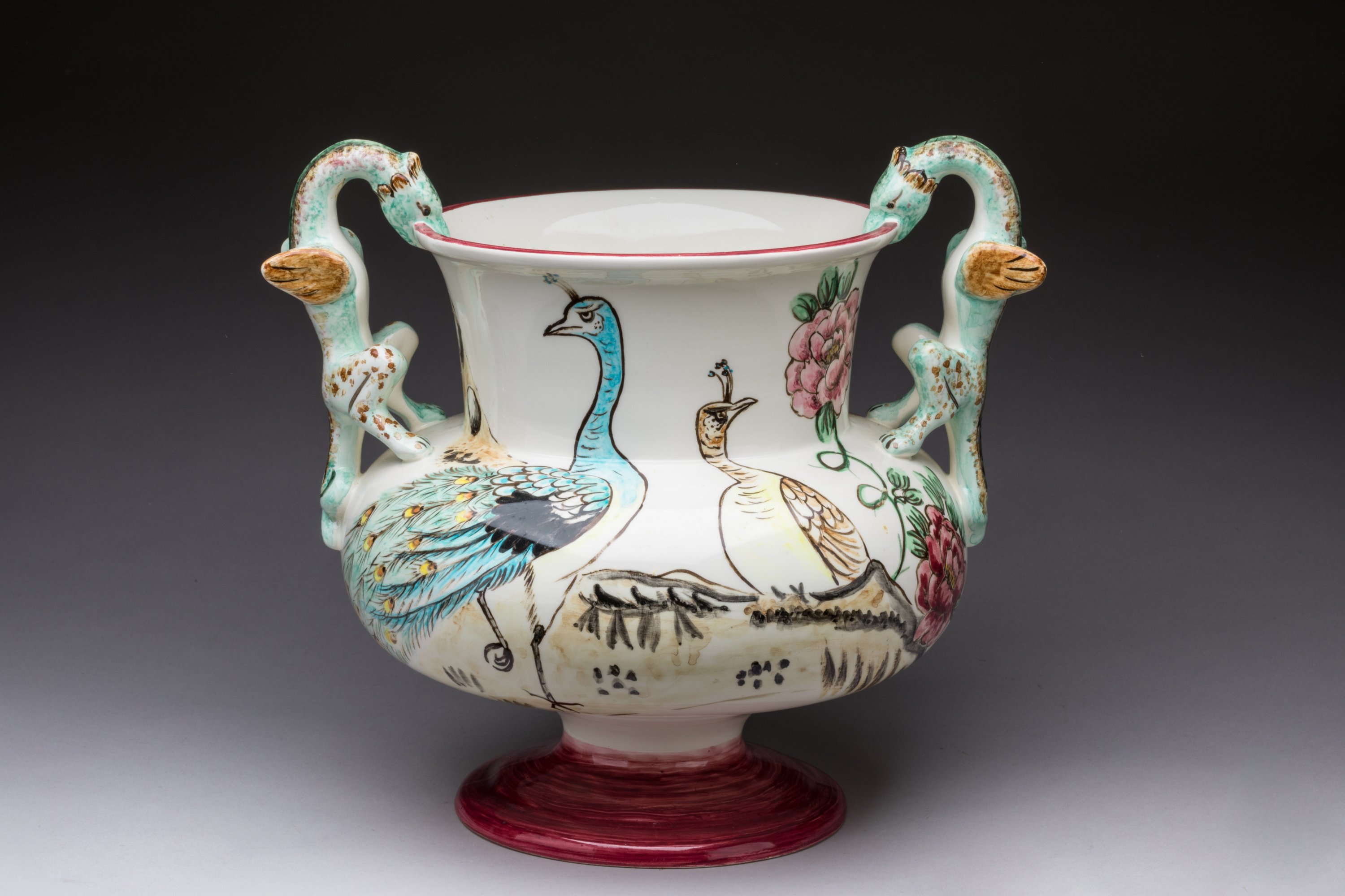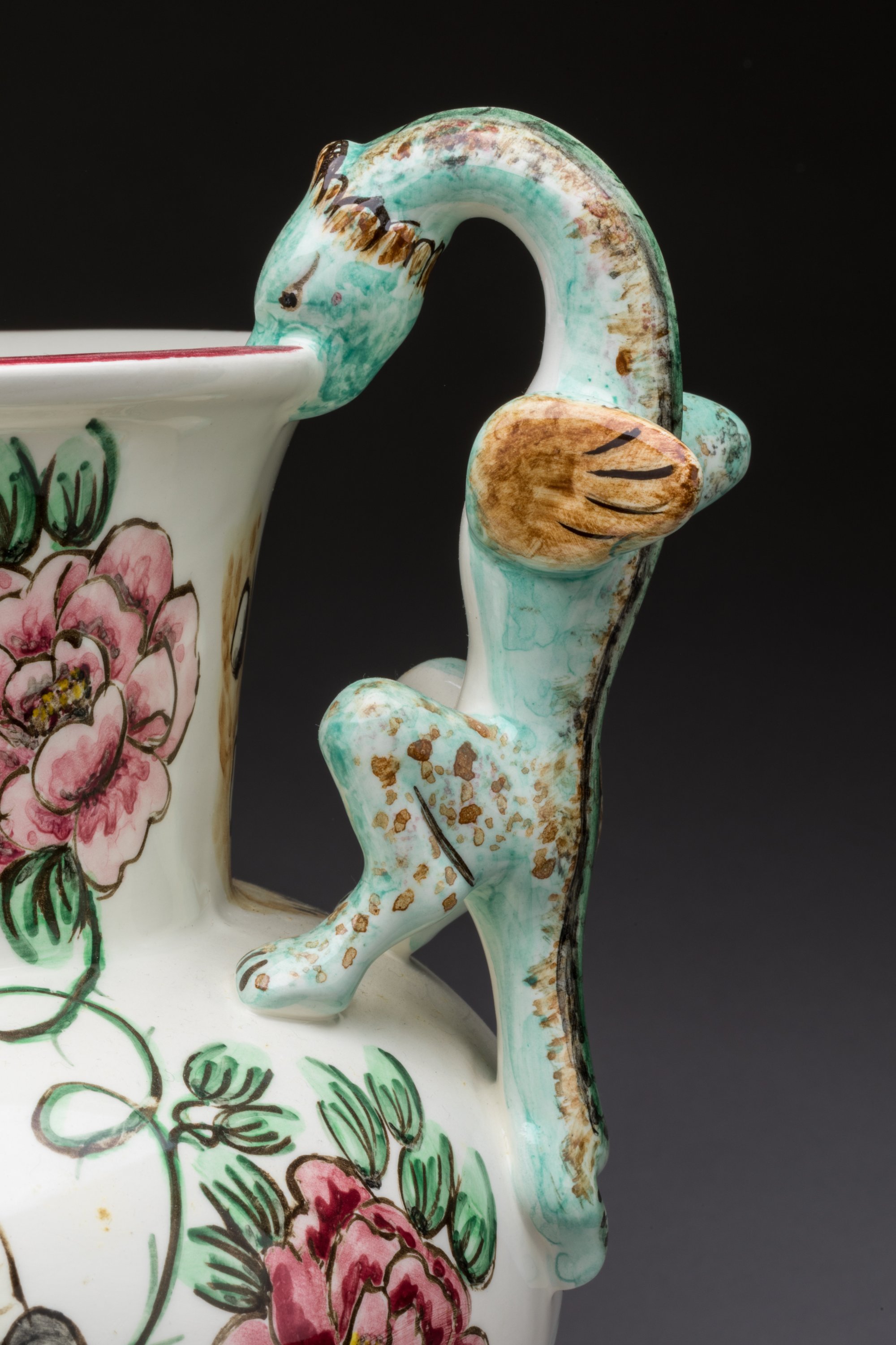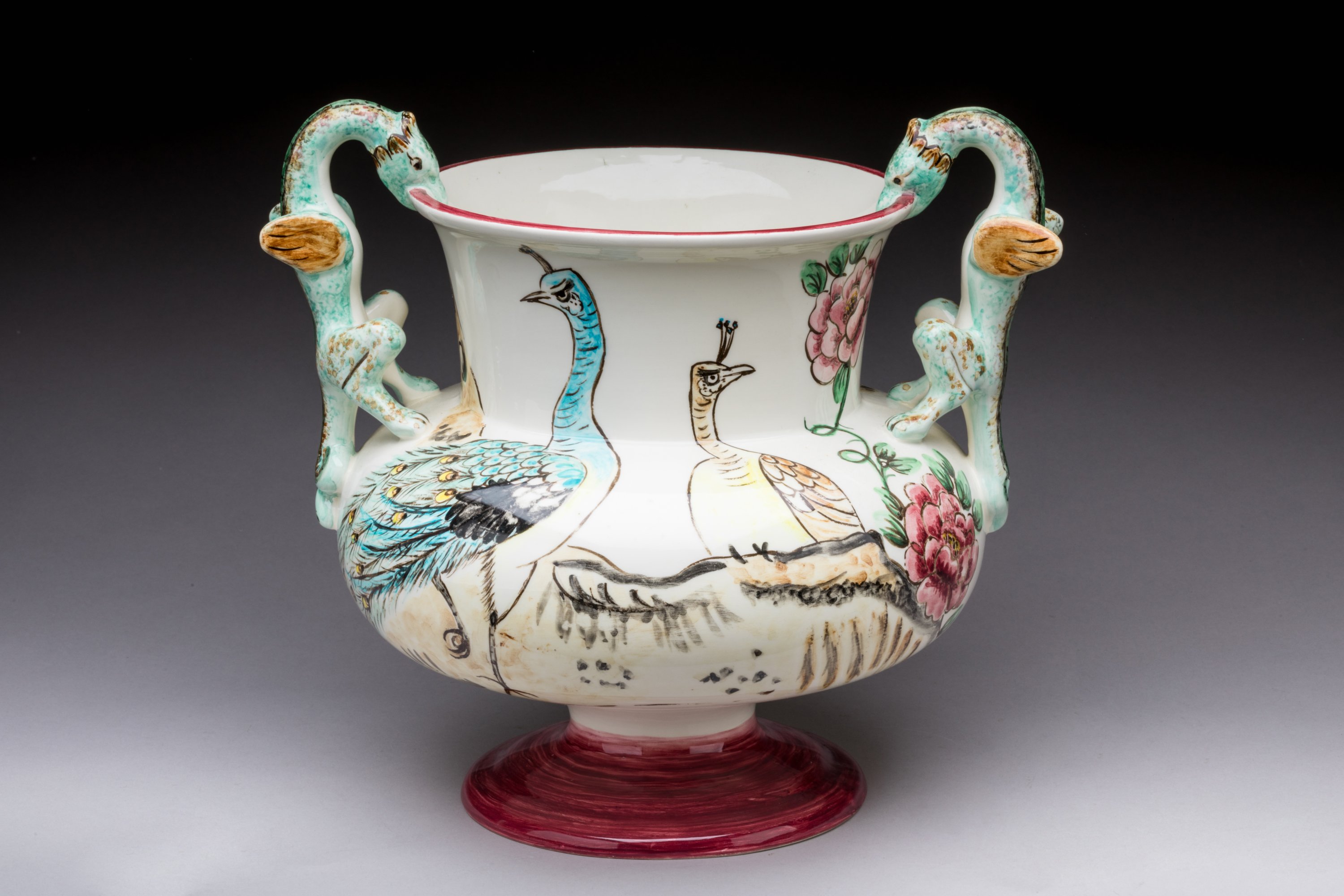 en céramique émaillée, sur piédouche. Le décor peint sur tout le vase dans les tons pastels.