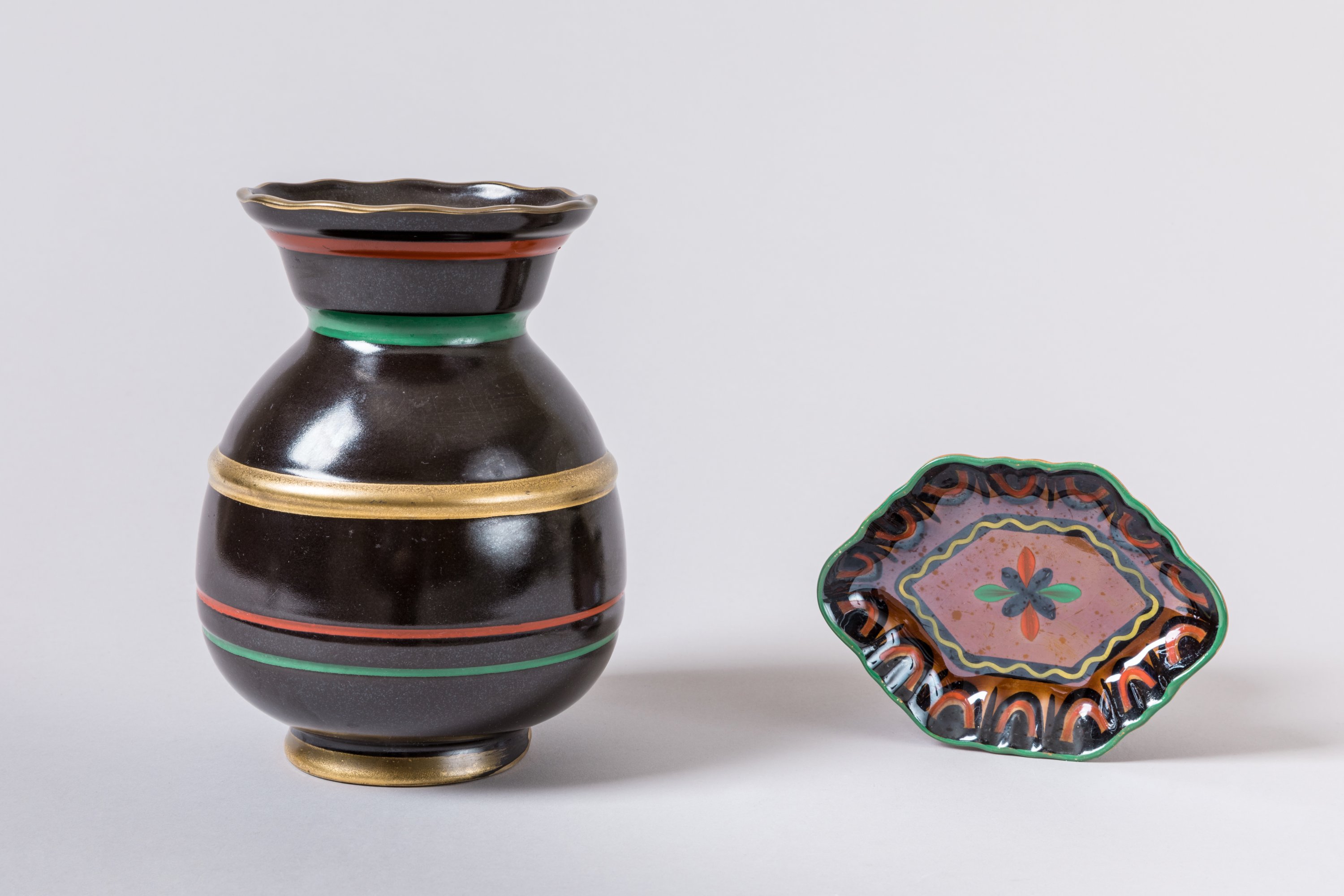 en céramique émaillée à fond noir et bandes rouges et vertes sur fond noir et rehauts d'or.